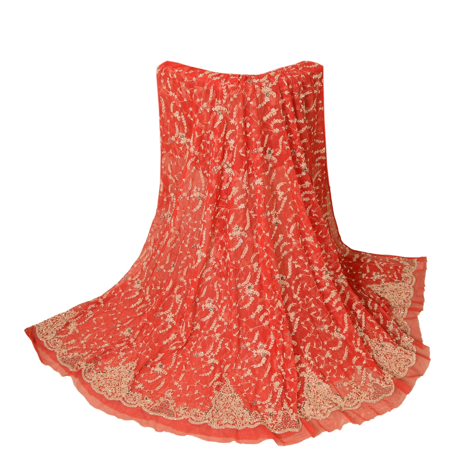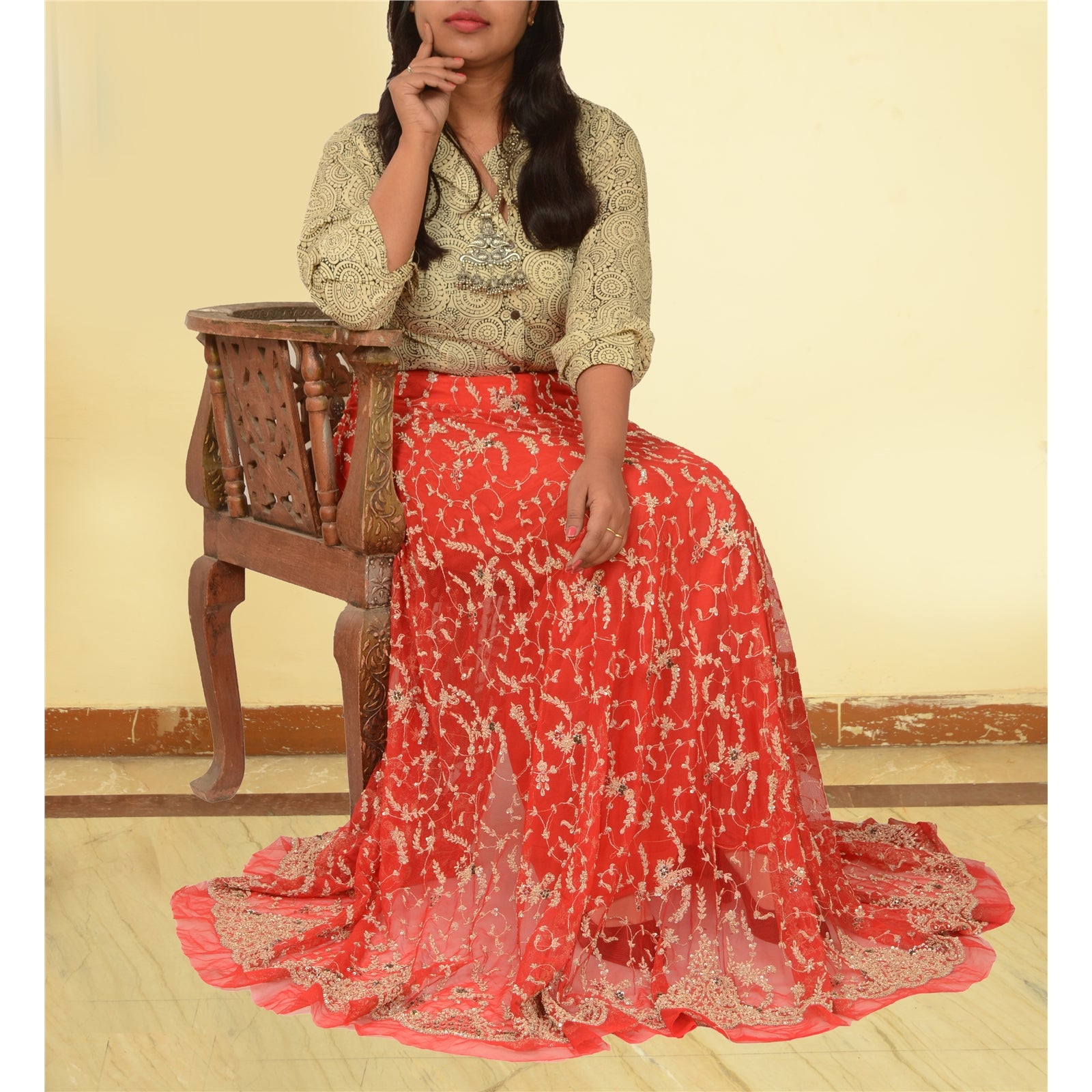 Sanskriti Vintage Red Long Skirt Net Mesh Hand Beaded Unstitched Zardozi Lehenga