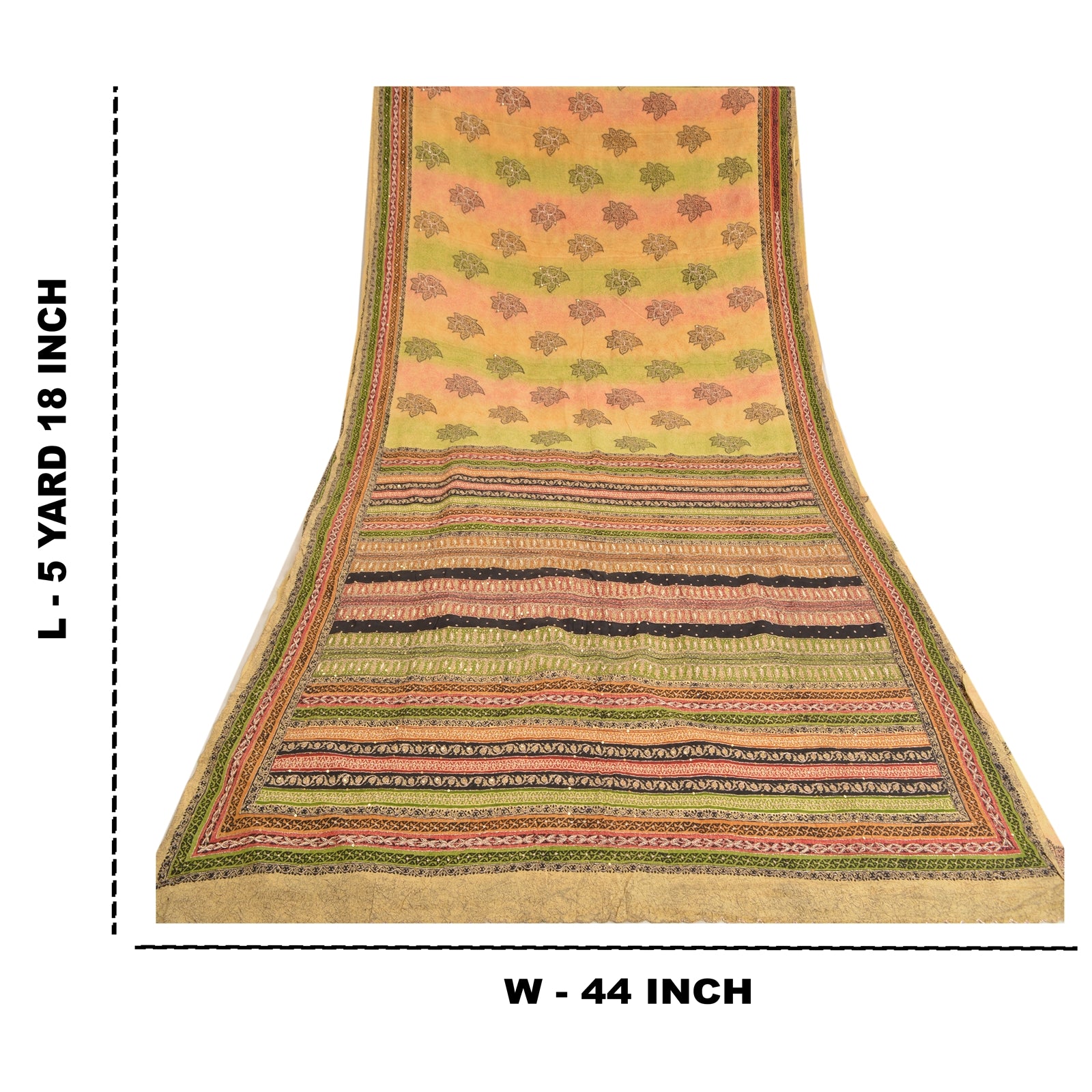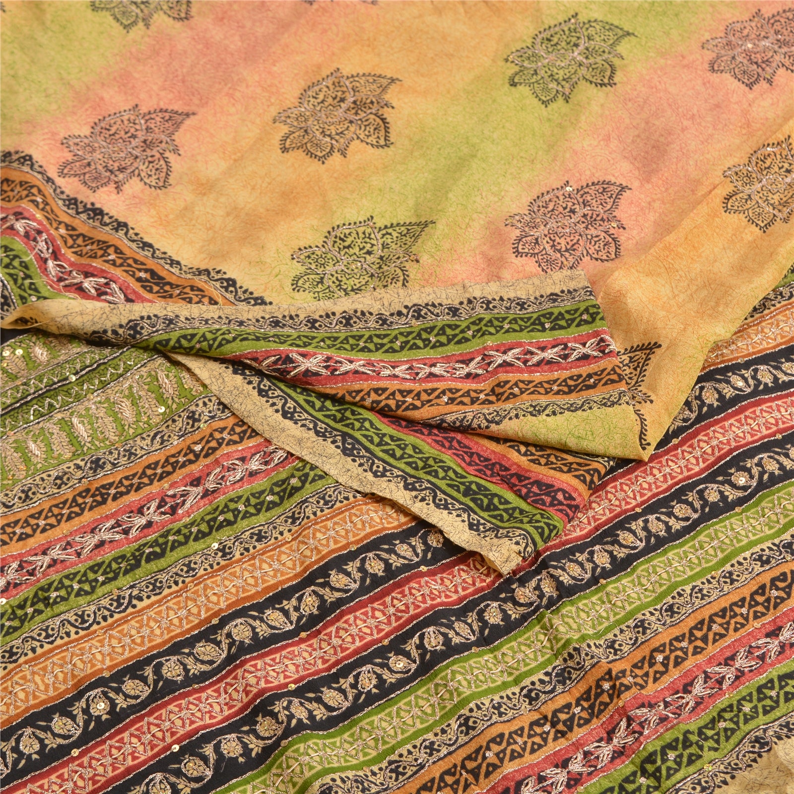 Sanskriti Vintage Sarees Beige Hand Beaded Pure Crepe Silk Printed Sari Sustainable Fabric