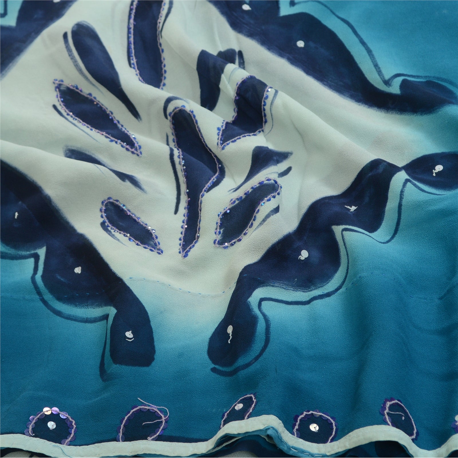 Sanskriti Vintage Sarees Blue Hand Beaded Pure Georgette Silk Sari Craft Sustainable Fabric