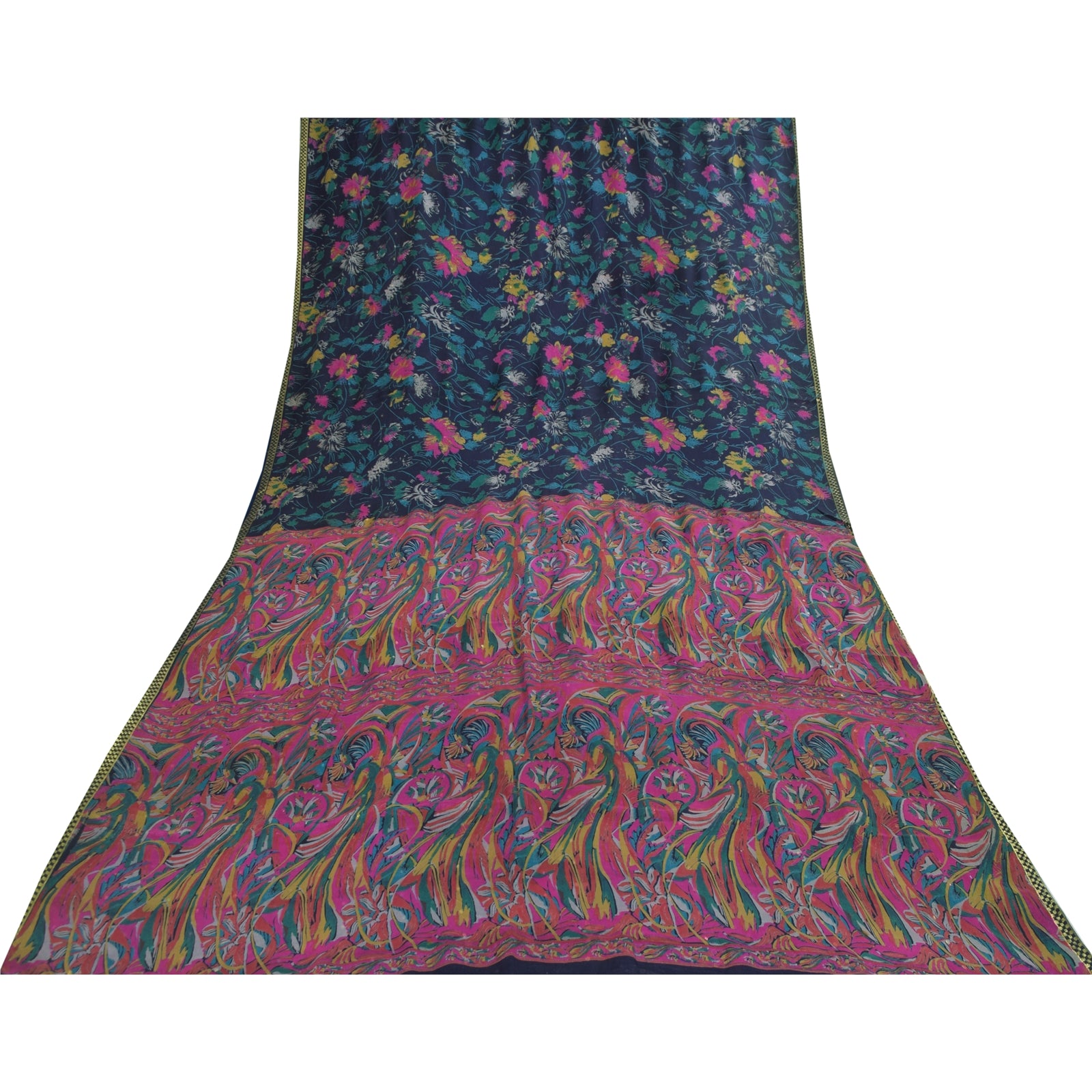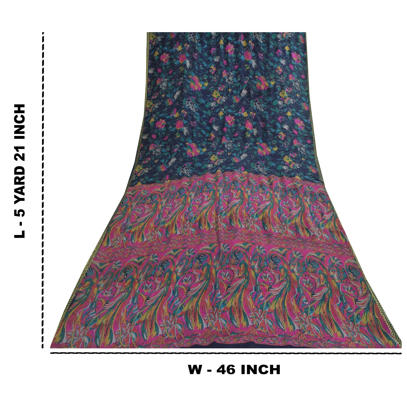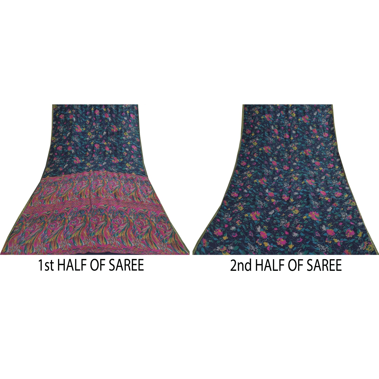 Sanskriti Vintage Sarees Blue Pure Silk Printed Woven Sari 5+yd Craft Fabric