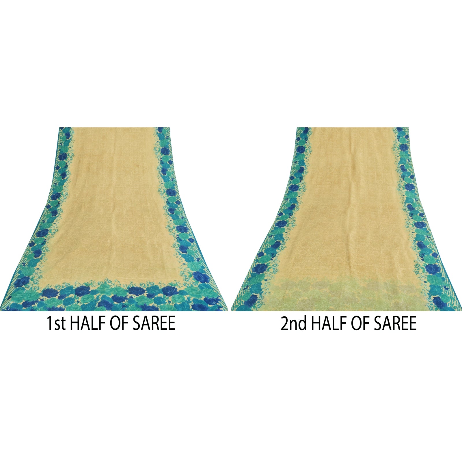 Sanskriti Vintage Sarees Cream Indian Pure Silk Printed Sari 5+yd Craft Fabric