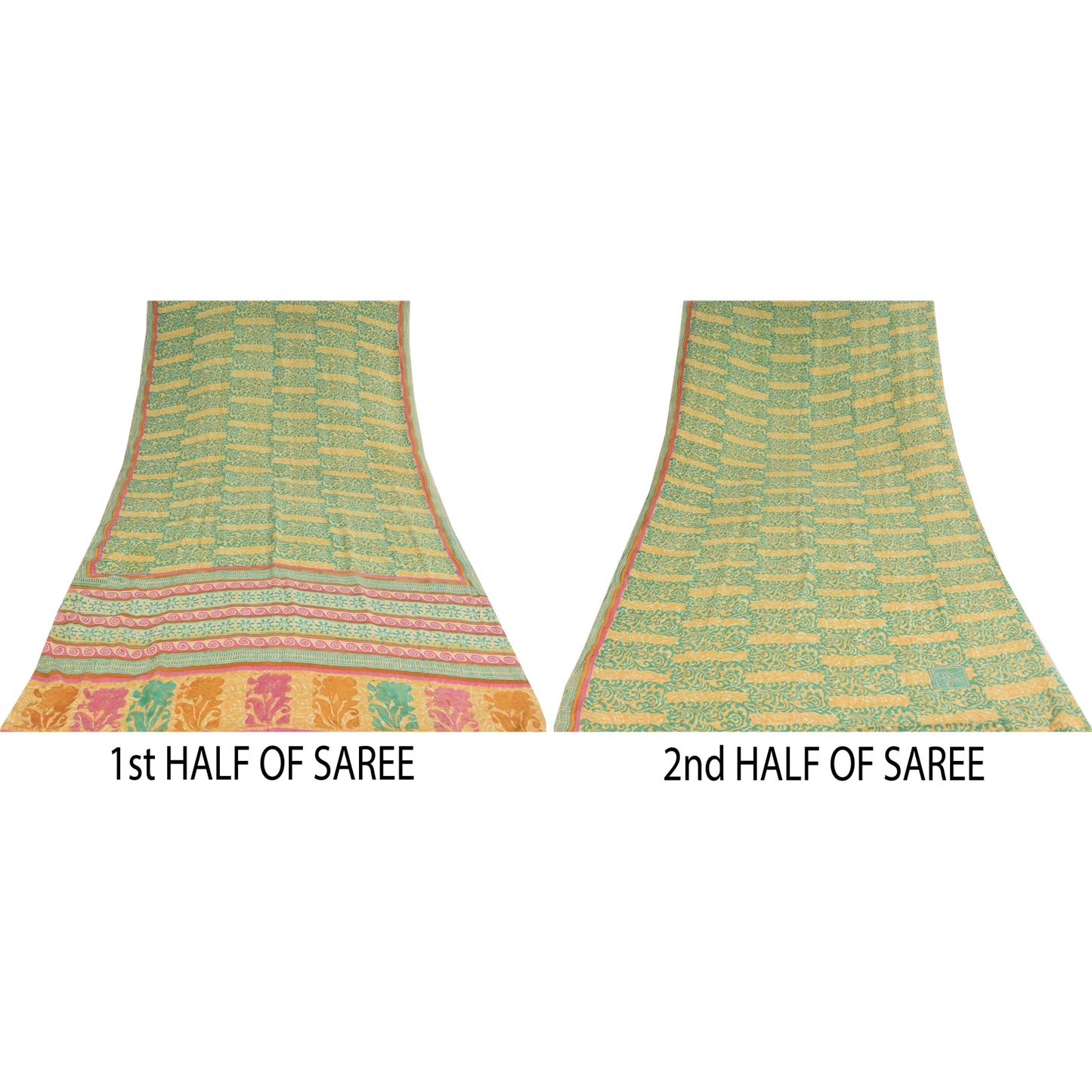 Sanskriti Vintage Sarees Green/Cream Hand Block Printed Pure Crepe Sari Sustainable Fabric