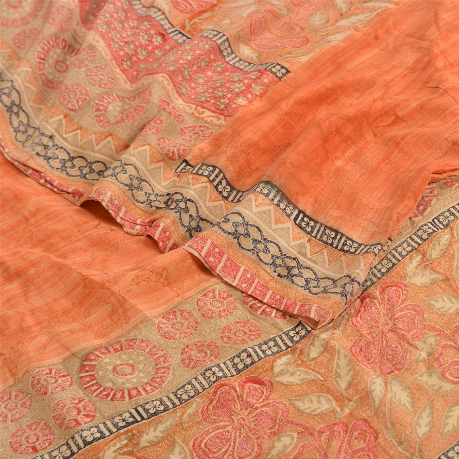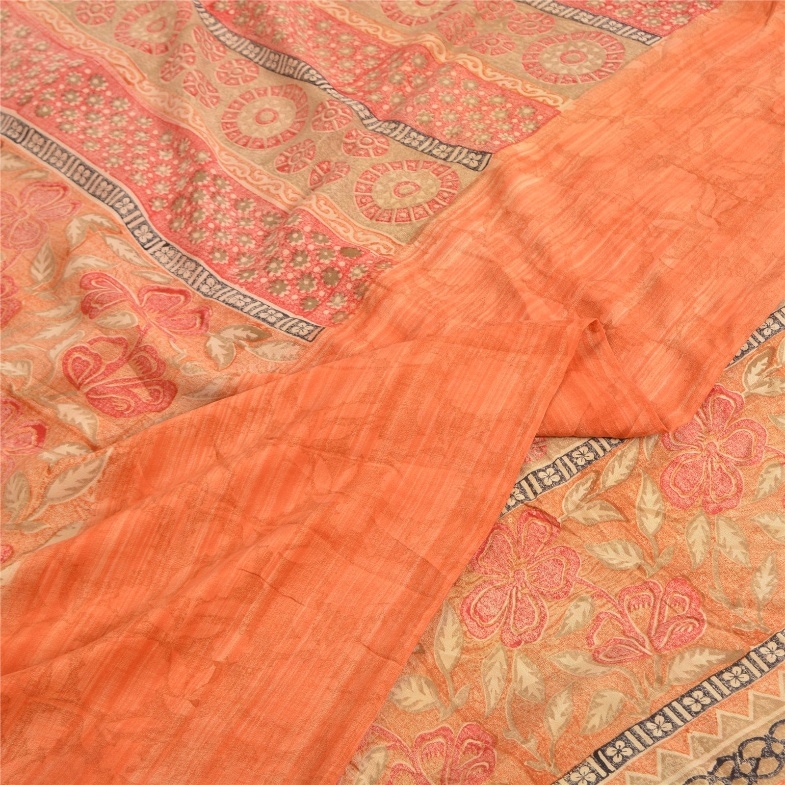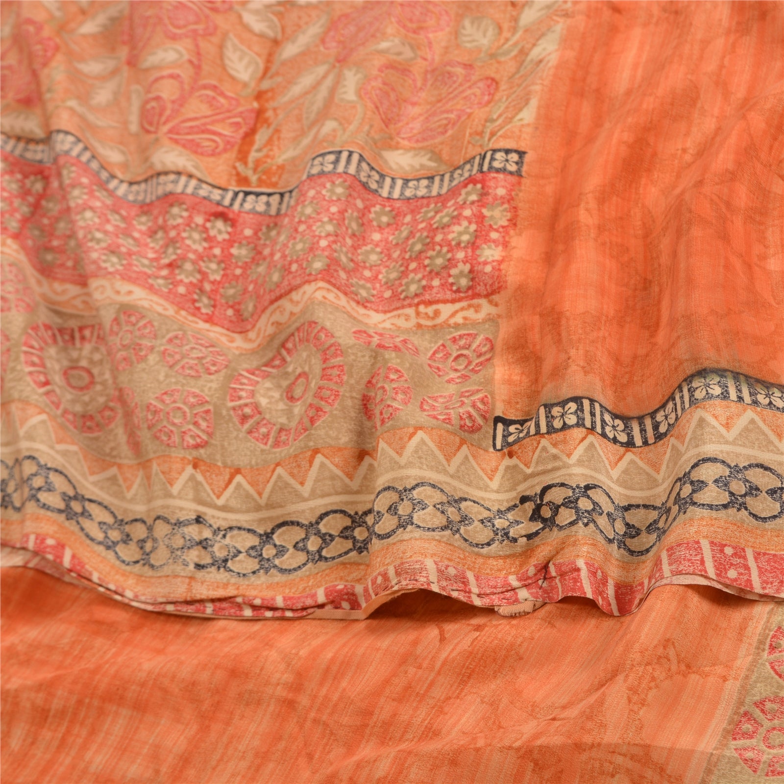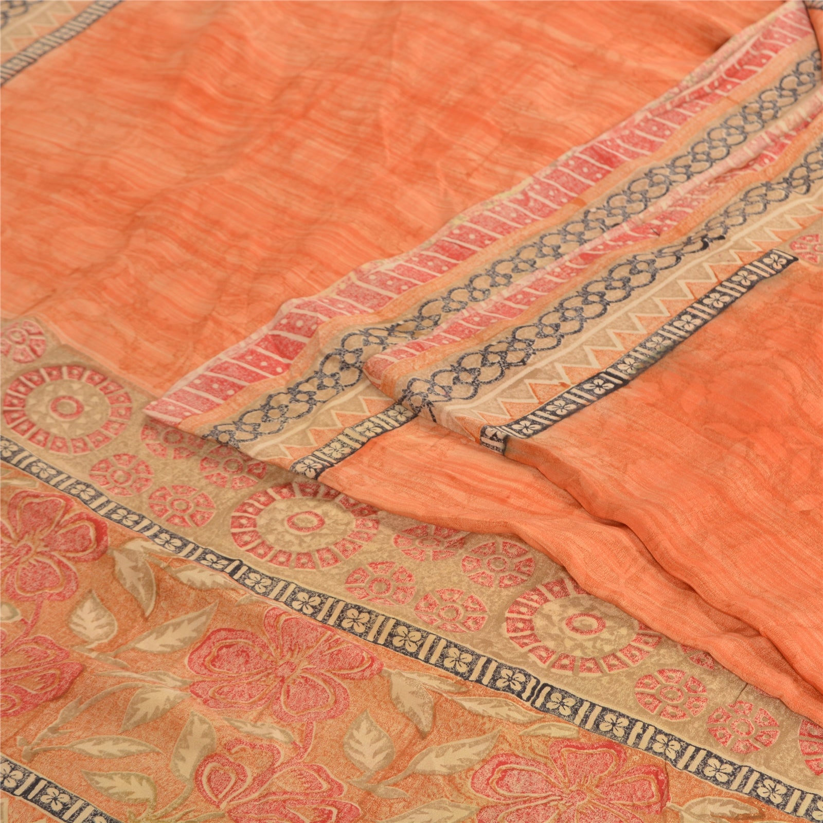 Sanskriti Vintage Sarees Peach & Red Pure Crepe Silk Printed Sari Craft Sustainable Fabric