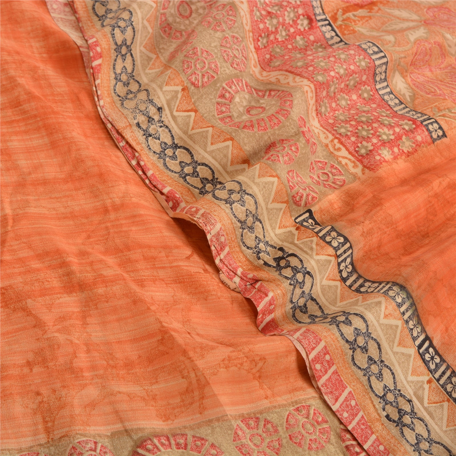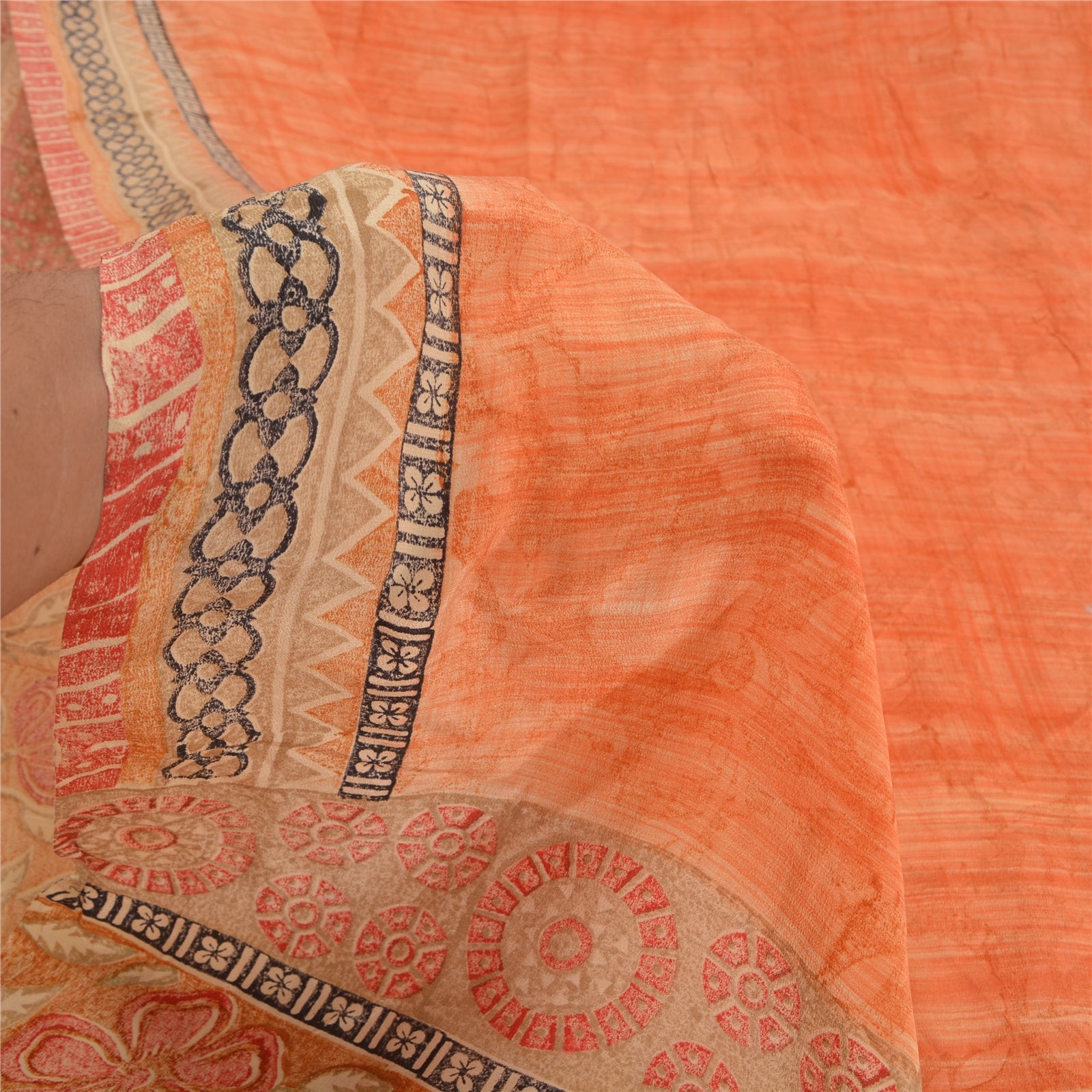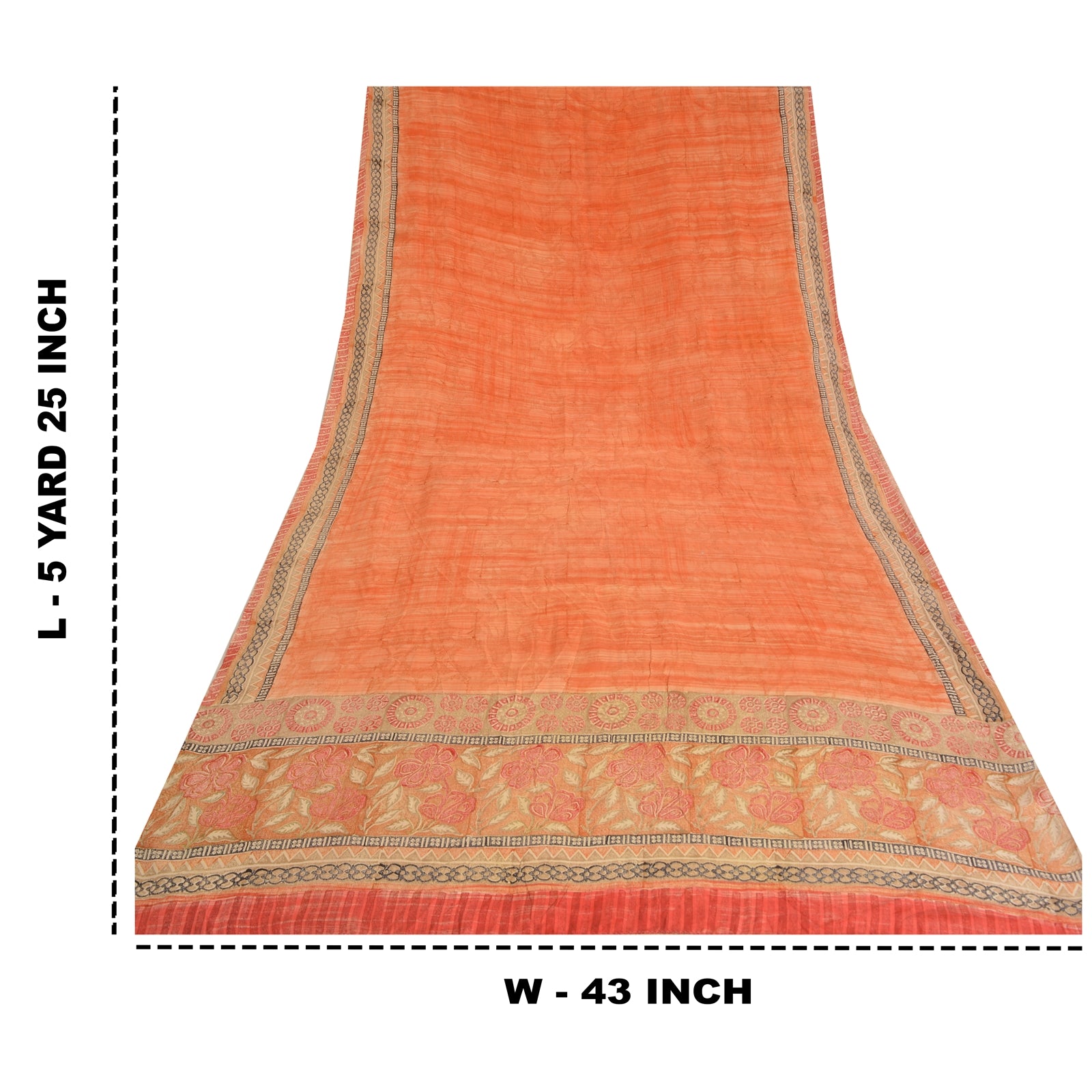 Sanskriti Vintage Sarees Peach & Red Pure Crepe Silk Printed Sari Craft Sustainable Fabric