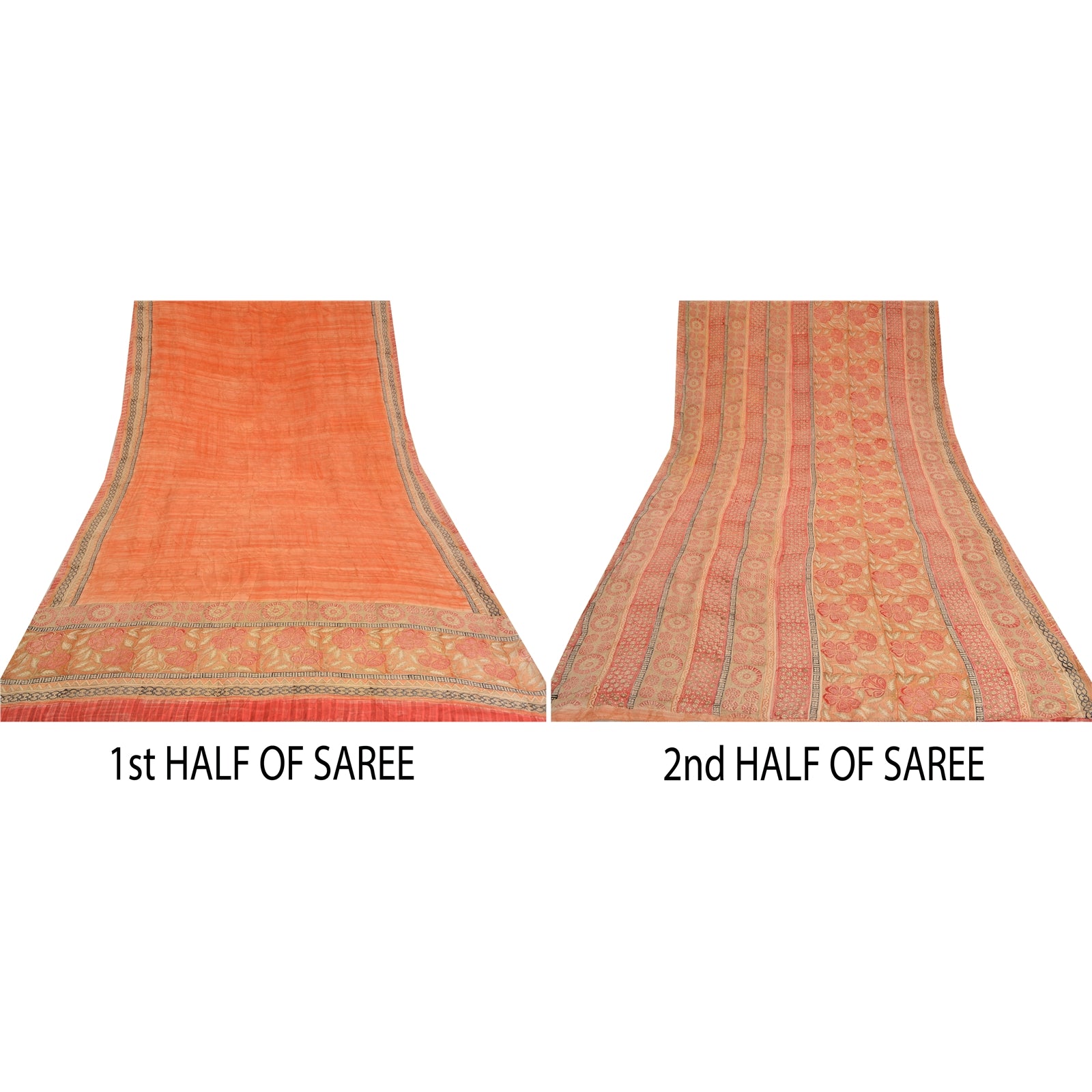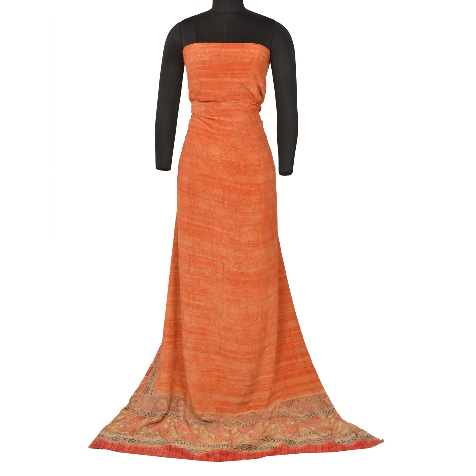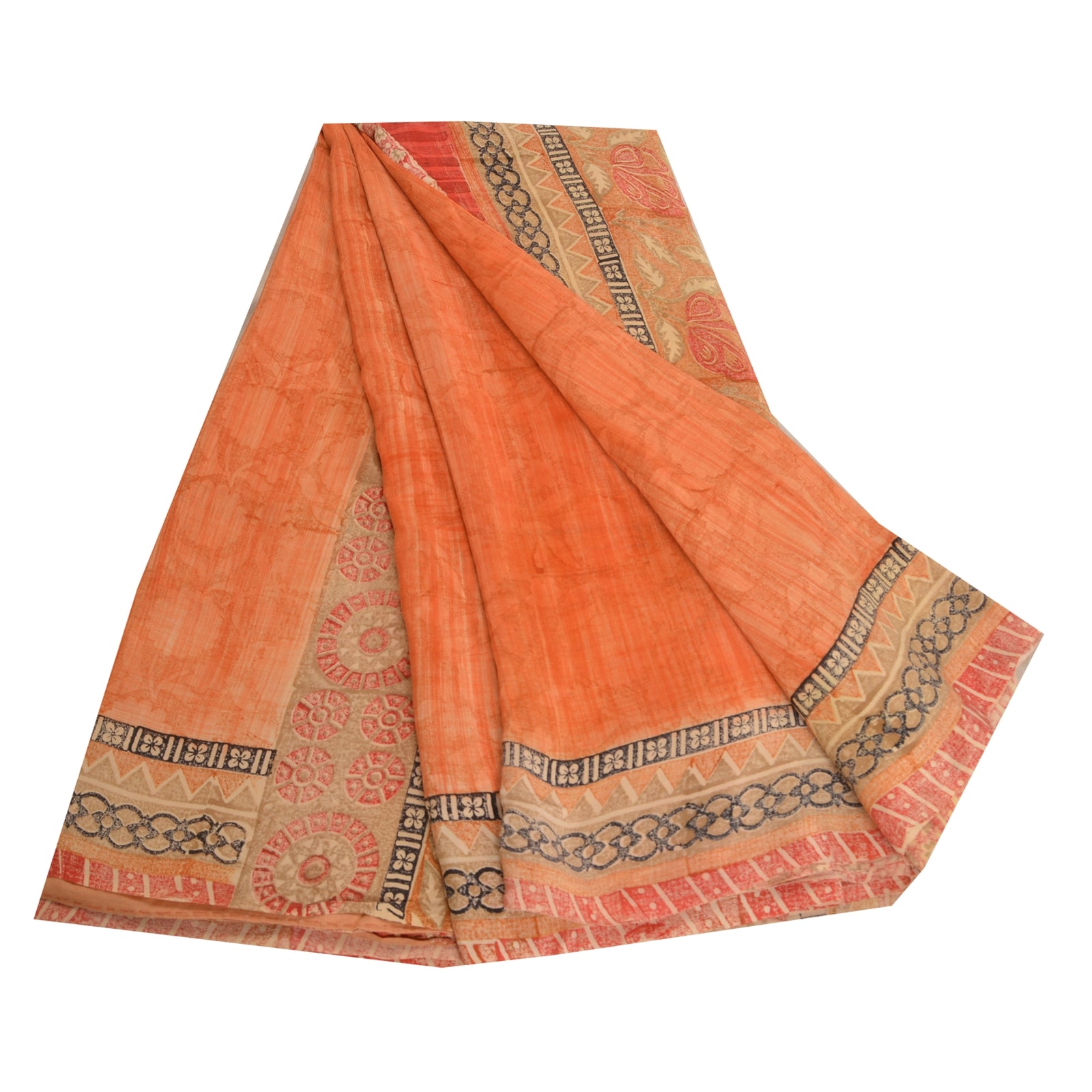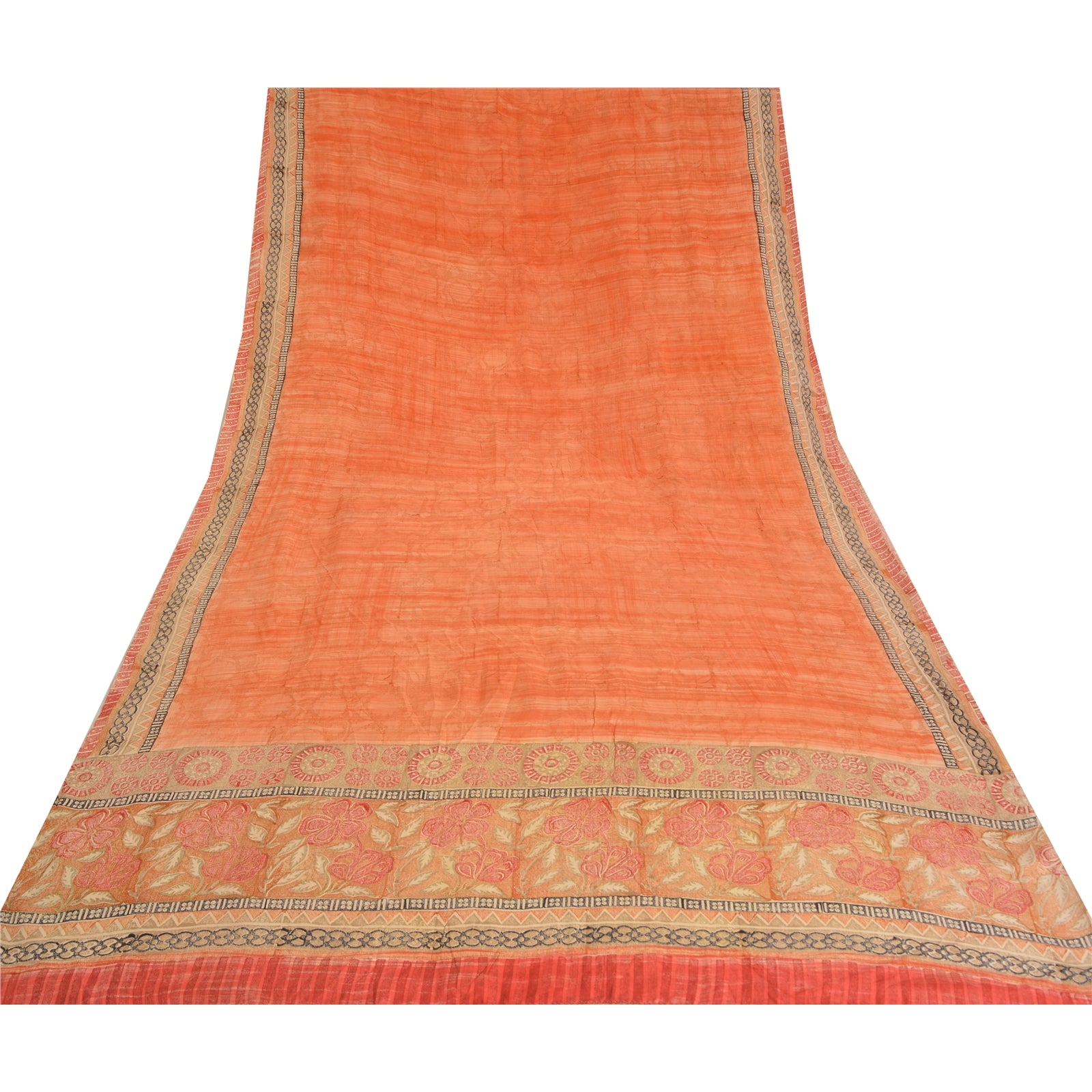 Sanskriti Vintage Sarees Peach & Red Pure Crepe Silk Printed Sari Craft Sustainable Fabric