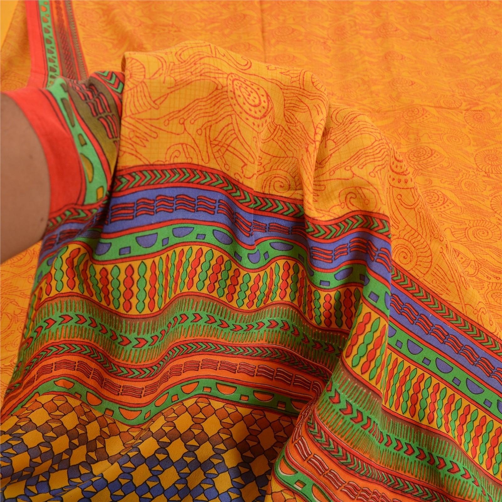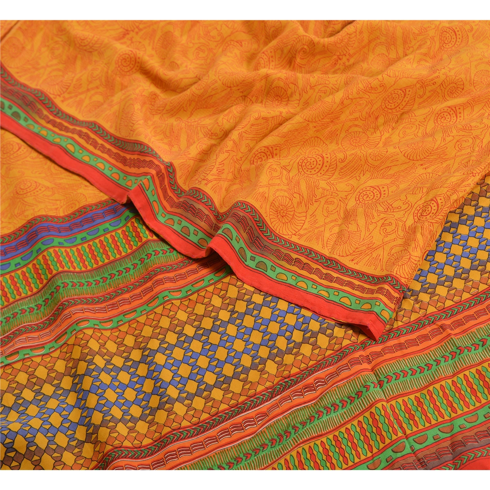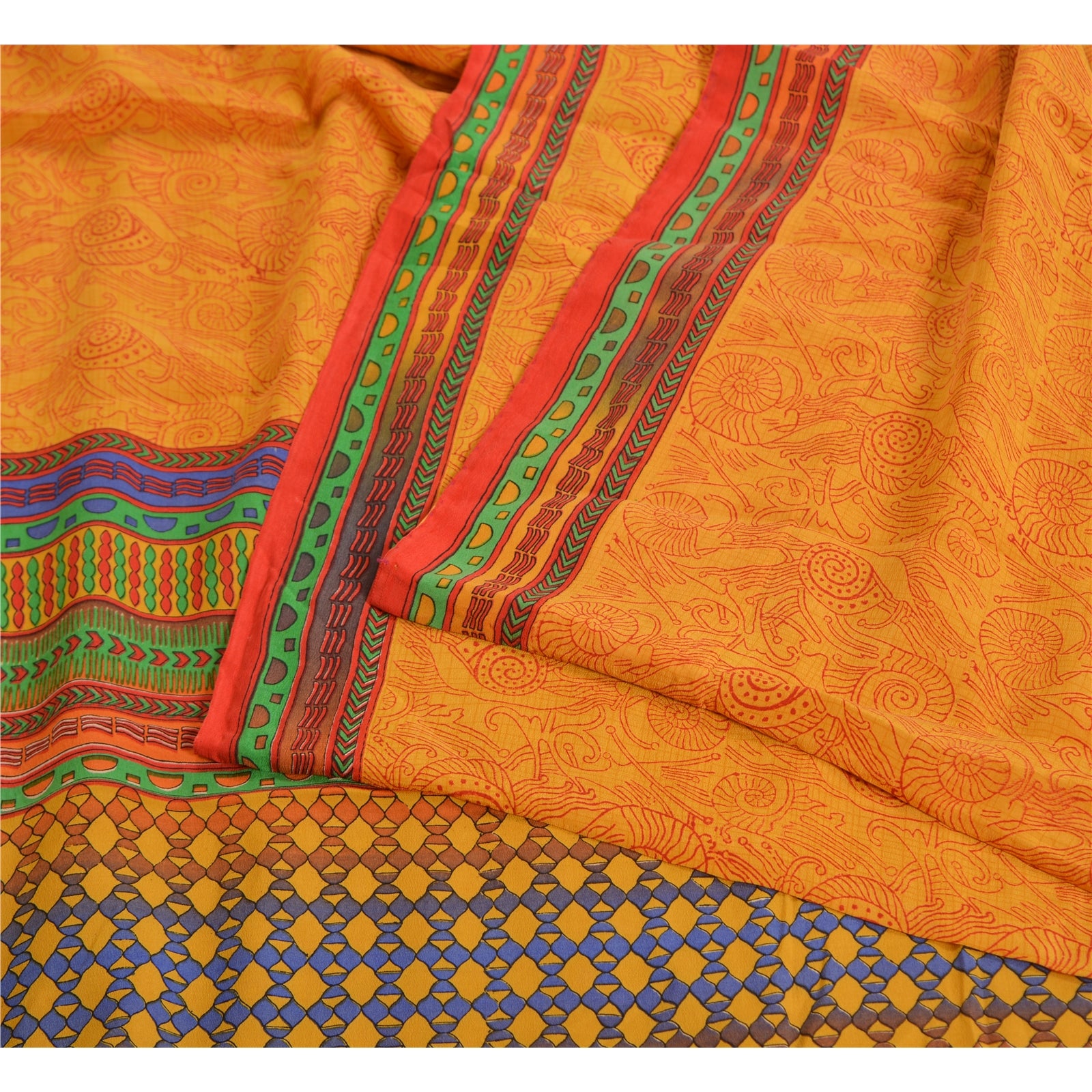 Sanskriti Vintage Sarees Yellow Pure Crepe Silk Printed Sari Floral Craft Sustainable Fabric