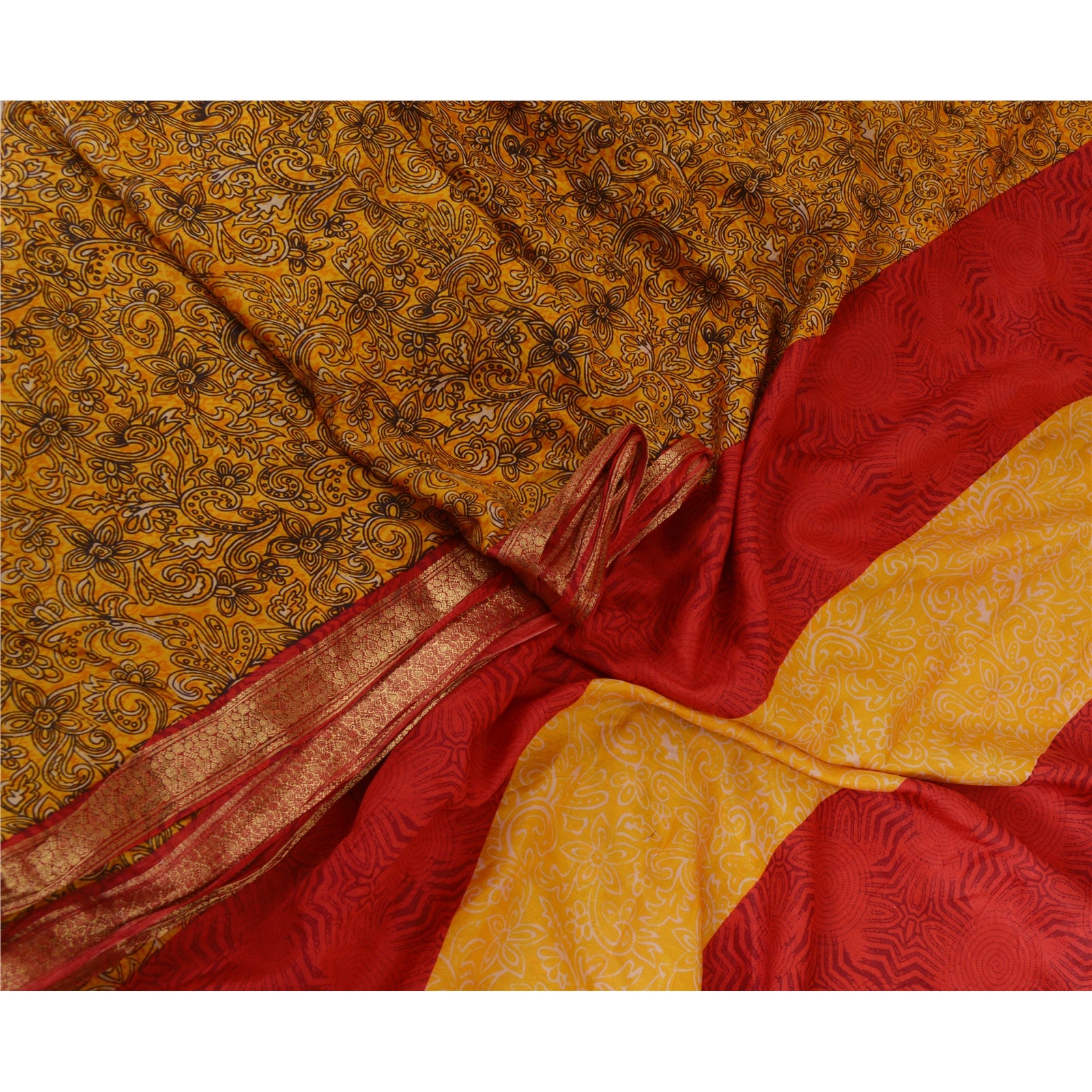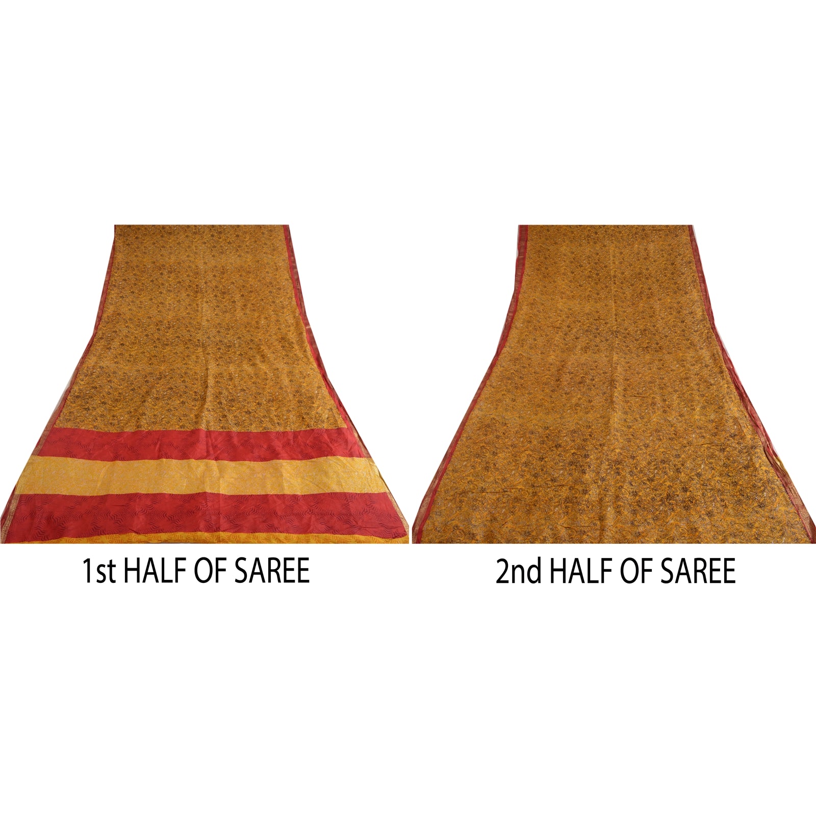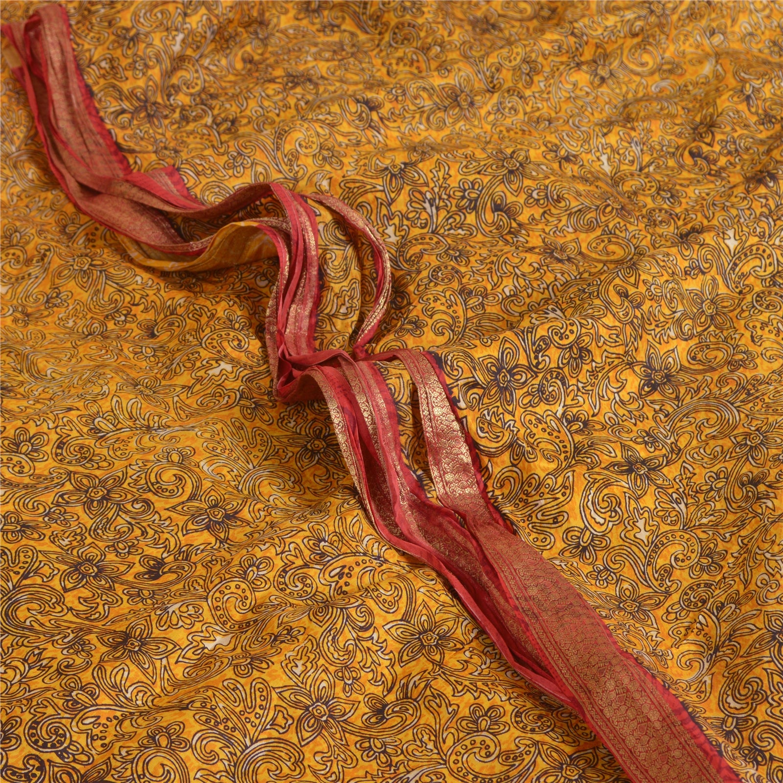 Sanskriti Vintage Sarees Yellow Zari Border Pure Silk Sari Printed Craft Sustainable Fabric