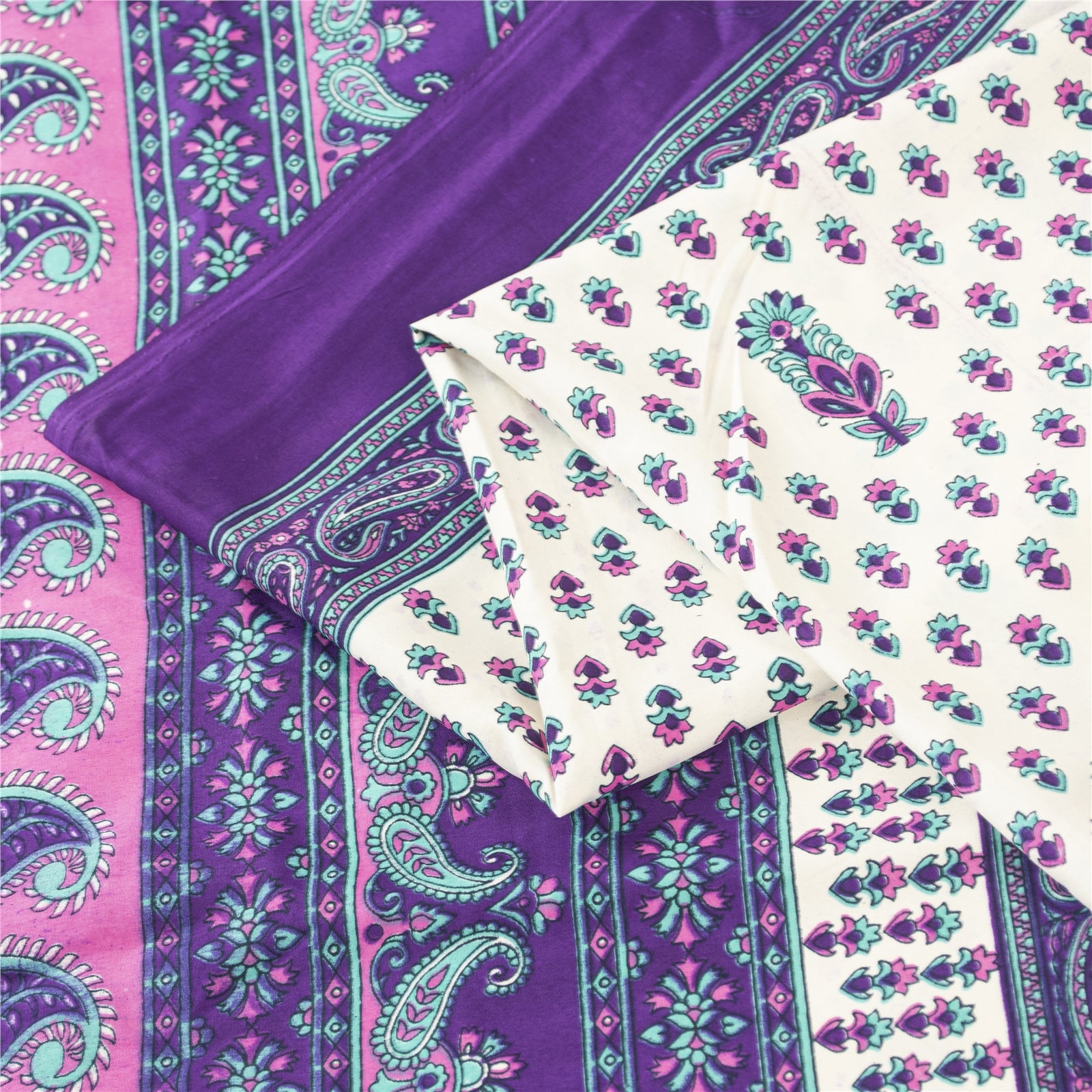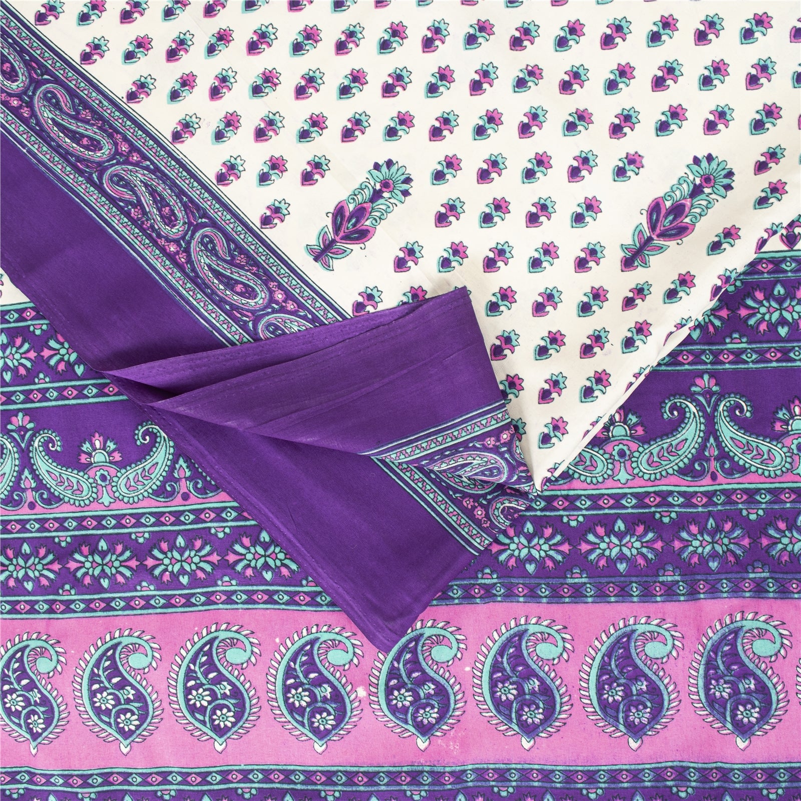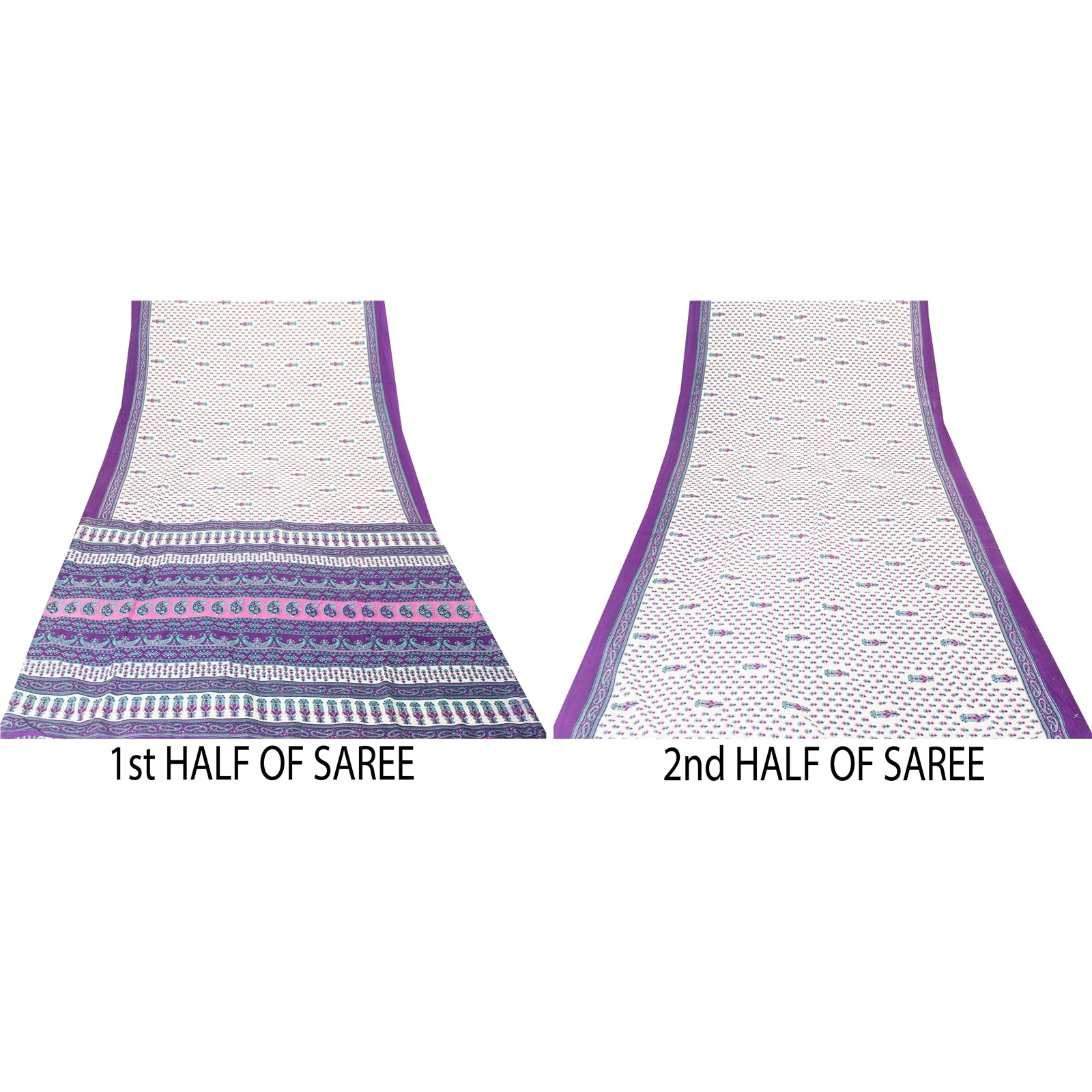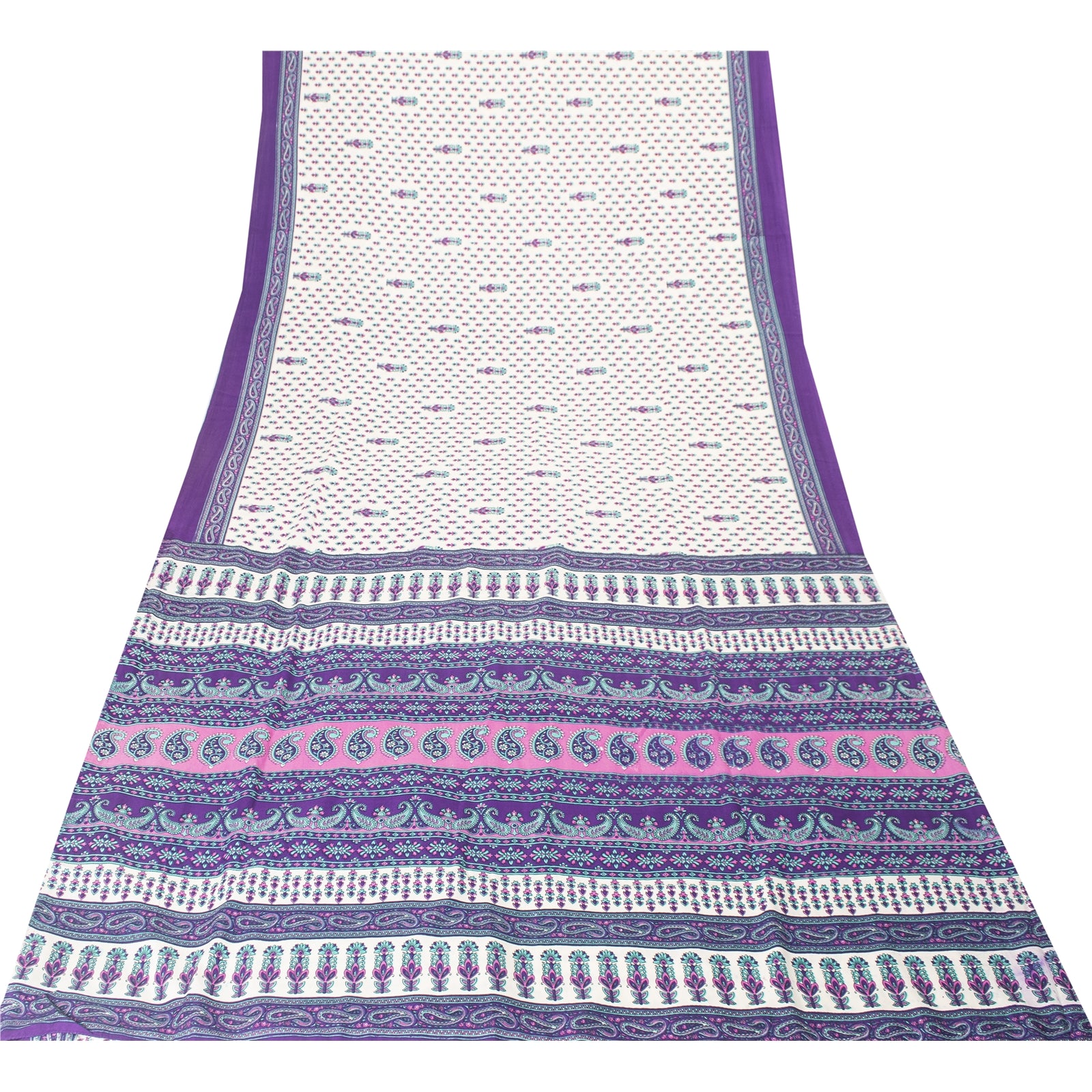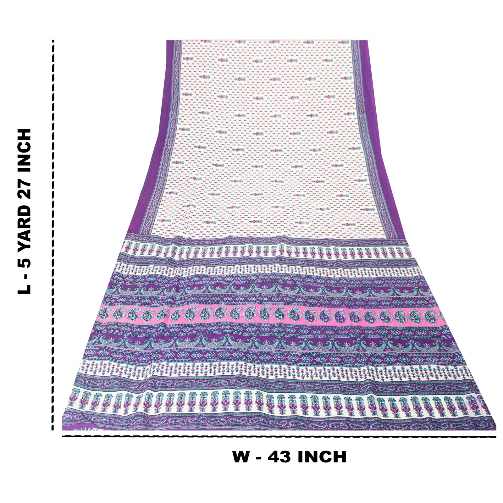 Sanskriti Vintage White Saree Moss Crepe Floral Printed Craft Fabric 5 Yard Sari