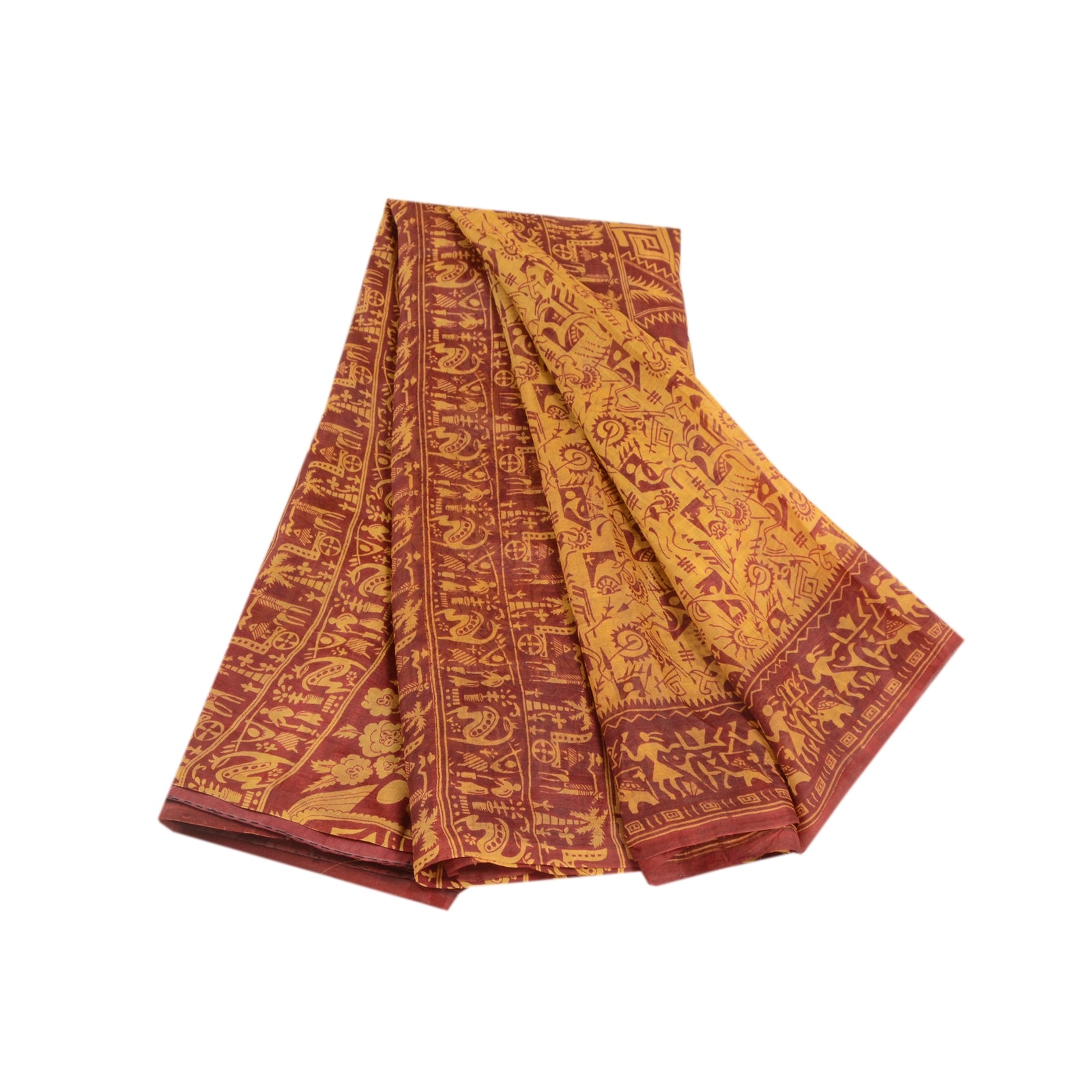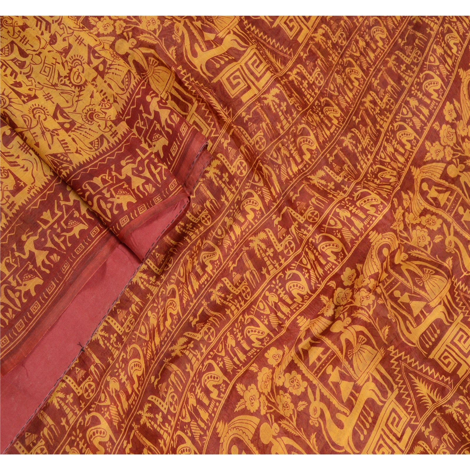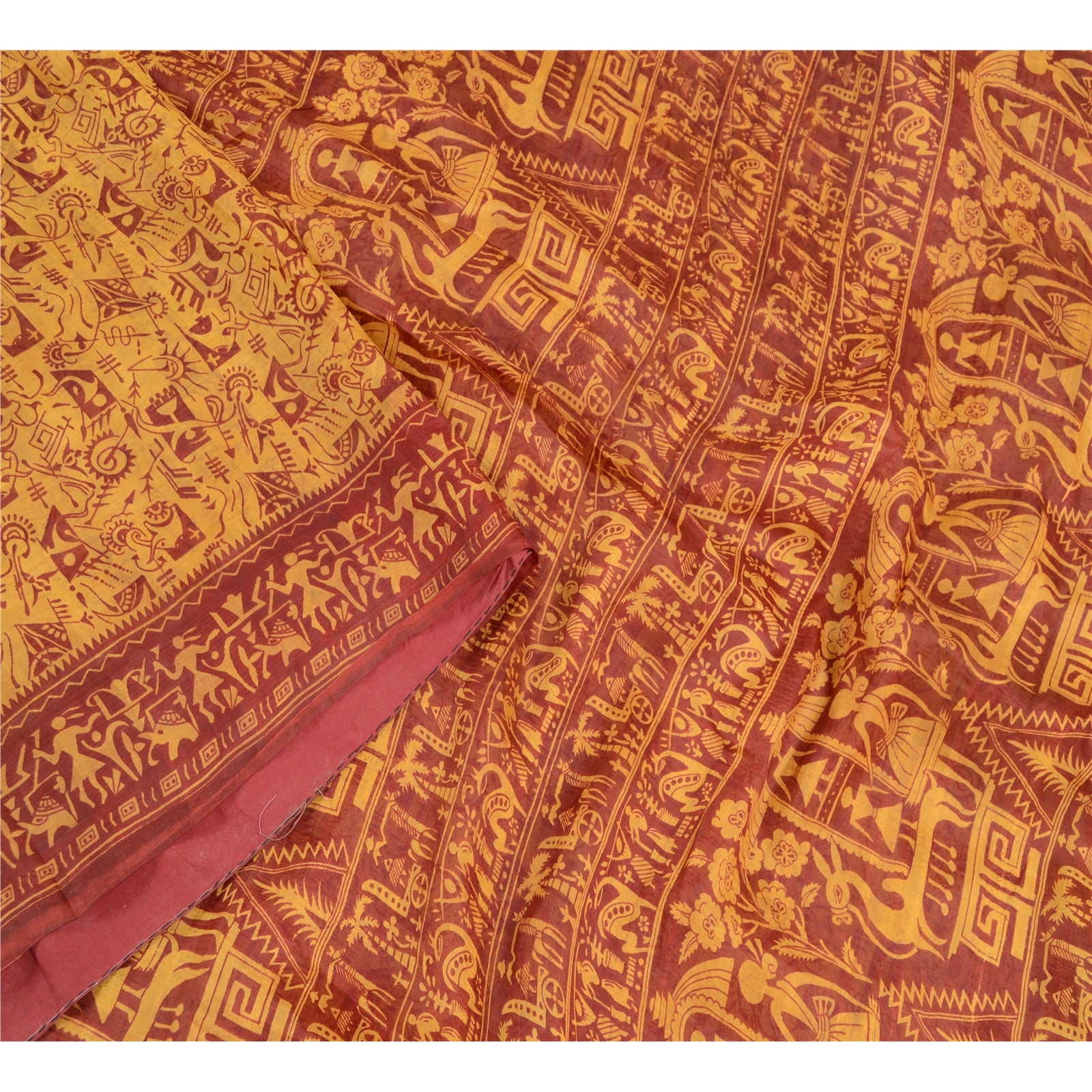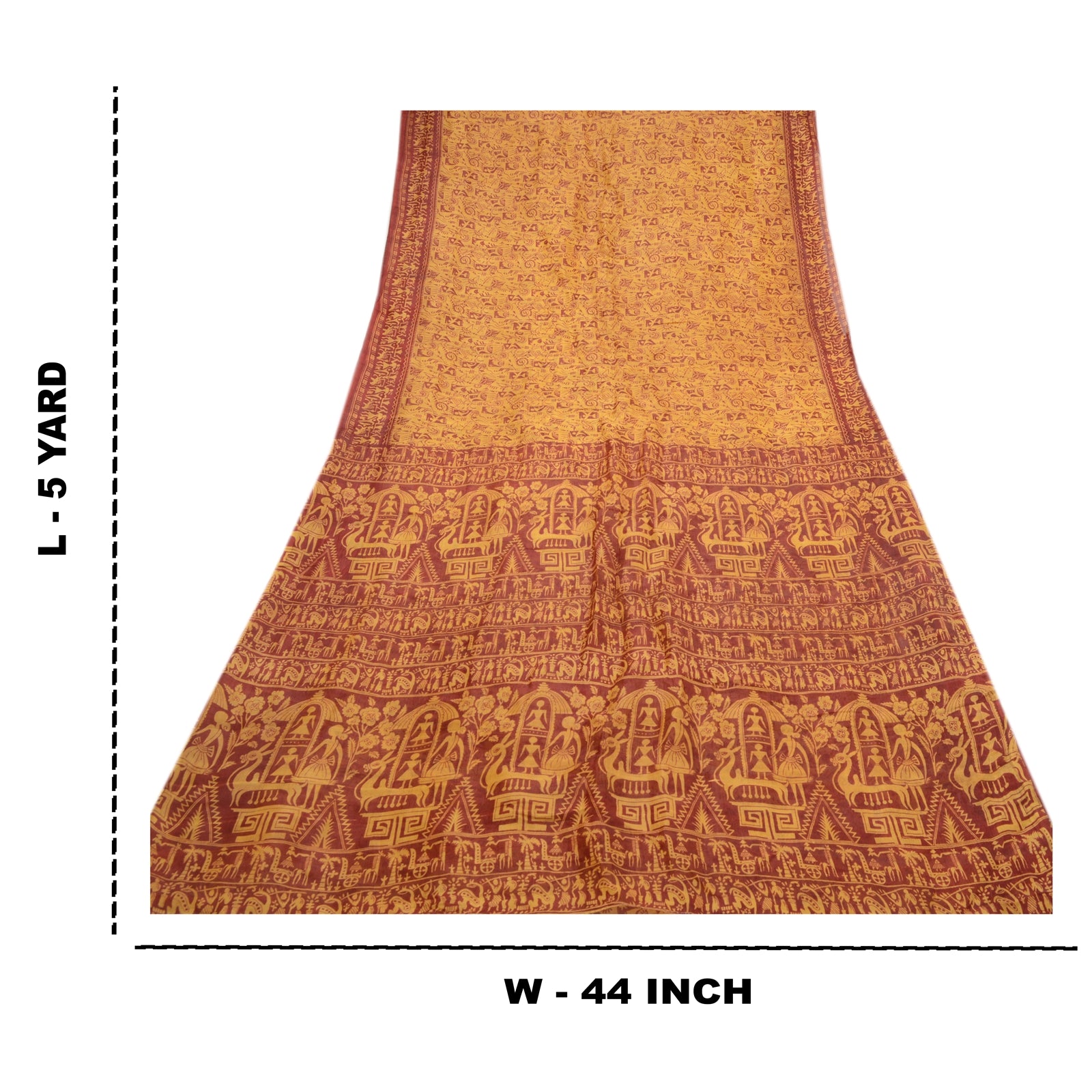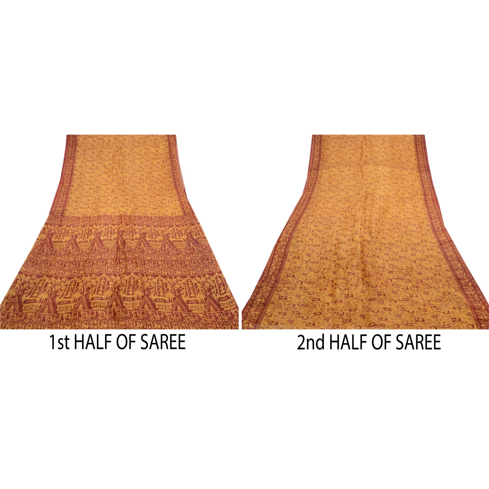 Beautiful yellow & red colored pure silk warli art printed saree. Pallu & border has printed dipicting life of tribal human design. Similar design in center part of saree.. What is special about this saree? Fabulous design is really enhancing the beauty of the saree.This unique vintage saree can be used for various crafting ideas even if you don't want to use it as a sari. Design a dress, use it as window,dressing, upholstery, sarongs, throw, dress making and table linen much more. Let your creative juices flow and use this decorated Sustainable Fabric in multiple fashion.. Please note - Buyers from Australia are required to pay postage. Registered air mail to Australia is temporarily suspended due to the pandemic. Once it goes back to normal we'll revert to free shipping. For now, we are using Aramex and DHL to ship orders. These services are expensive but faster compared to regular mail. Thank you for your support. If you are buying in bulk we will refund whatever excess is left. Contact us after that purchase. For USA buyers - Single item ships via registered air mail, buy 1 more to get FedEx.