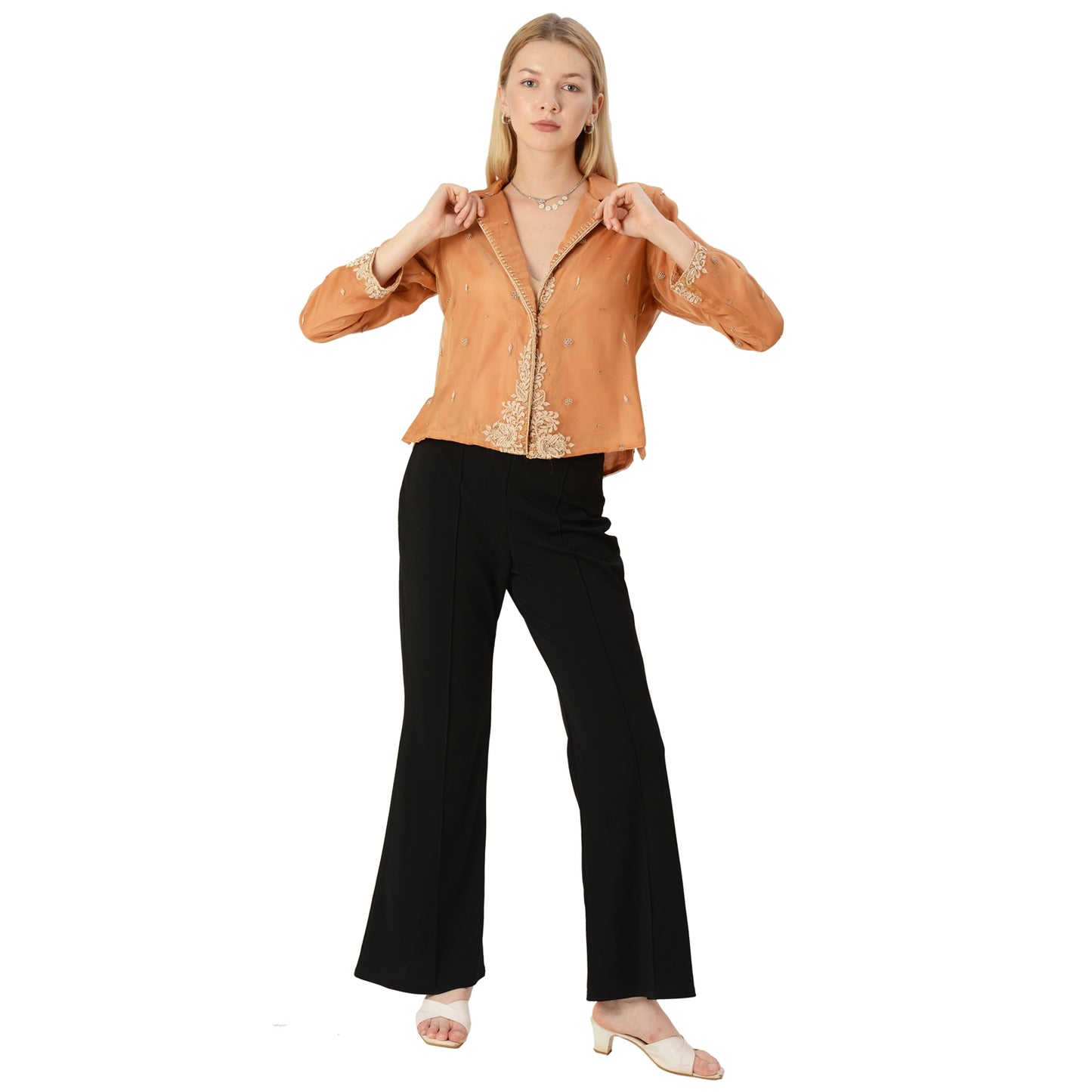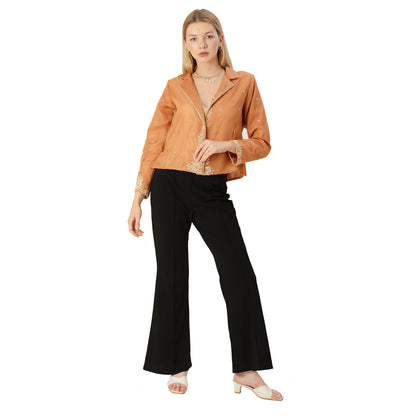 Introducing our upcycled short blazer, a captivating embodiment of sustainable fashion. Crafted from a net mesh Sustainable Fabric in a bold orange hue, its coarse texture lends a unique charm to the piece. Adorned with intricate zardozi work, this blazer exudes elegance and beauty. Shoulder pads enhance its structure while maintaining a contemporary edge. Each detail reflects a harmonious blend of artistry and consciousness, making this blazer a statement of individual style and environmental awareness.