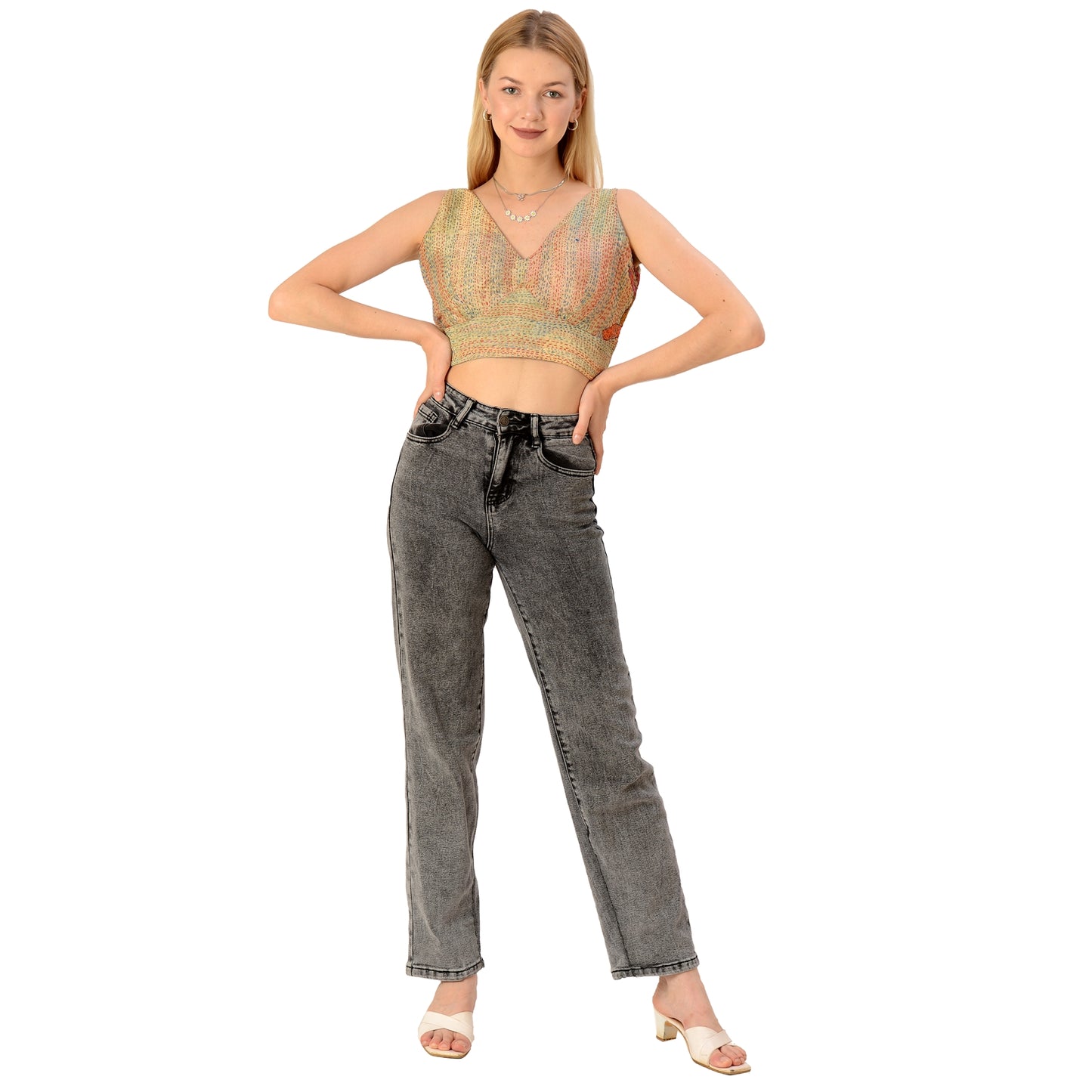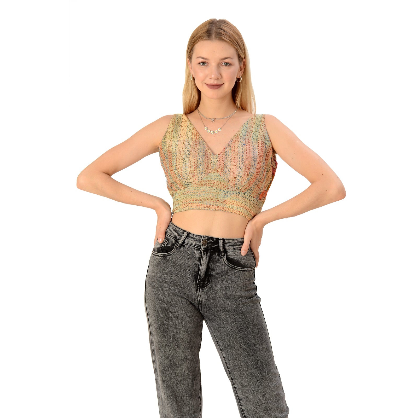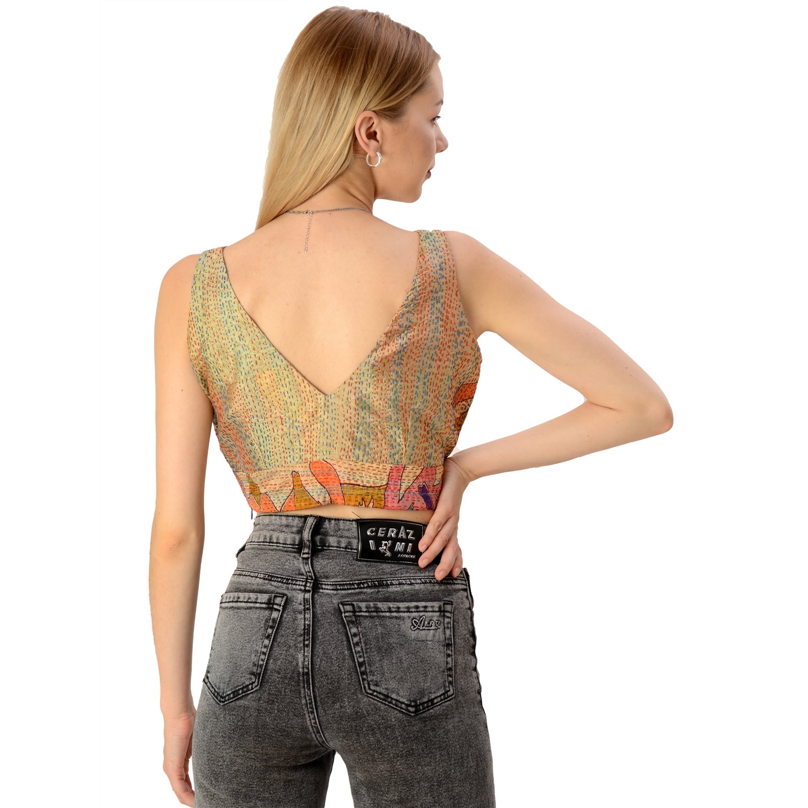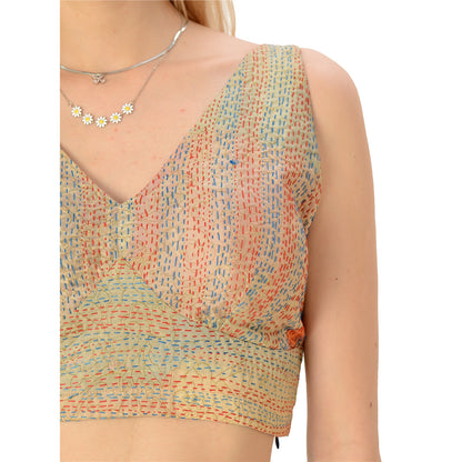 Introducing our sleeveless Kantha Upcycled Blouse, a vibrant multicolored creation crafted from pure silk and adorned with intricate Kantha embroidery, featuring a deep V-neck design and enhanced with a comfortable cotton lining for a harmonious blend of artistry and sustainability.