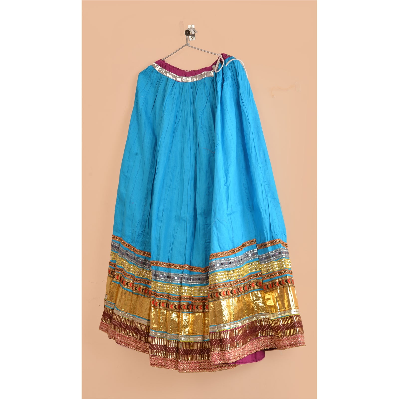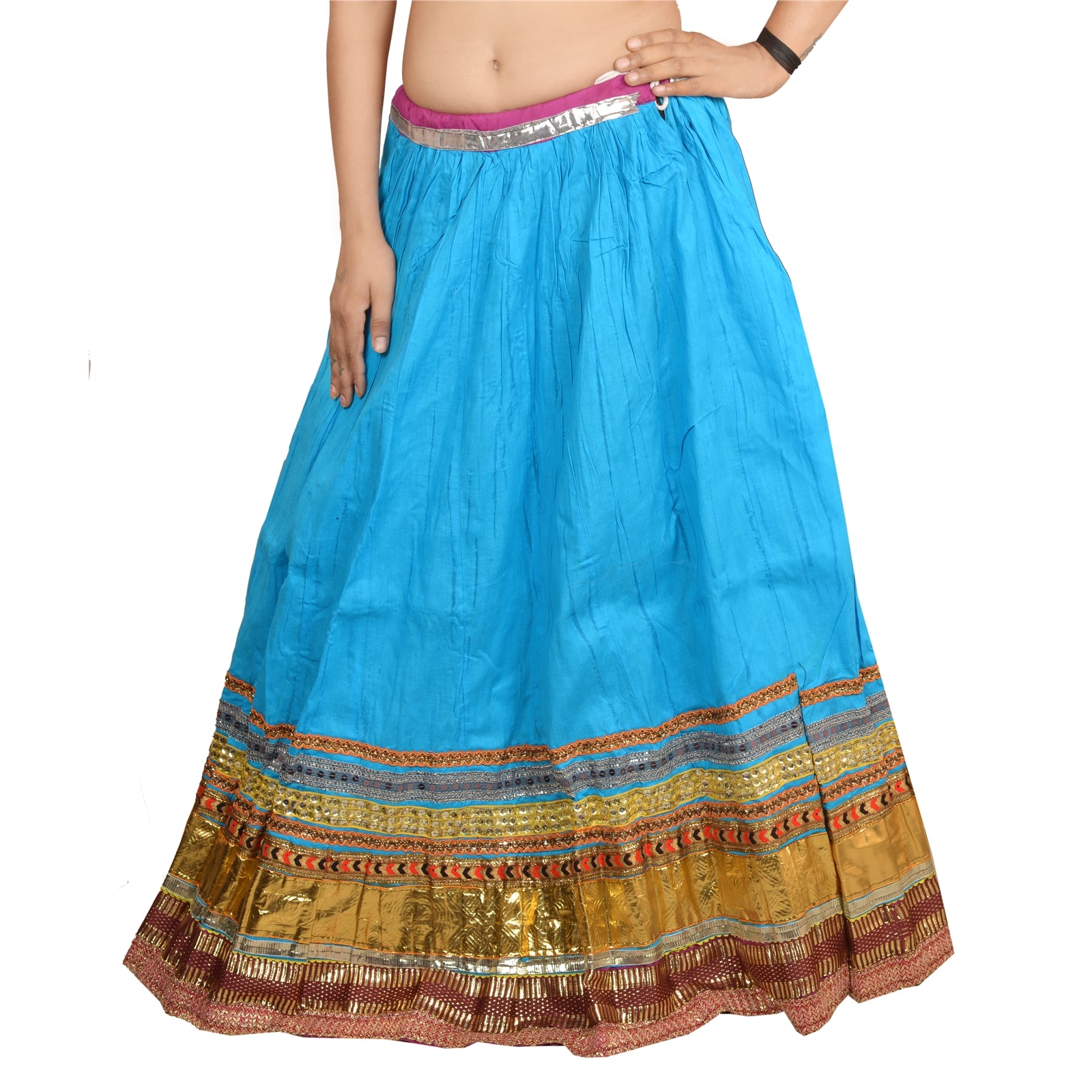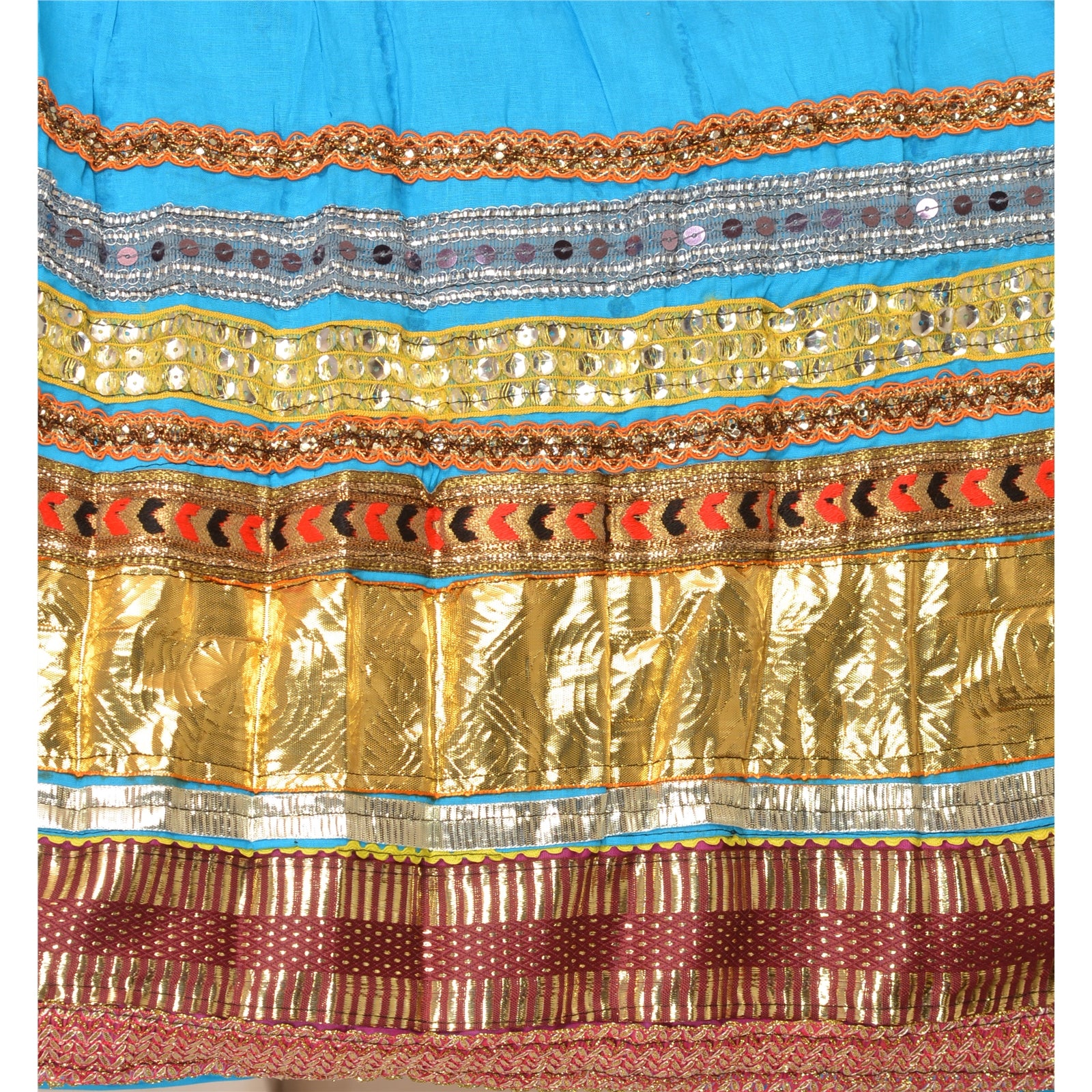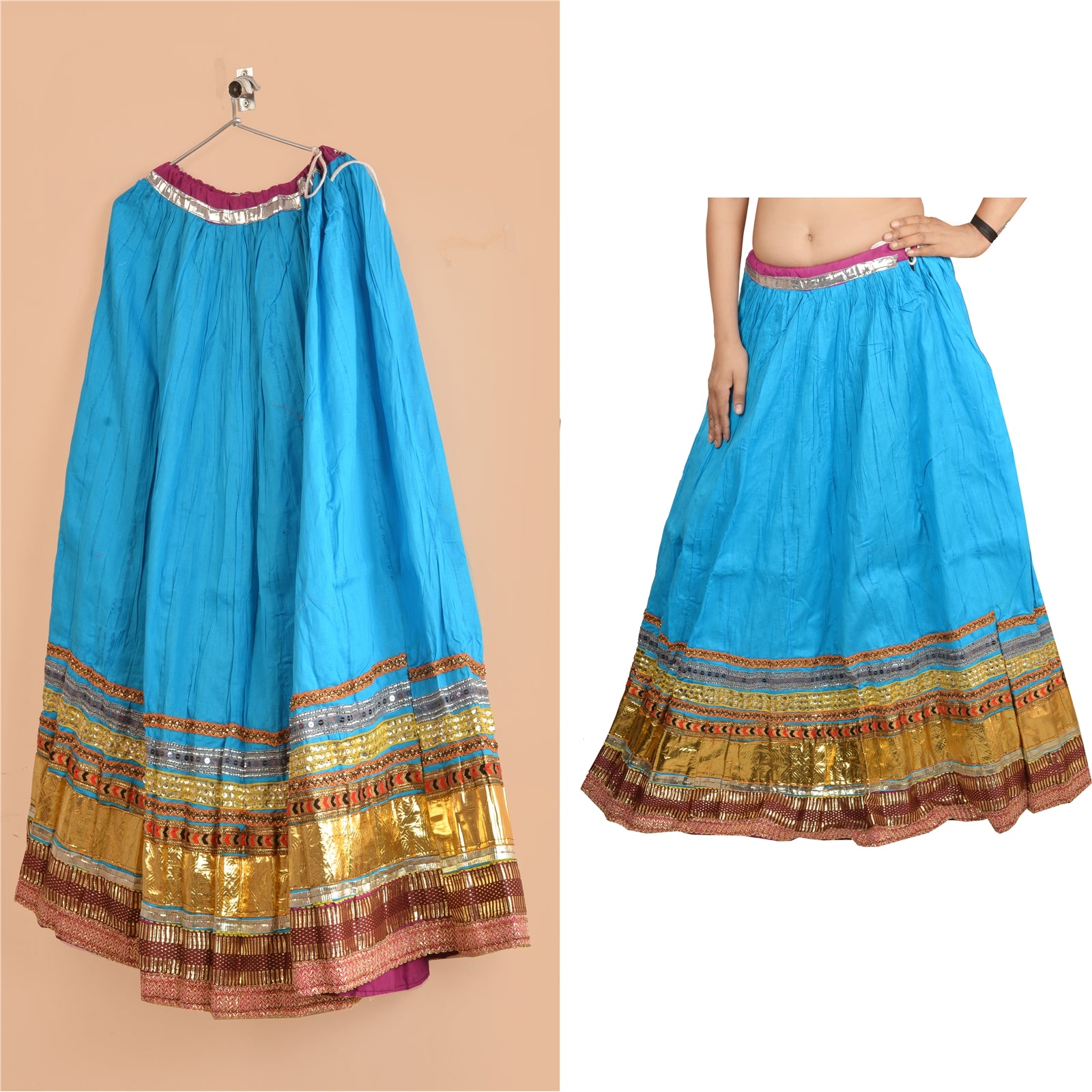 An exquisite lehenga difficult to express in words. Base Sustainable Fabric is cotton in blue color with eye-catching multi color woven and sequined lace work and gota patti work on bottom part of the skirt which is making it look beautiful & graceful. There is a drawstring on the waist to adjust according your waist size. on hems makes Perfect for dance parties, fests and more.... Make your lehenga/skirt collection look stately, rich, ravishing and complete with this piece. WOW!! great craftsmanship!!!!