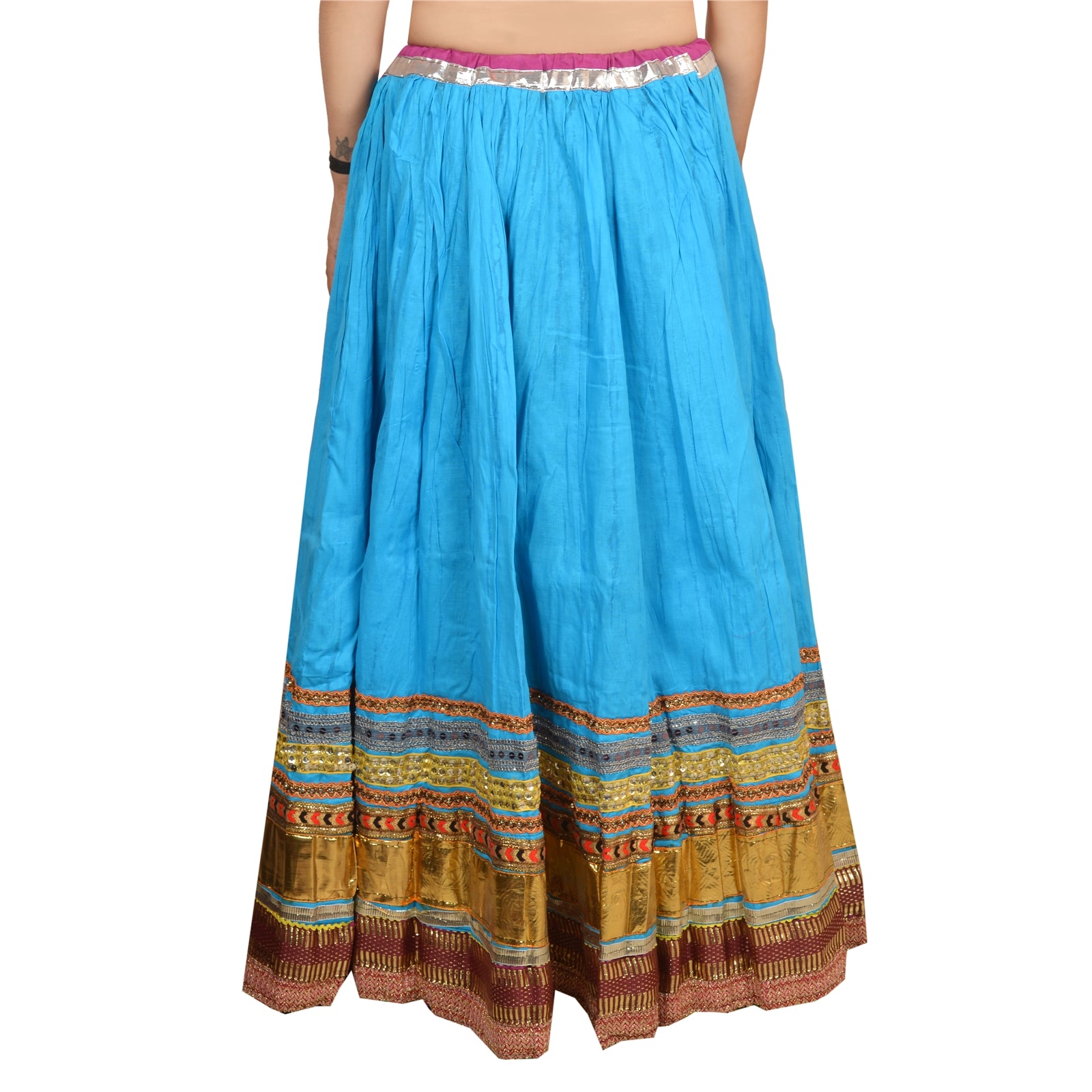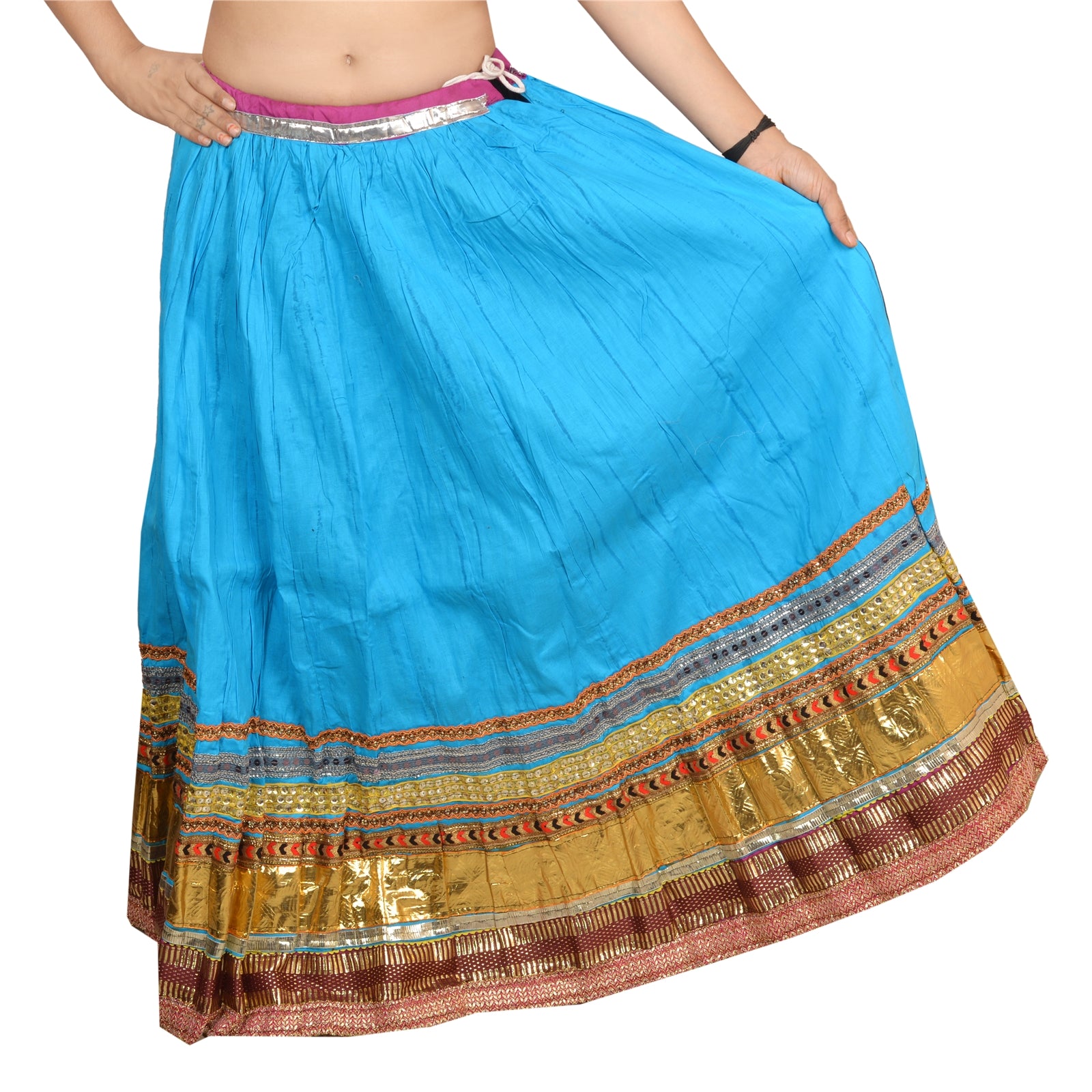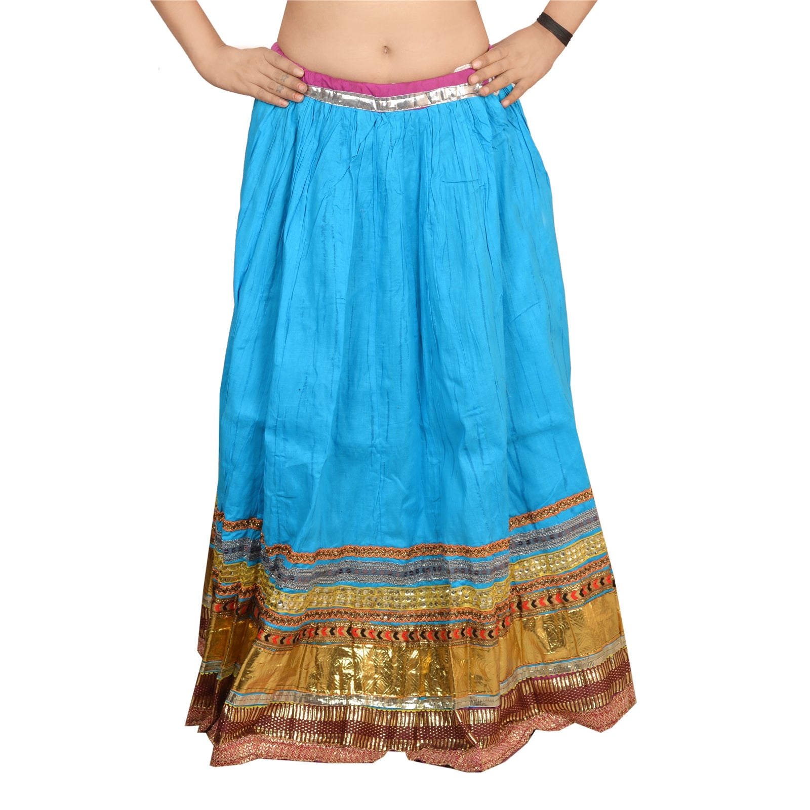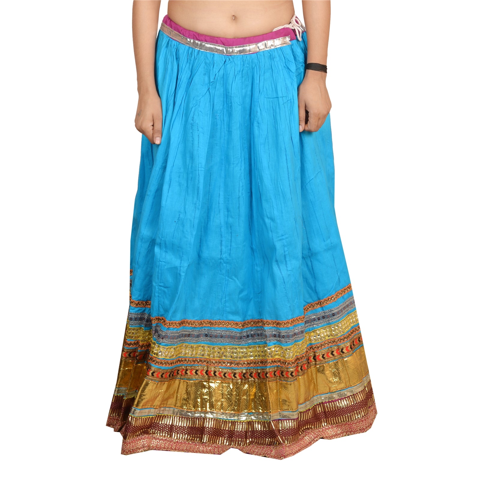 An exquisite lehenga difficult to express in words. Base Sustainable Fabric is cotton in blue color with eye-catching multi color woven and sequined lace work and gota patti work on bottom part of the skirt which is making it look beautiful & graceful. There is a drawstring on the waist to adjust according your waist size. on hems makes Perfect for dance parties, fests and more.... Make your lehenga/skirt collection look stately, rich, ravishing and complete with this piece. WOW!! great craftsmanship!!!!