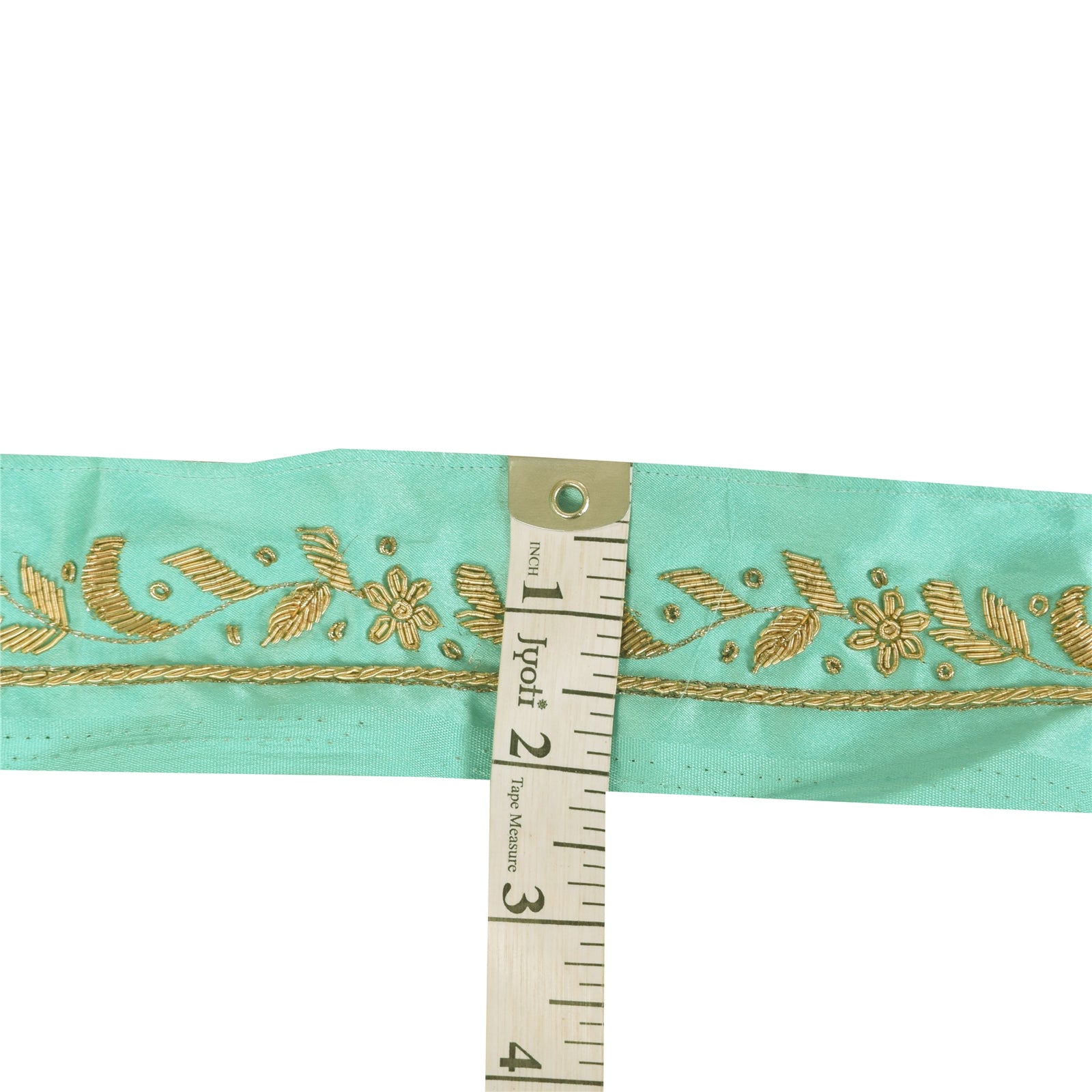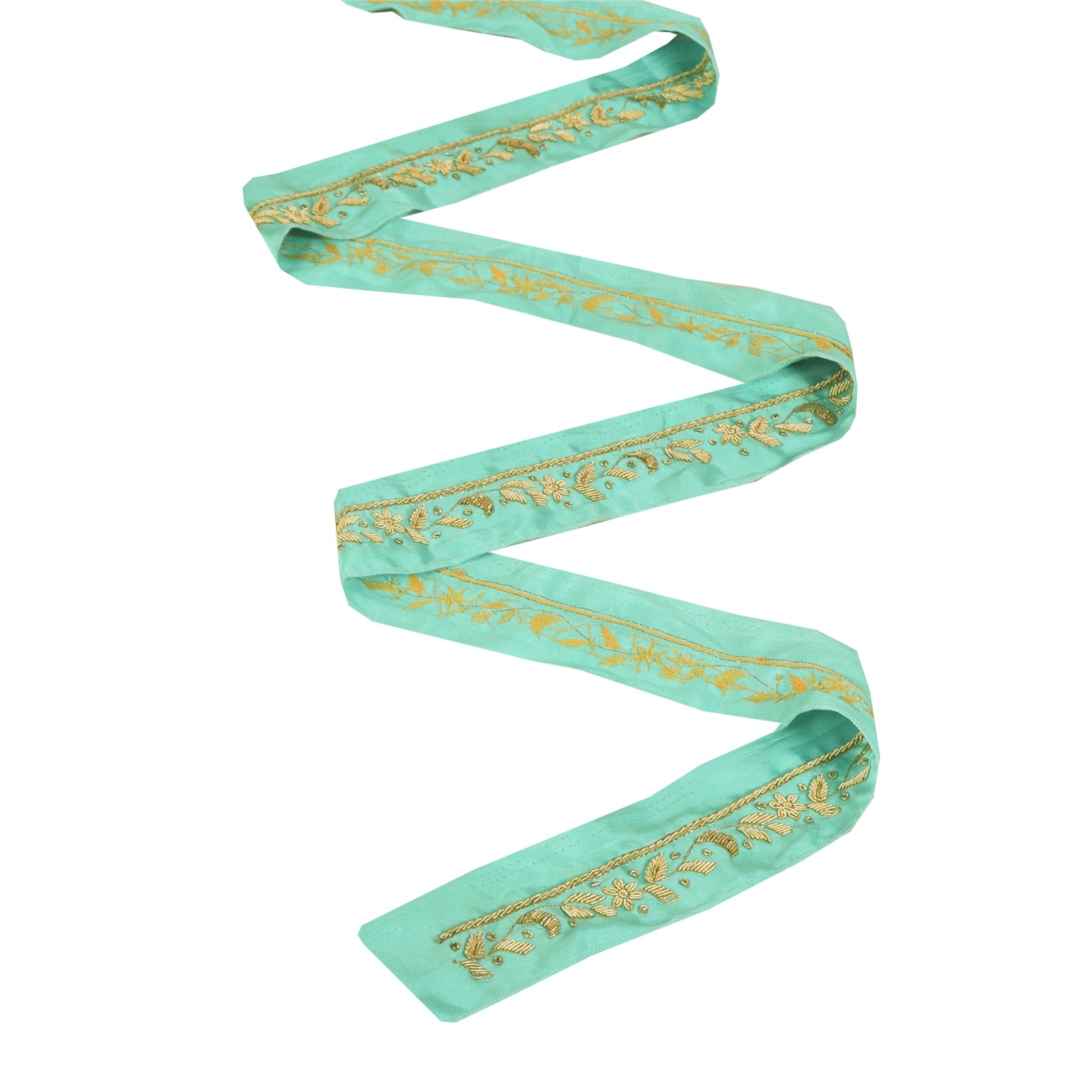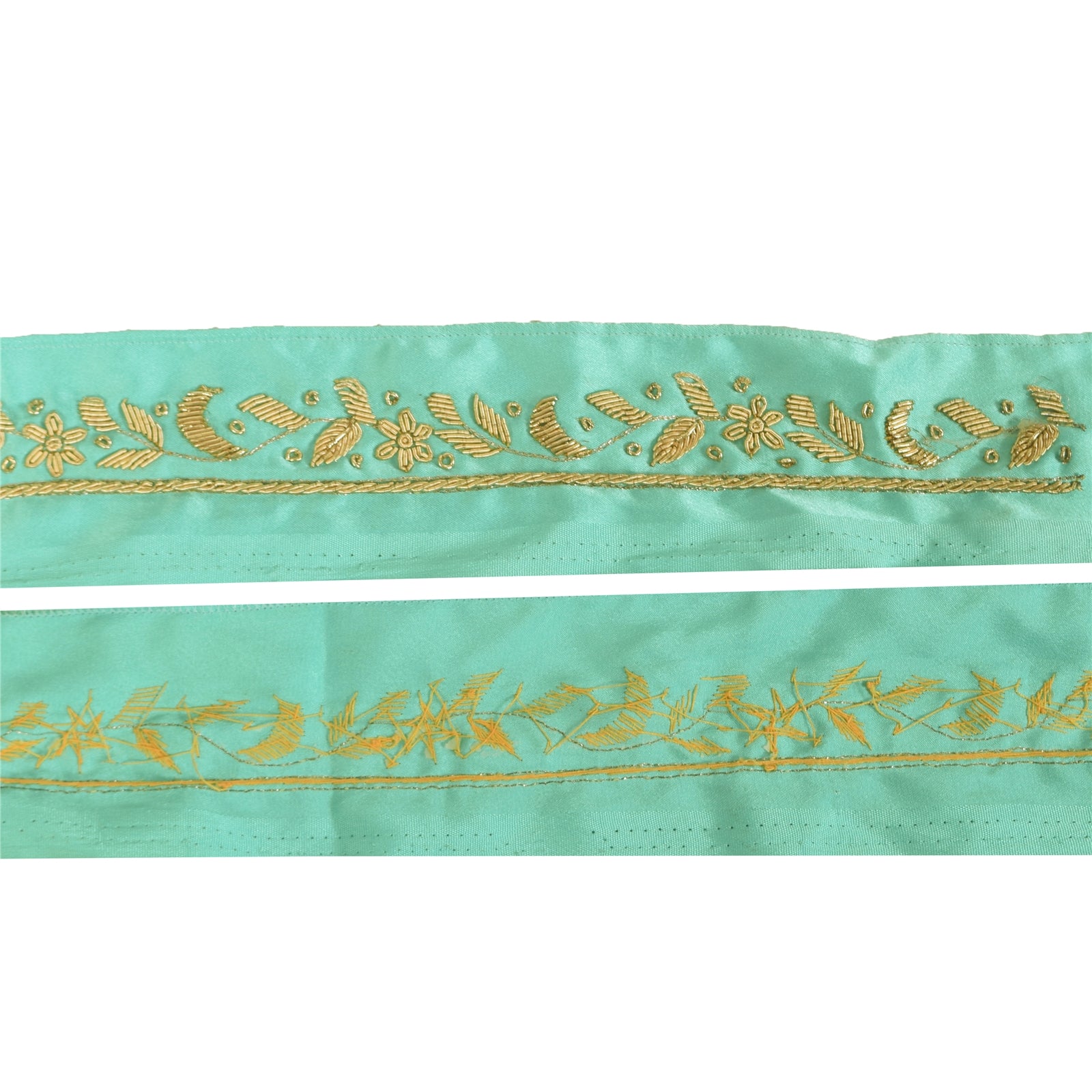 THE ITEM COLOR OR SHADE MAY BE DARKER OR LIGHTER THAN THE PICTURE.' Amazing pure silk hand woven sari border in sea green color highlighting zardozi work. Border has beautiful floral design with golden zari & zardozi work. WOW!! an awesome one of a kind versatile border. 1 Quantity = 1 Yard B-14810