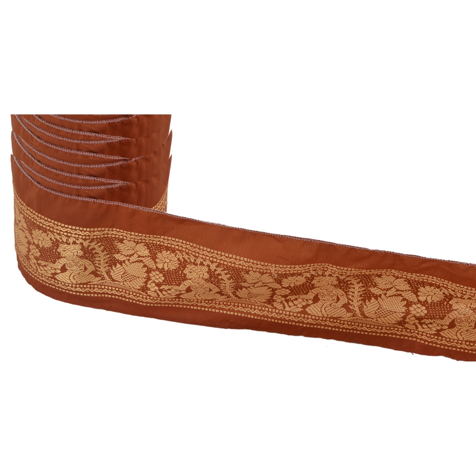 Wonderful 100% pure silk woven sari border in brown color highlighting traditional Baluchari work from Odisha (Eastern India). Border has beautiful woven pattern in golden color showcasing a women sitting by a bunch of flowers and admiring them. Floral and leaf motifs further add to the beauty of the trim. WOW!! An awesome one of a kind versatile border. 1 Quantity = 1 Yard