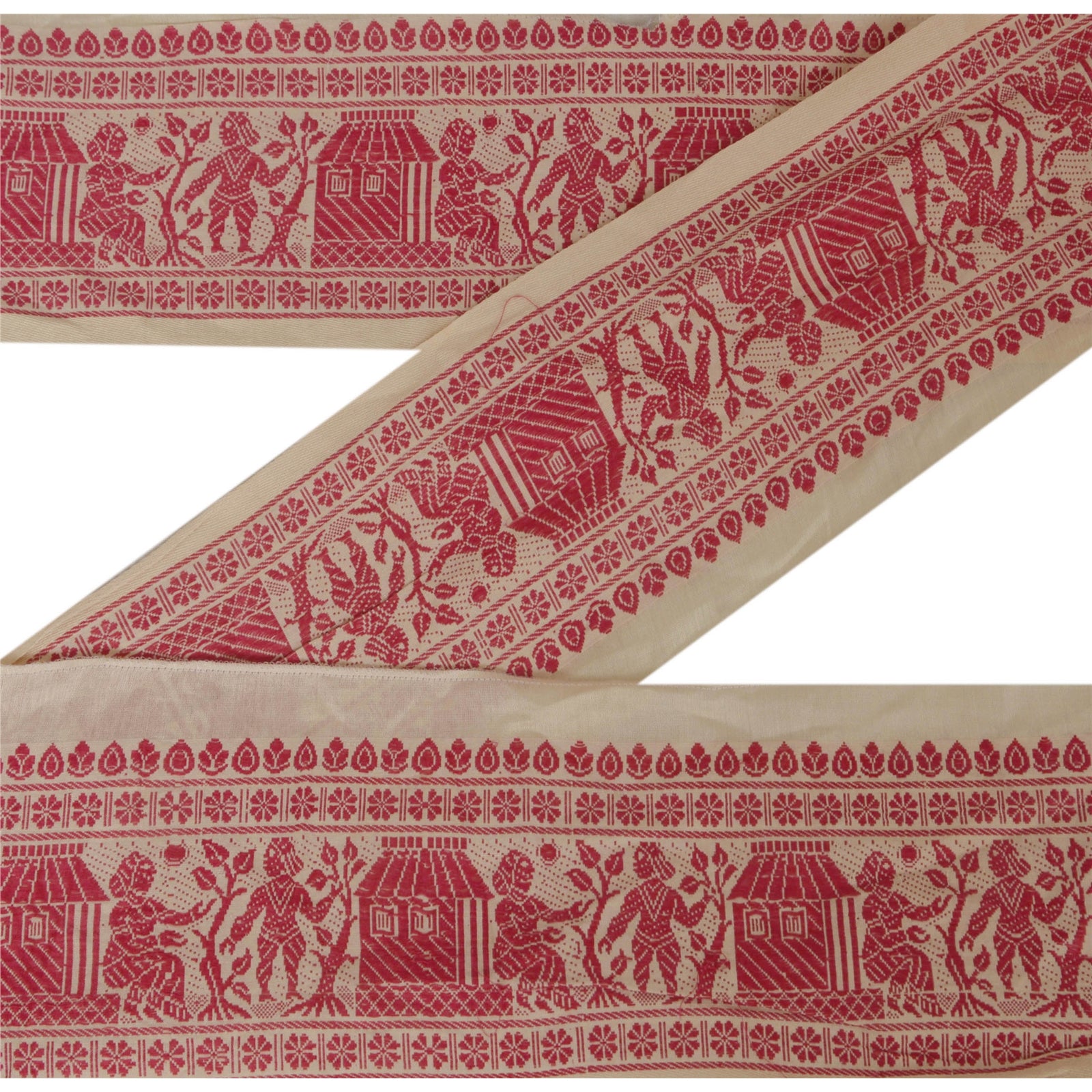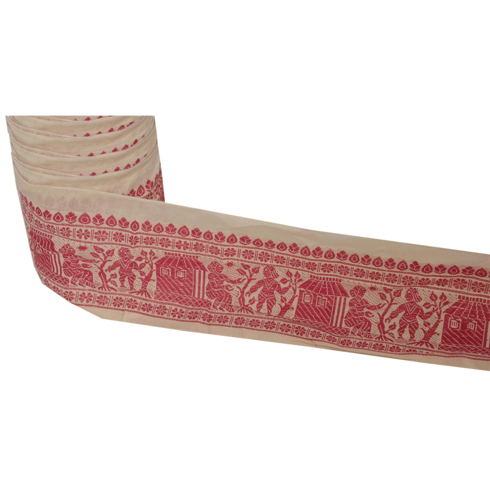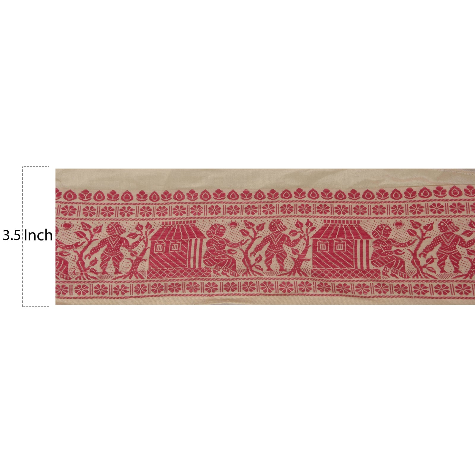 Fabulous 100% pure silk woven sari border in cream color highlighting baluchari work. Border has beautiful human design, house patterns painstakingly woven with dark red color thread. WOW!! an awesome one of a kind versatile border. 1 Quantity = 1 Yard