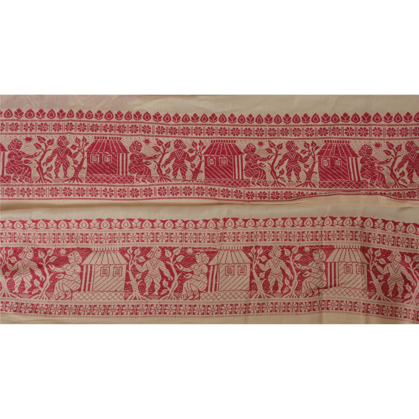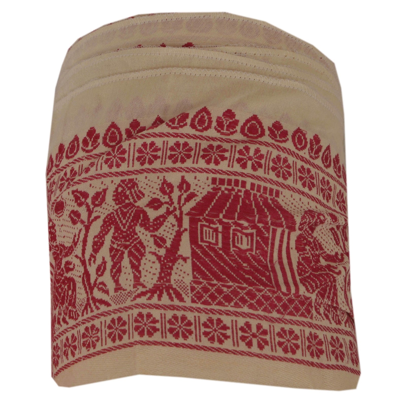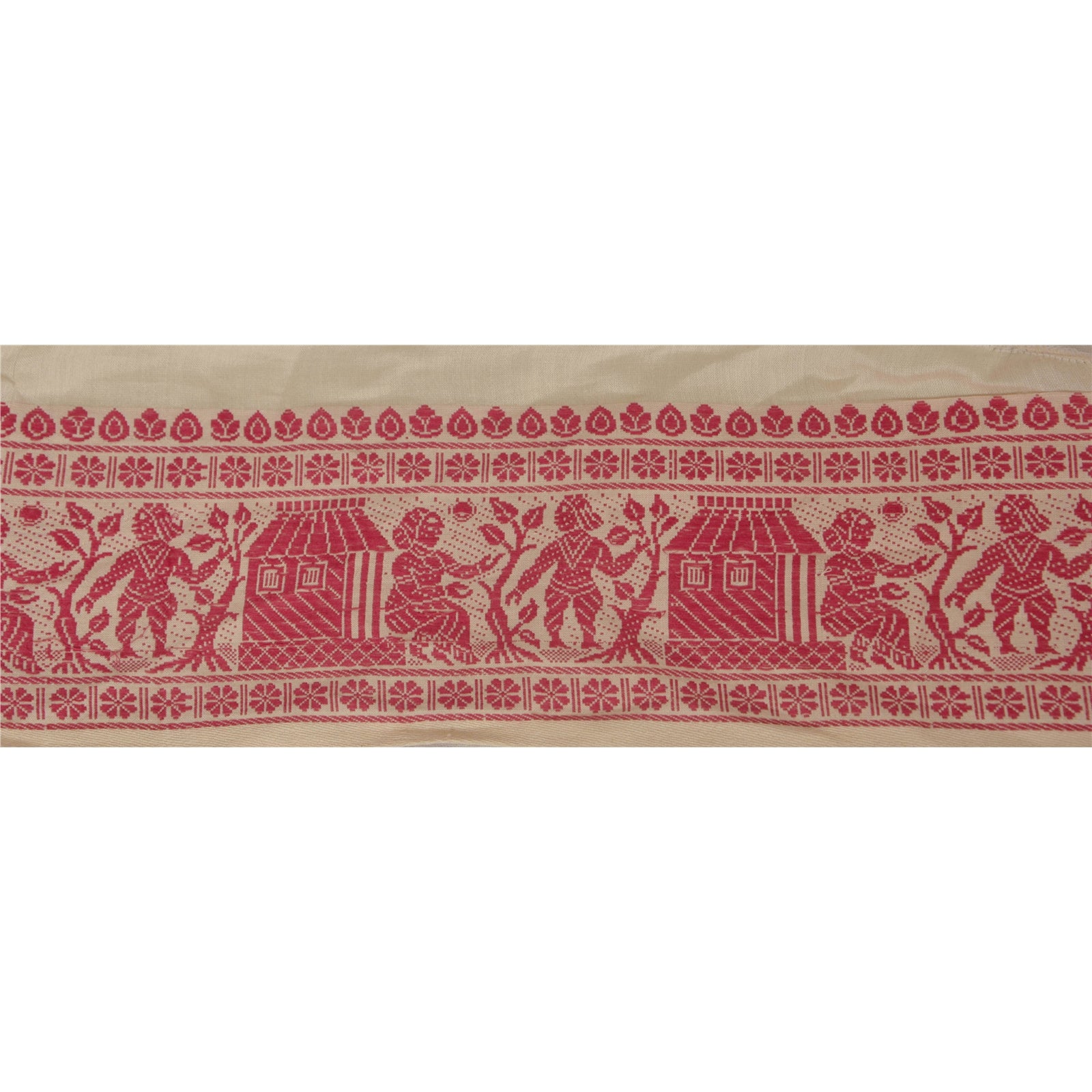 Fabulous 100% pure silk woven sari border in cream color highlighting baluchari work. Border has beautiful human design, house patterns painstakingly woven with dark red color thread. WOW!! an awesome one of a kind versatile border. 1 Quantity = 1 Yard
