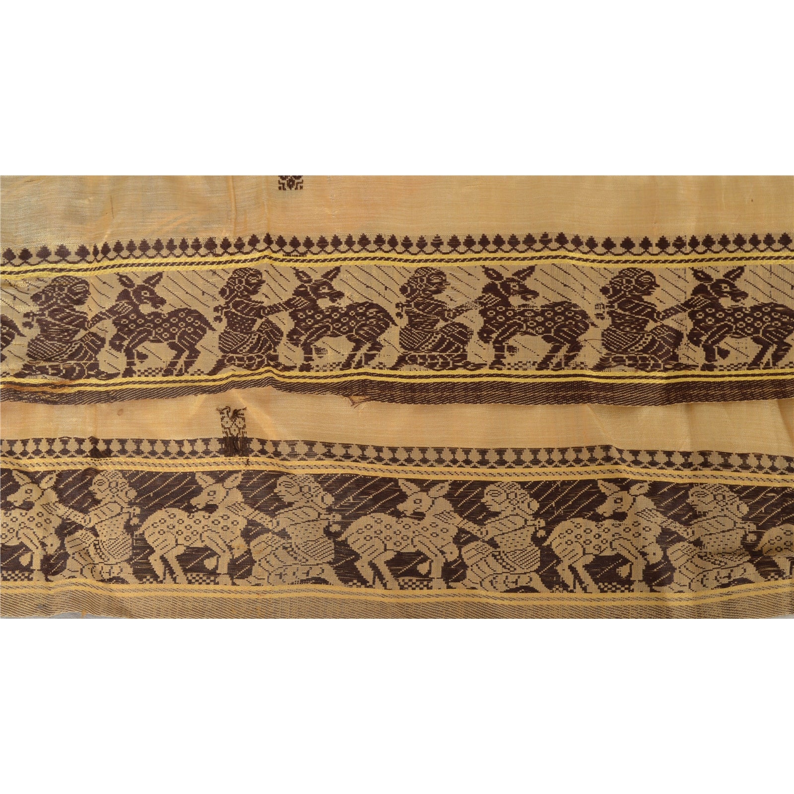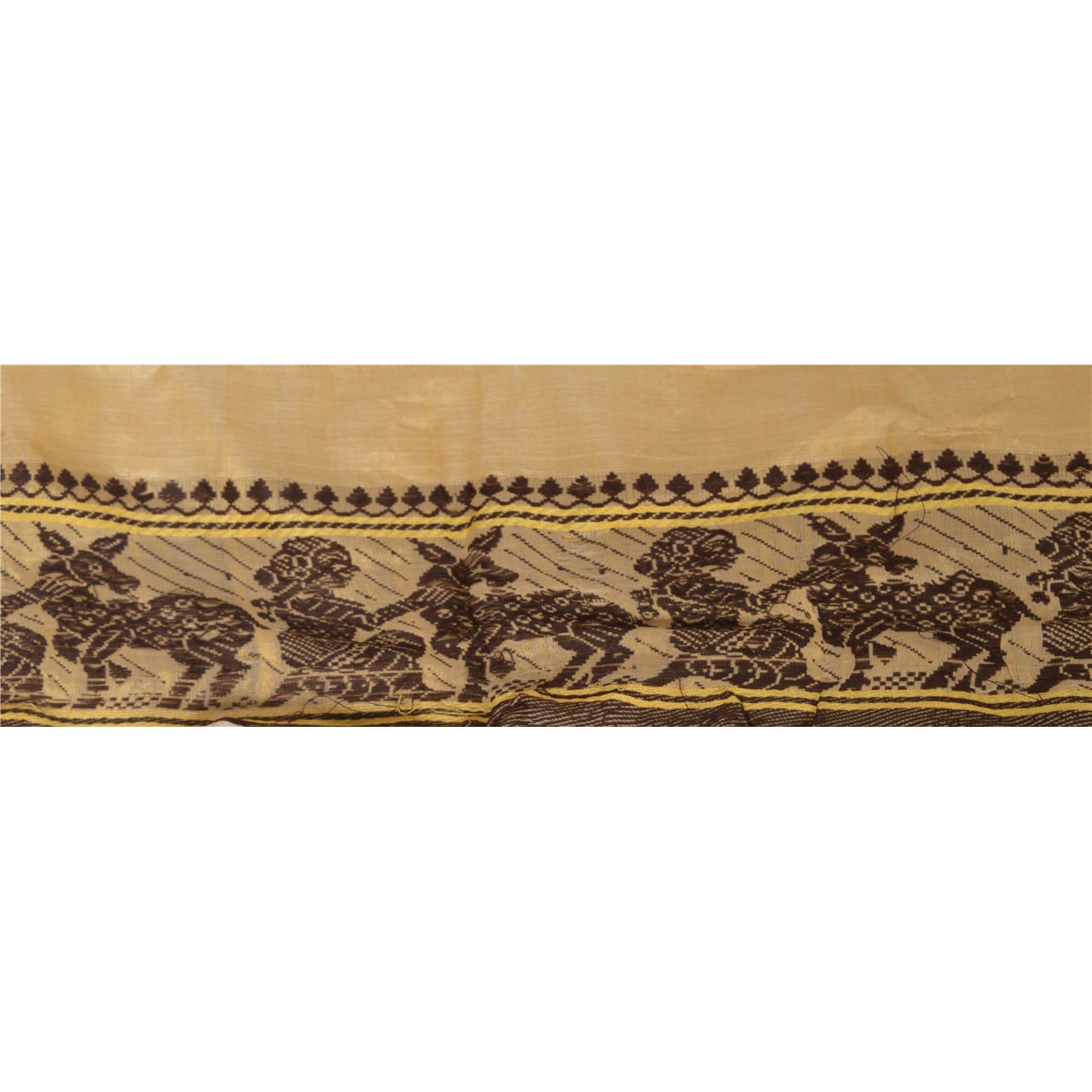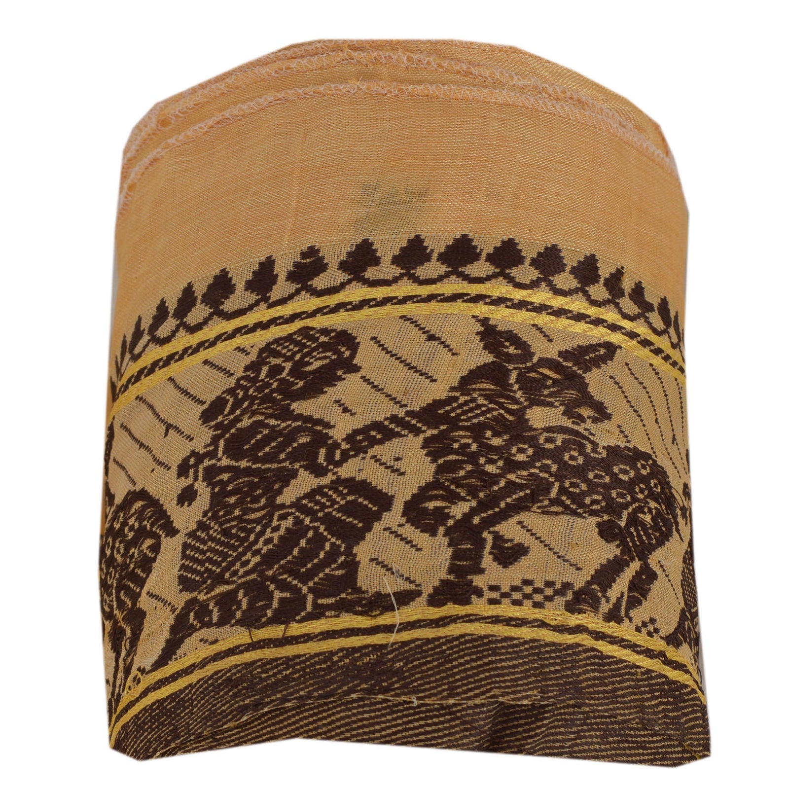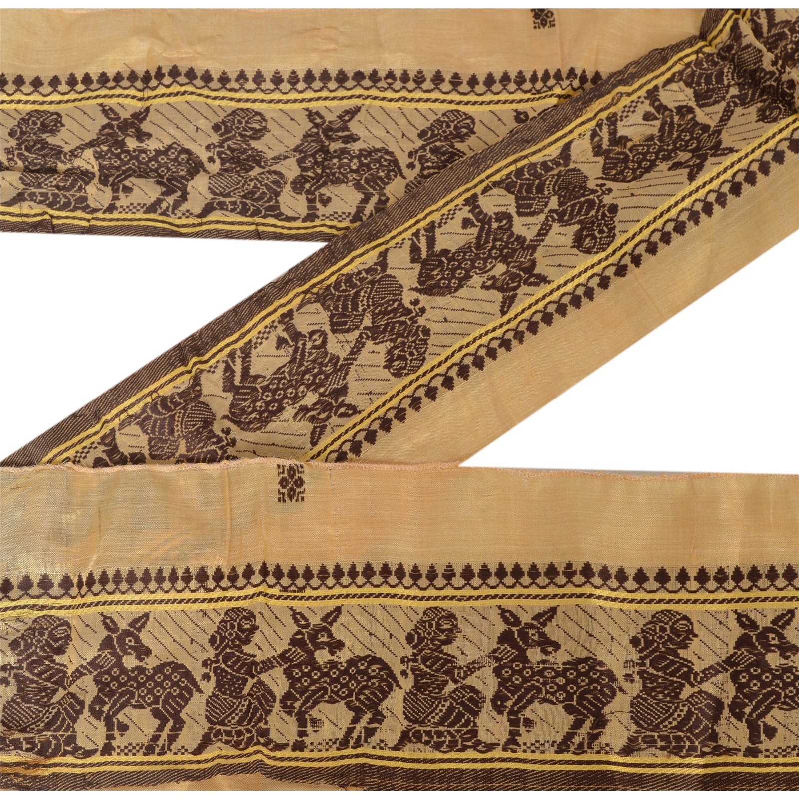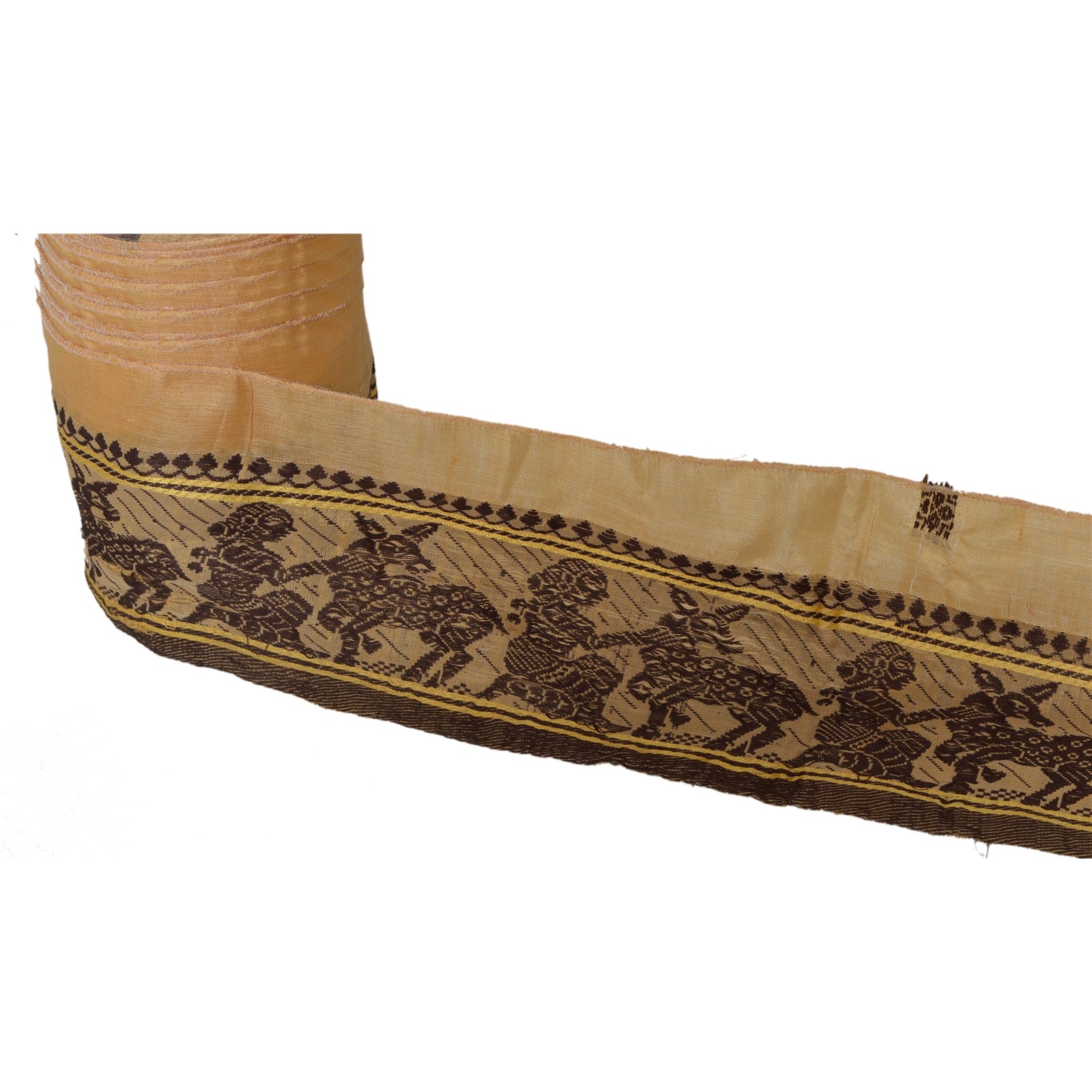 Fabulous 100% pure silk woven sari border in cream color highlighting Baluchari work. Border has beautiful mythological design of human figure and deer woven in black thread. Further you can see fine detailing with cream thread work. WOW!! an awesome one of a kind versatile border. 1 Quantity = 1 Yard