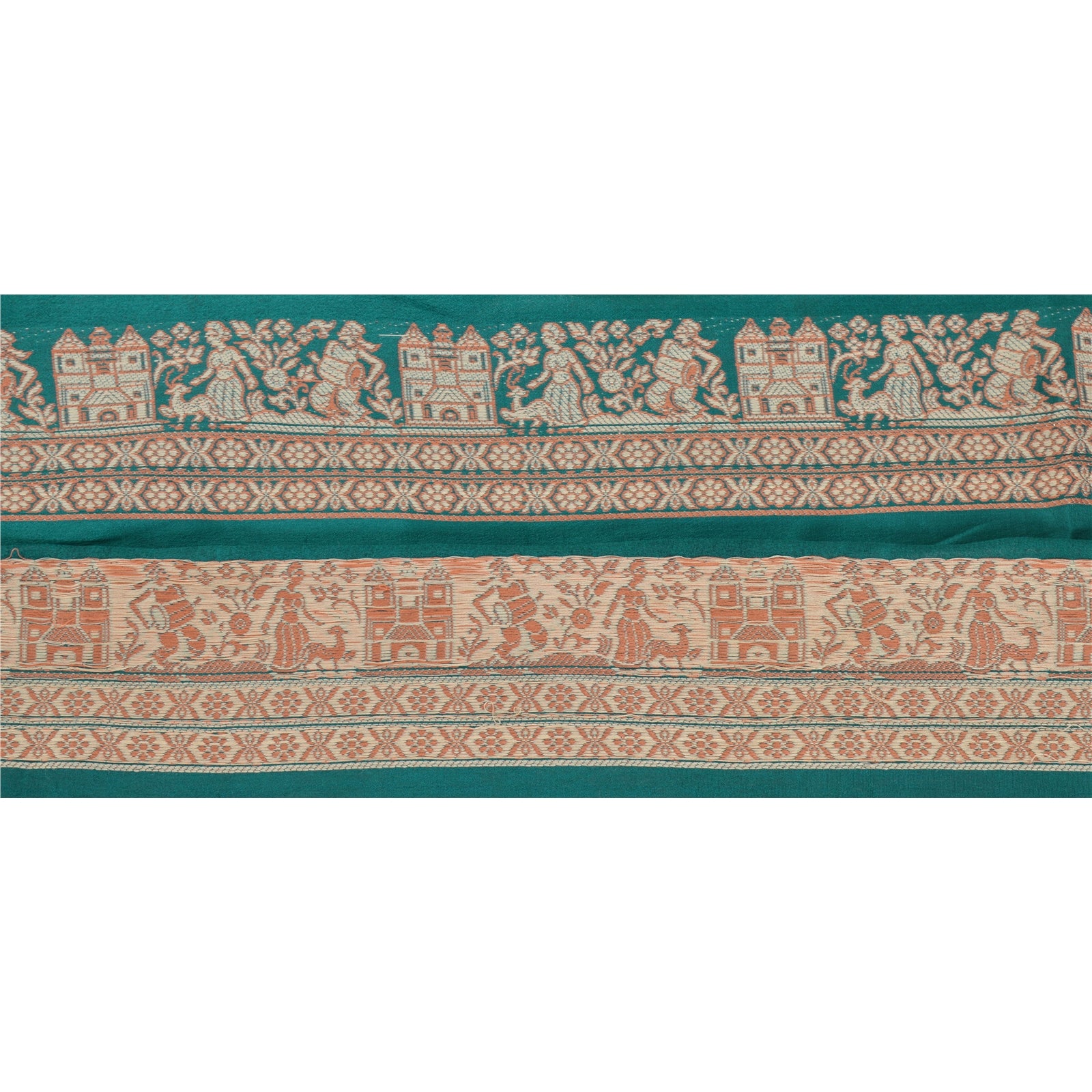 Wonderful pure silk woven sari border in green color highlighting traditional Baluchari work from Odisha (Eastern India). Border has beautiful woven pattern in blue and brown color showcasing man & woman playing musical instruments. House, floral, deer, leaf motifs further add to the beauty of the trim. WOW!! and awesome one of a kind versatile border. 1 Quantity = 1 Yard