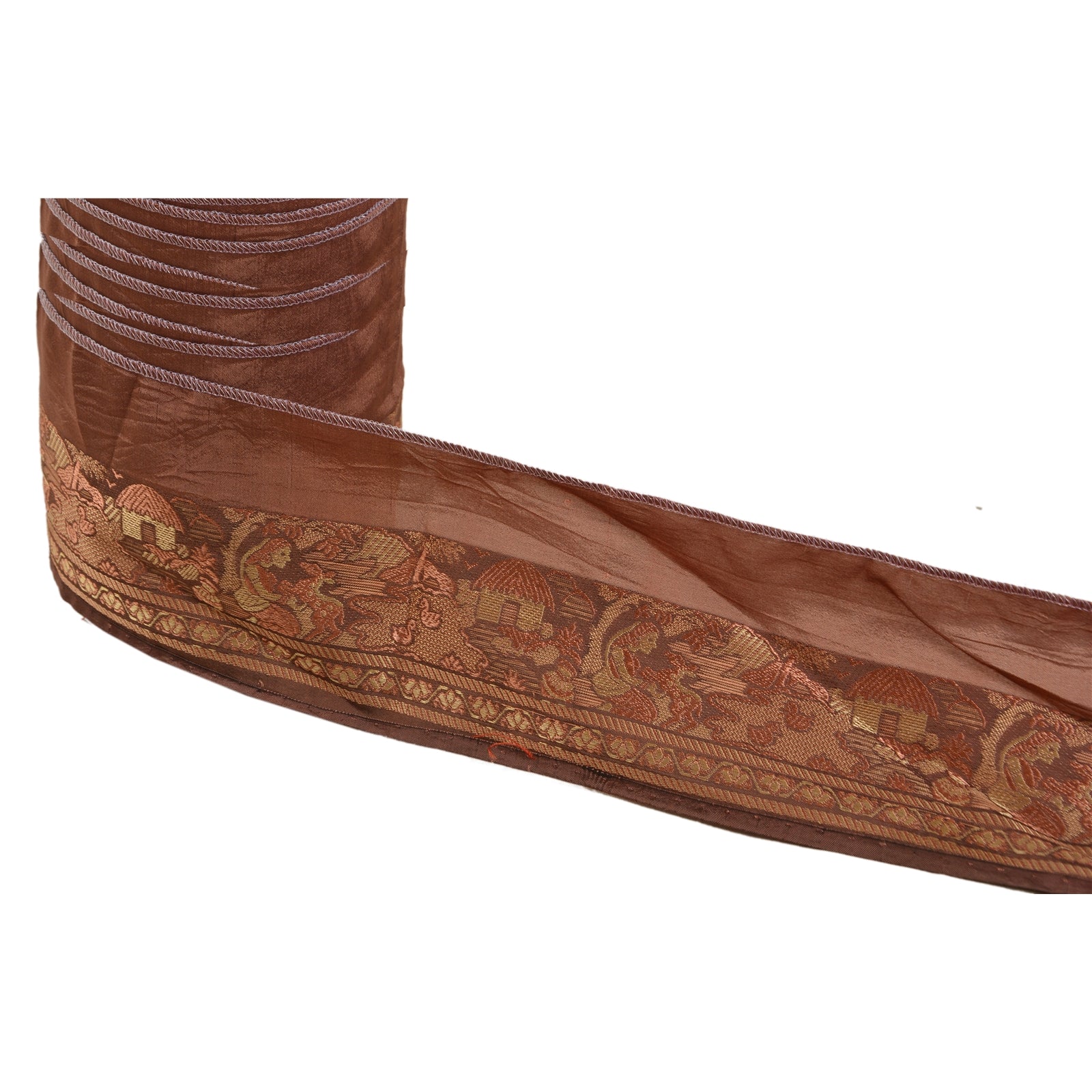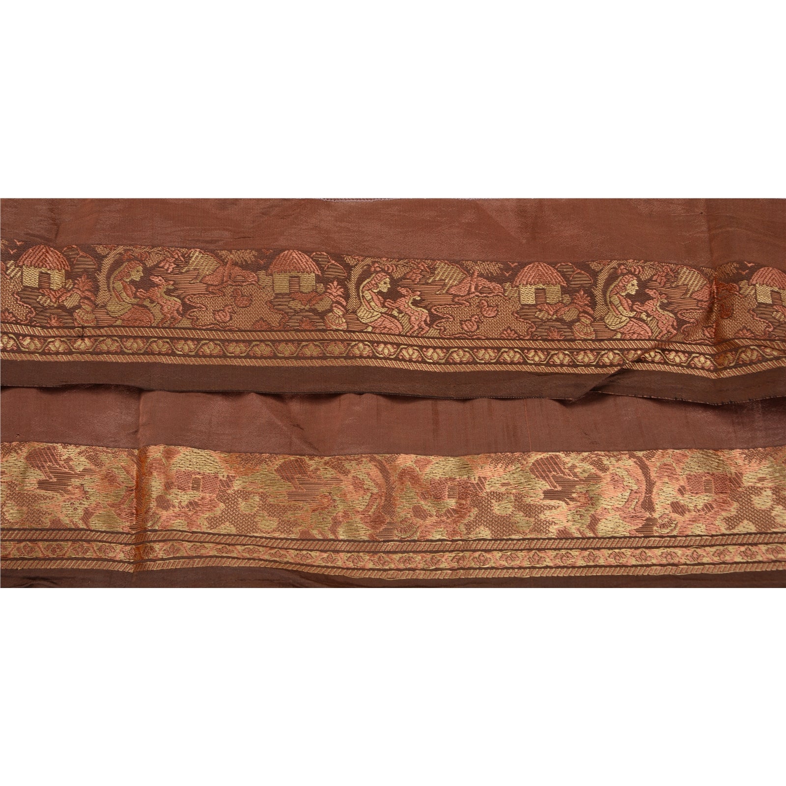 Wonderful pure silk woven sari border in brown color highlighting traditional Baluchari work from Odisha (Eastern India). Border has beautiful woven pattern in pink and brown color woman sitting deer. Floral, hut and duck motifs further add to the beauty of the trim. WOW!! and awesome one of a kind versatile border. 1 Quantity = 1 Yard