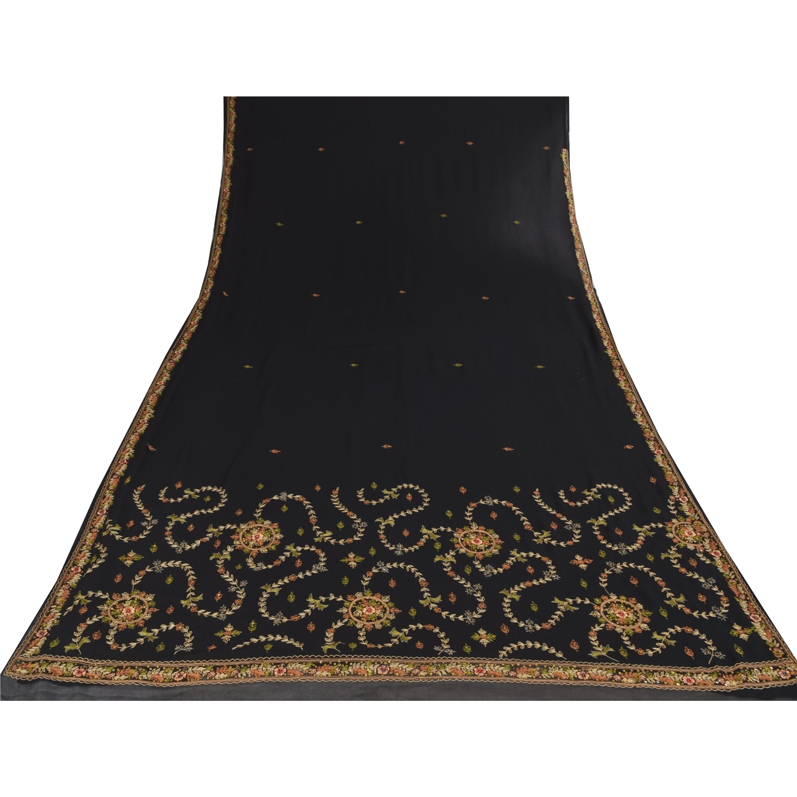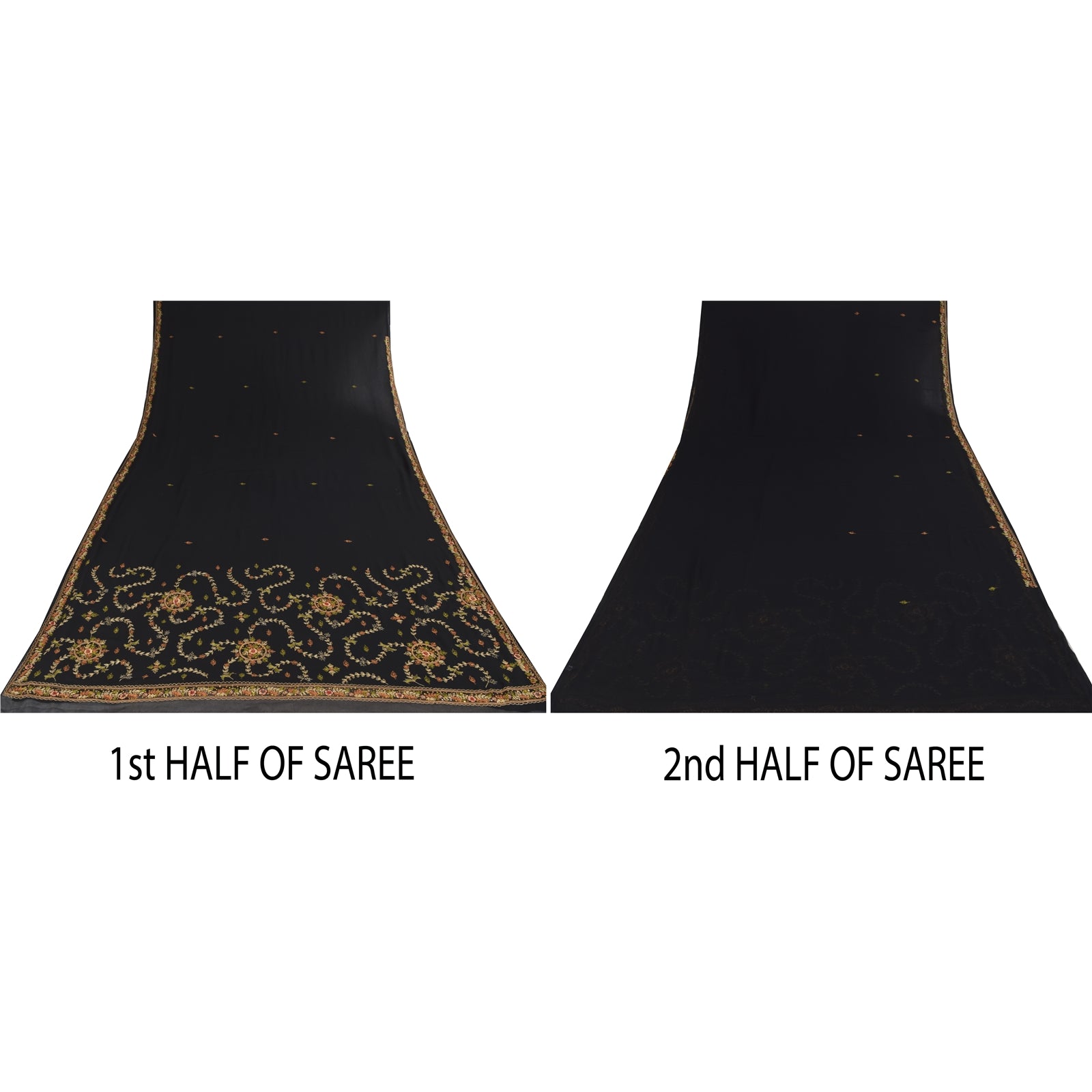 Sanskriti Vintage Black Sarees Georgette Hand Embroidered Sari 6yd Craft Sustainable Fabric