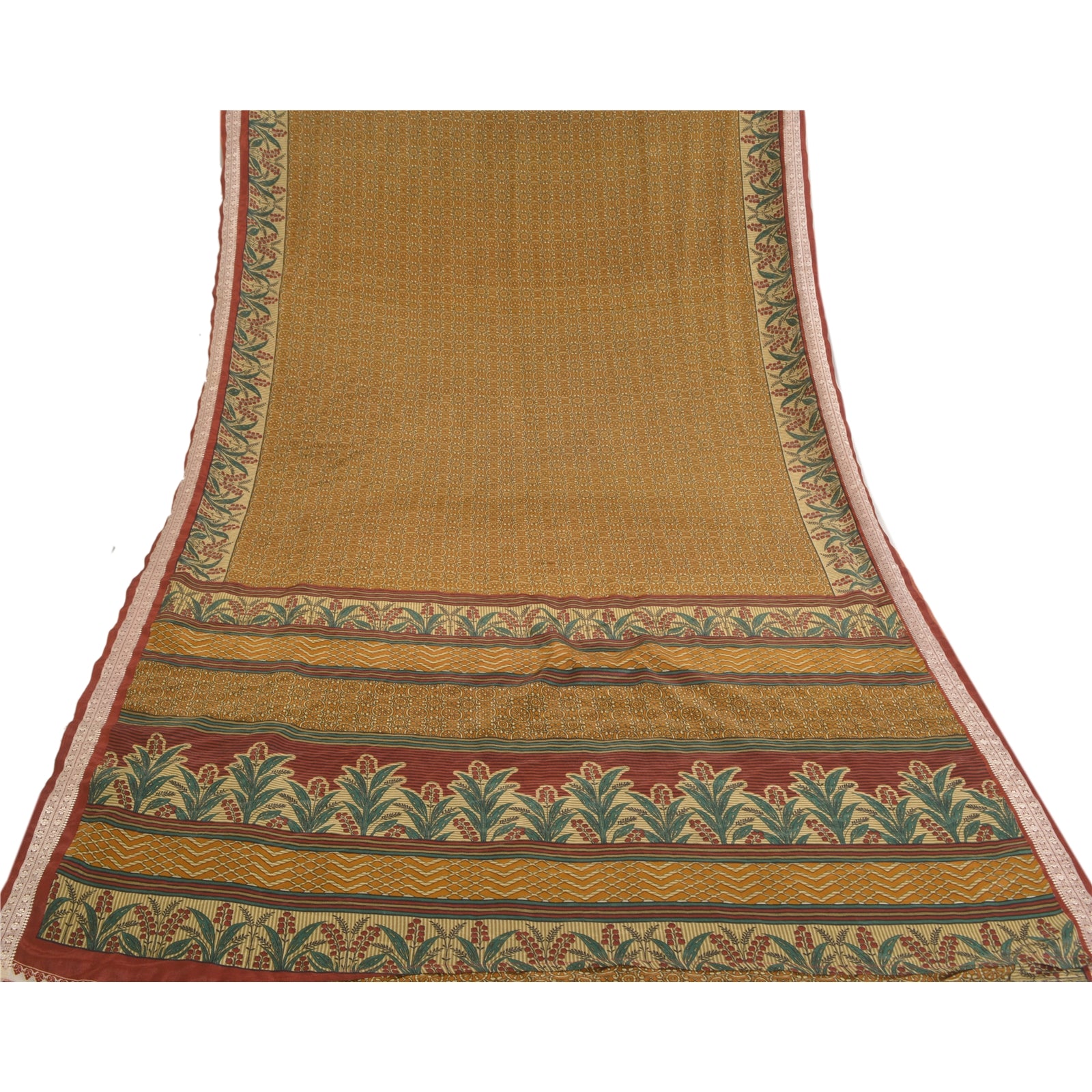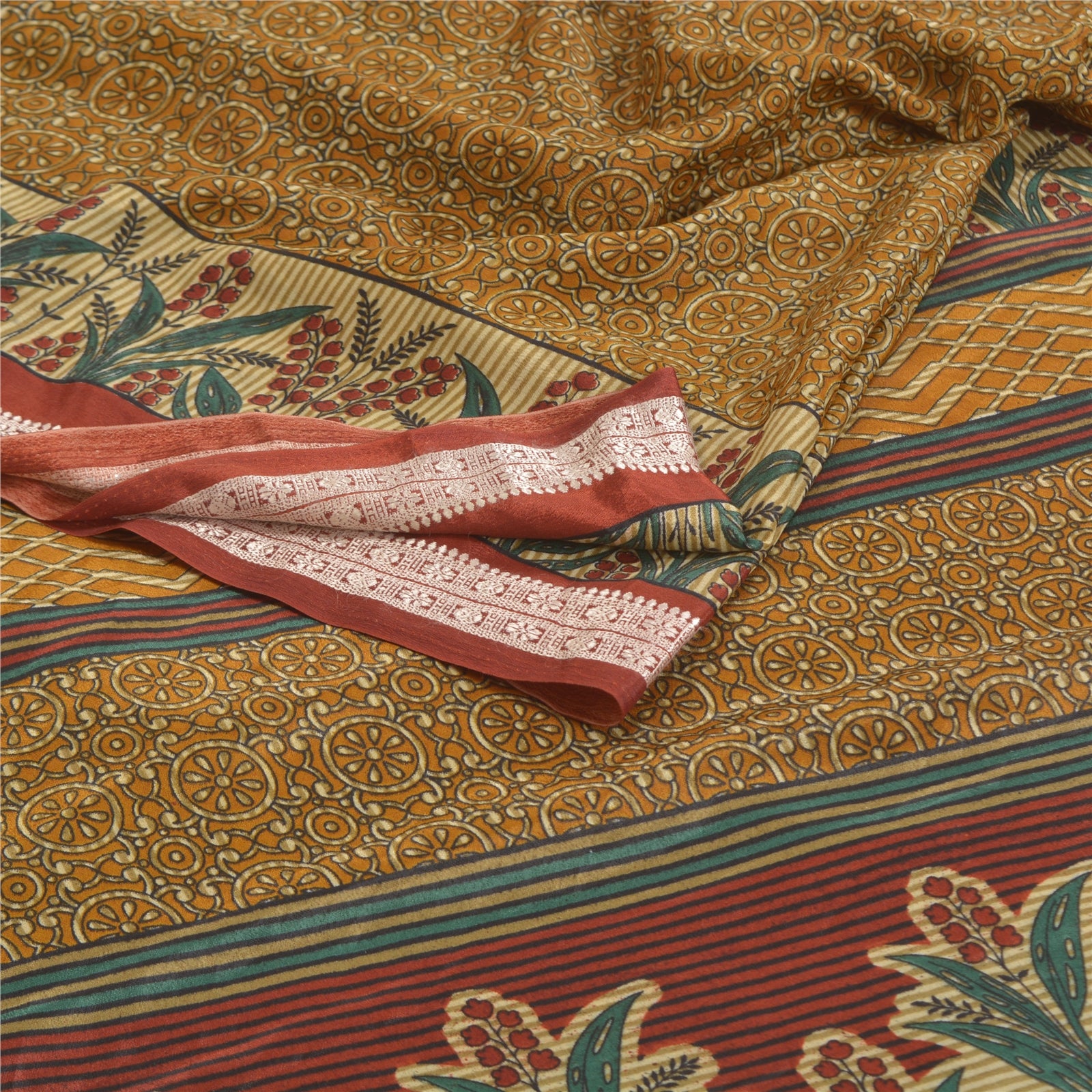 Gorgeous brown colored printed moss crepe saree. Pallu & Border has printed floral design. Floral design in center part of saree. Moss Crepe-This sari is polyester but it feels like crepe silk. What is special about this saree?Very soft & smooth moss crepe Sustainable Fabric with attractive colorful print pattern is beauty of the saree.This unique vintage saree can be used for various crafting ideas even if you don't want to use it as a sari. Design a dress, use it as a throw, as window dressing, upholstery, sarongs, table linen and much more. Let your creative juices flow and use this decorated Sustainable Fabric in multiple fashion.