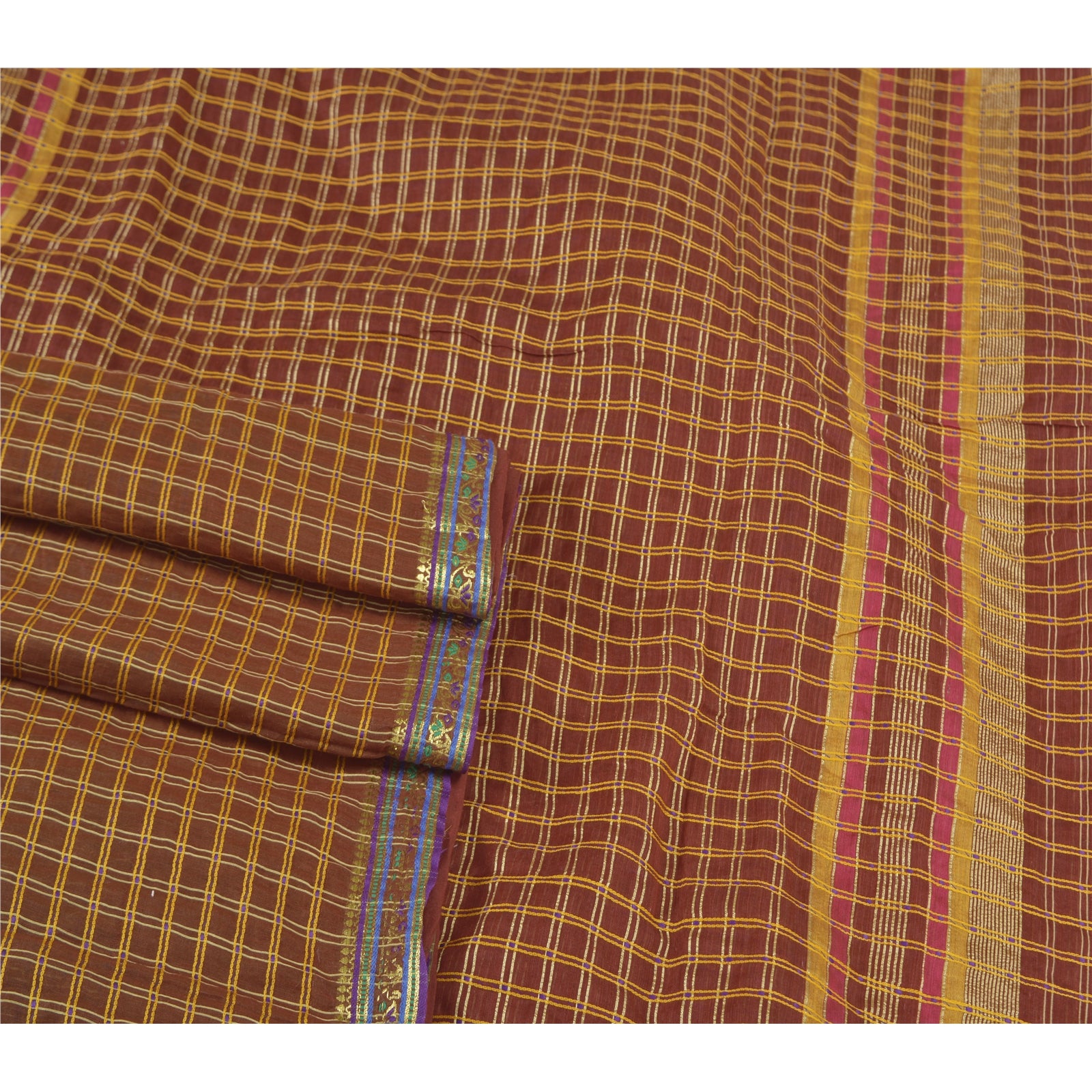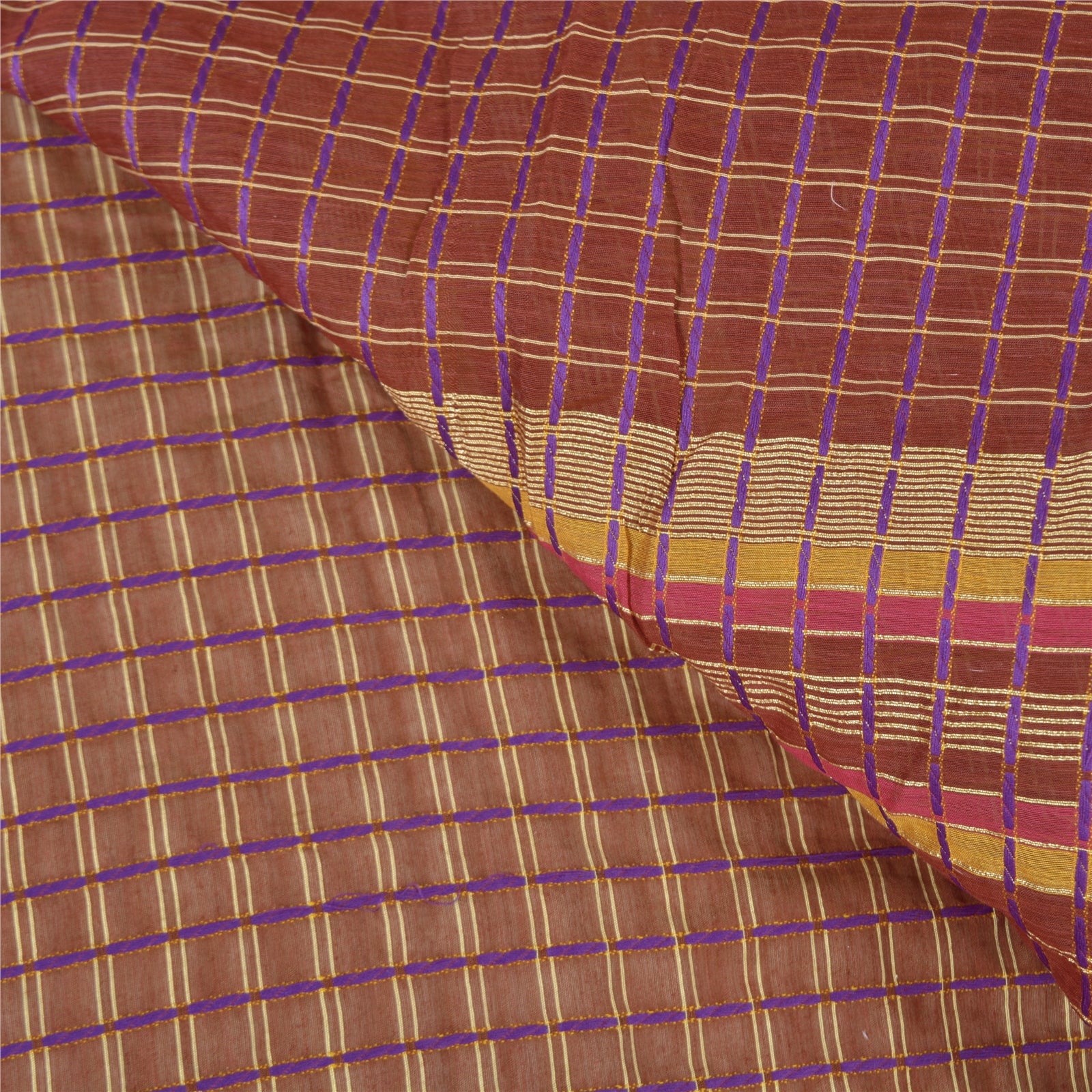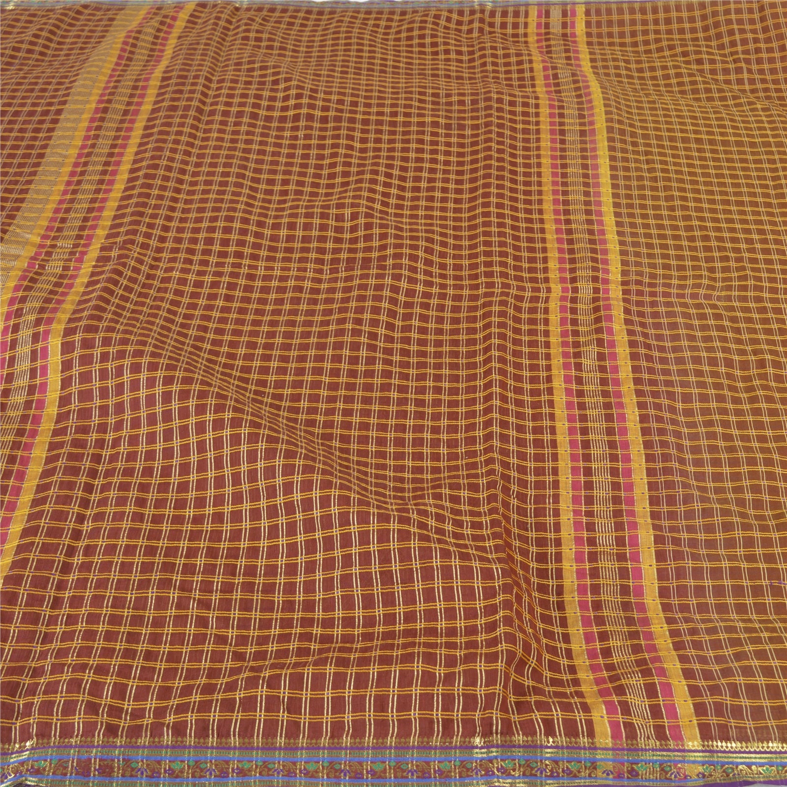 Beautiful Dark Red Colored Blend Cotton Hand-Woven Sari. Pallu & Border features is multi color woven work with grids pattern. Center part of the sari has similar woven pattern. This saree can be used for various crafting ideas too. Use it for dress designing, as a throw, as window dressing, upholstery, table linen and much more. Let your creative juices flow. For USA buyers - Single item ships via registered air mail, buy 1 more to get FedEx.