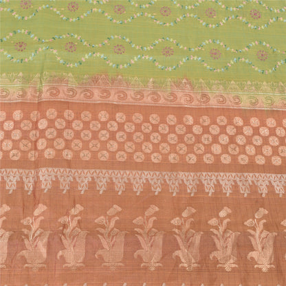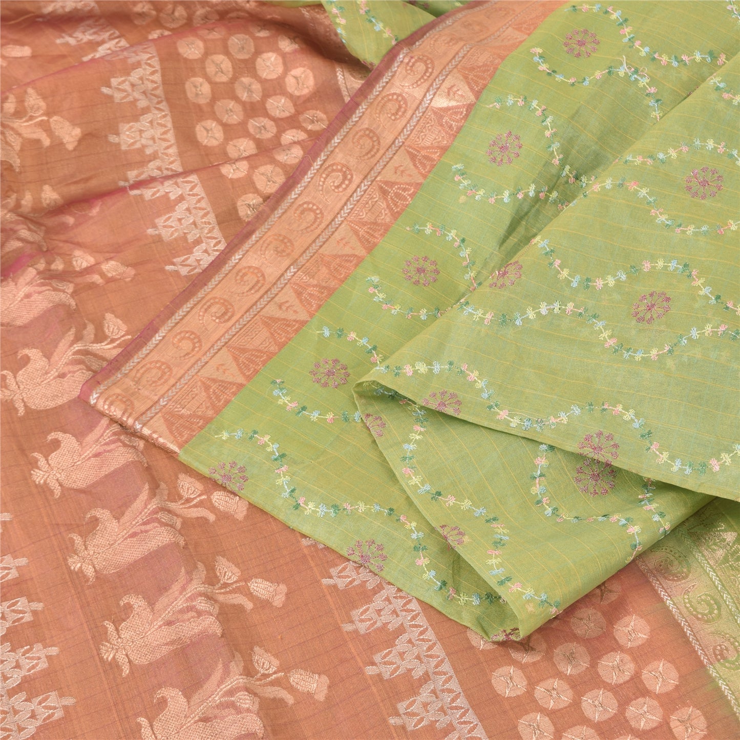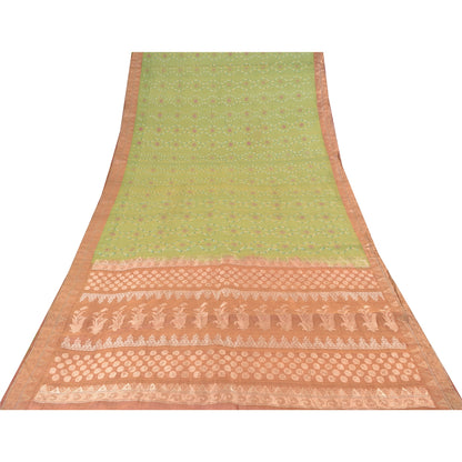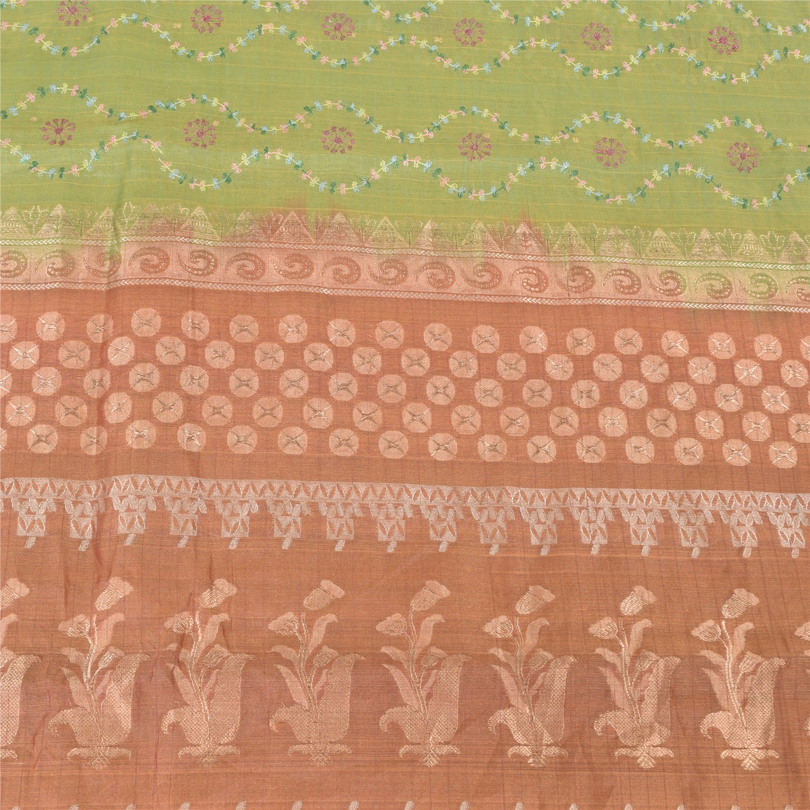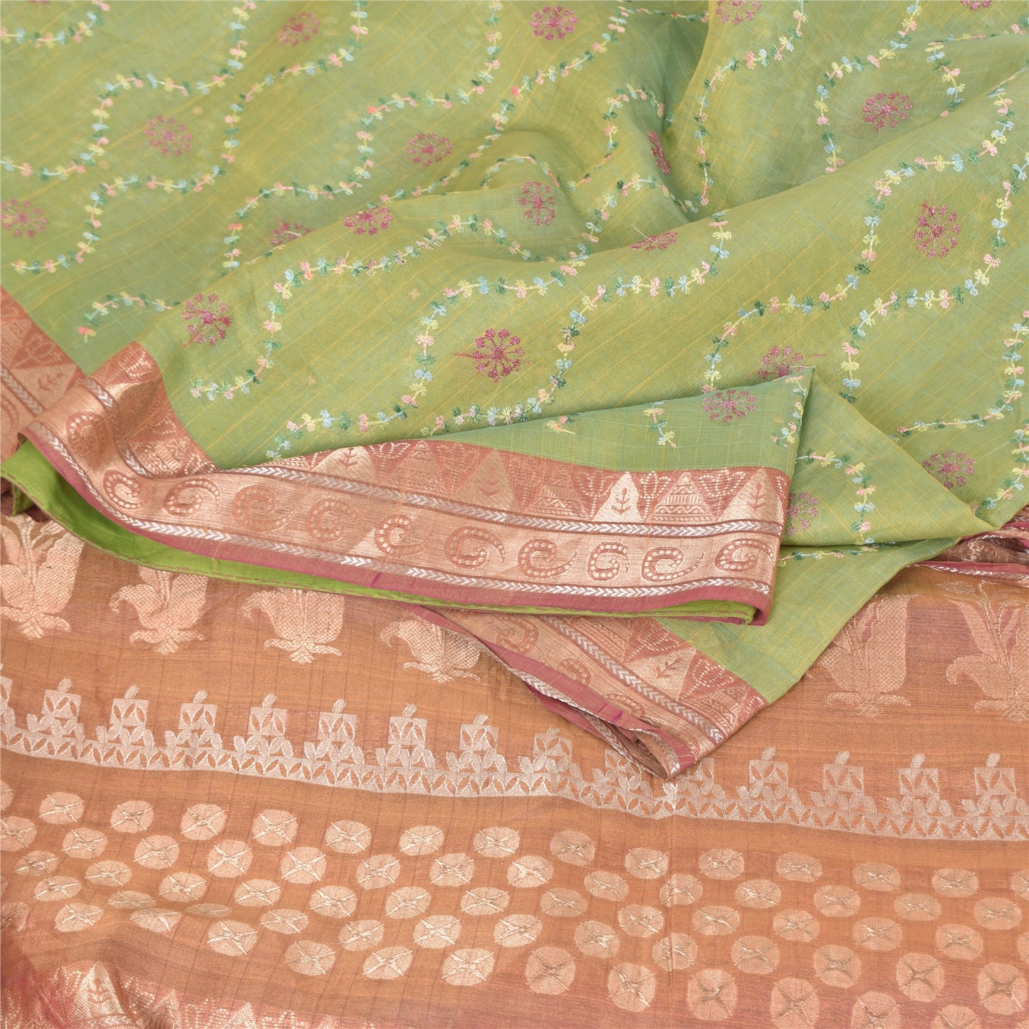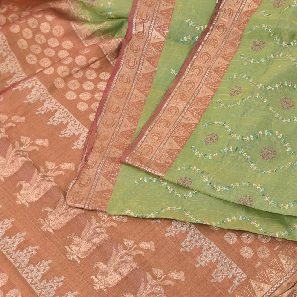 Sanskriti Vintage Green/Brown Sarees Pure Silk Embroidery Sari 5+yd Craft Sustainable Fabric