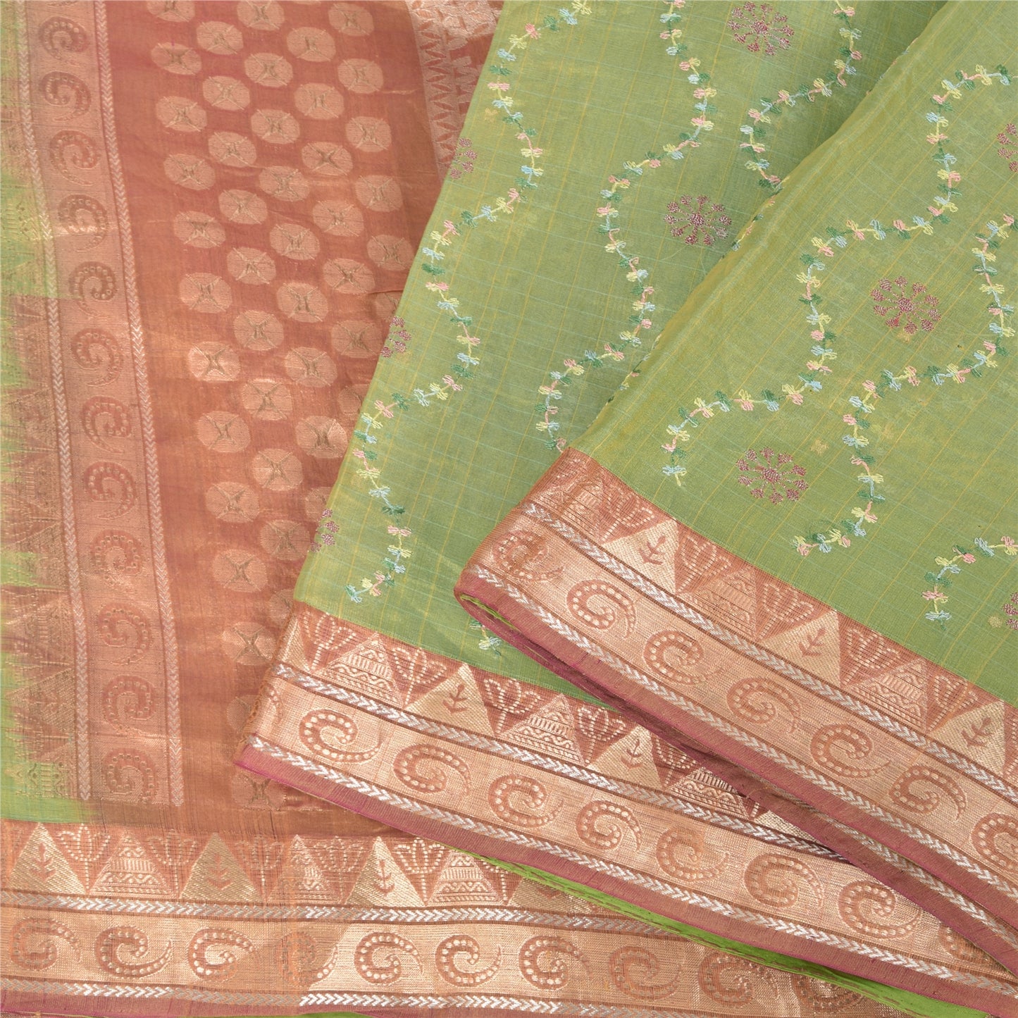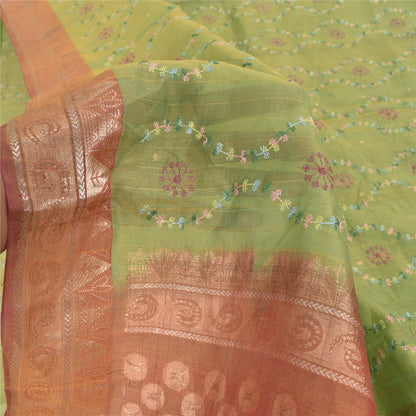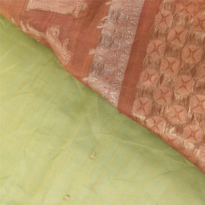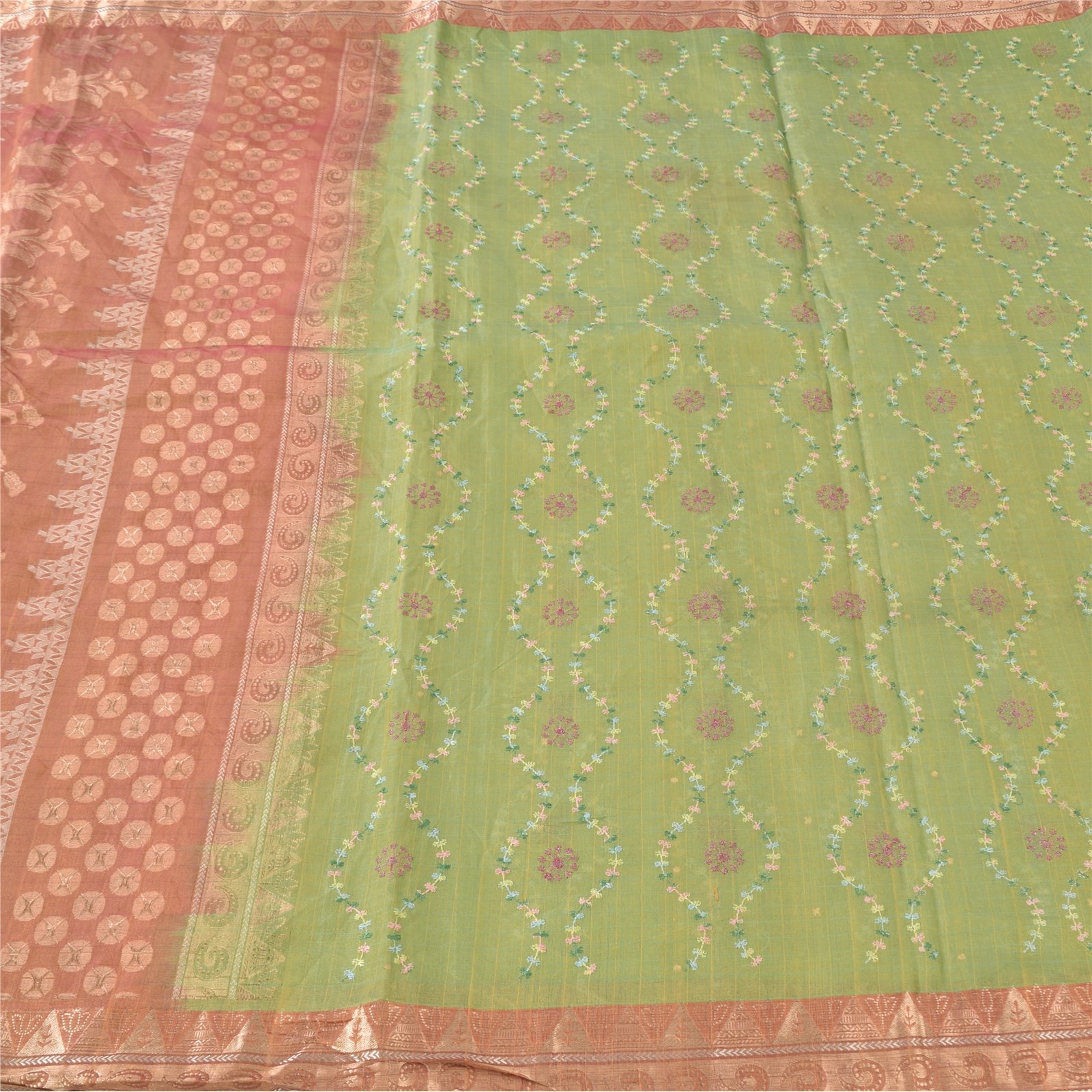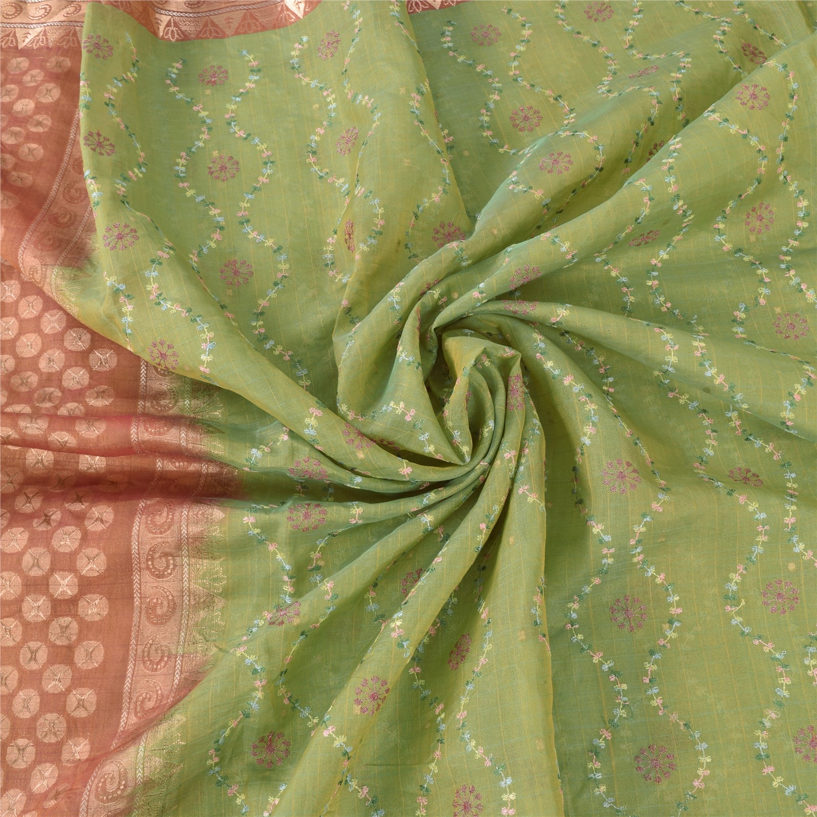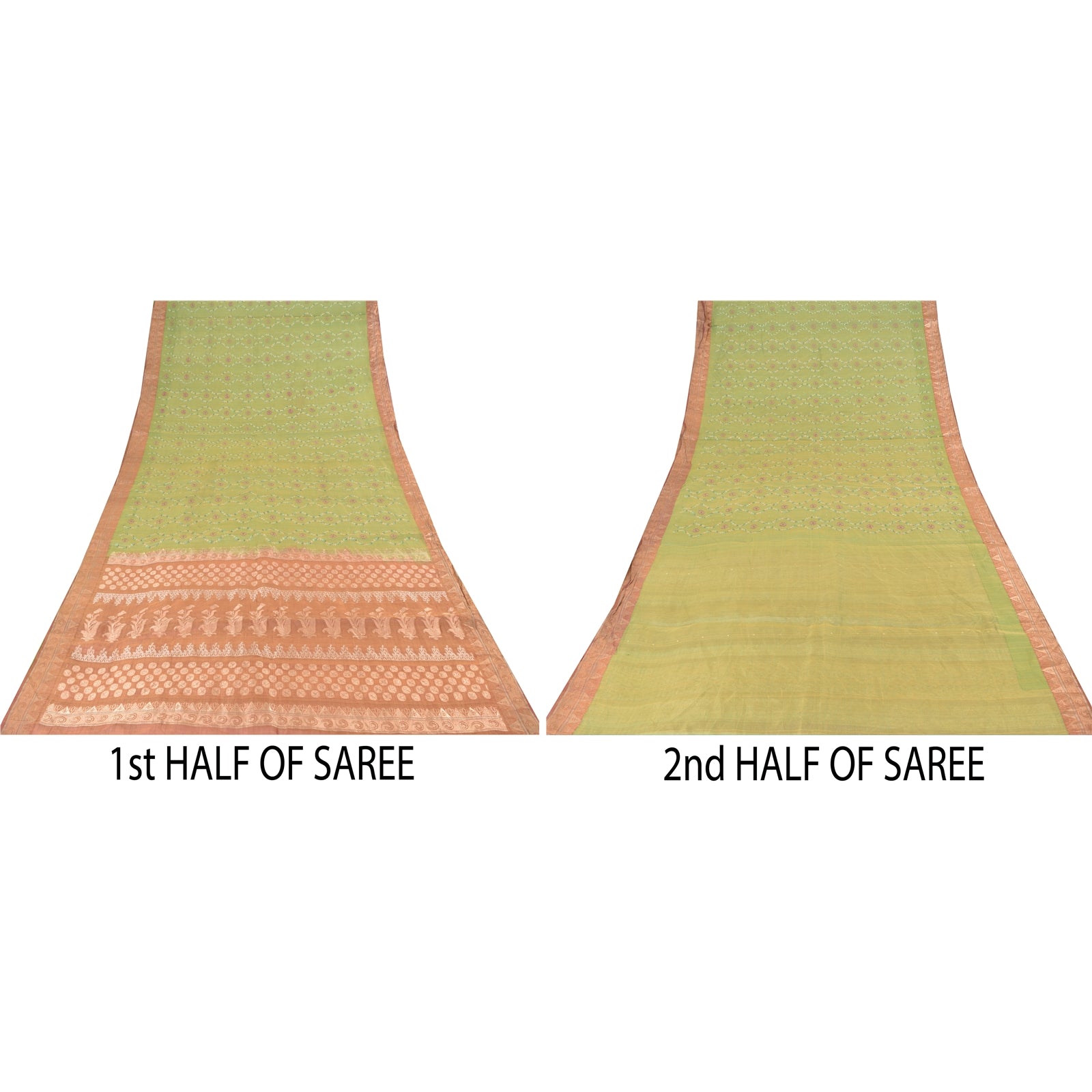 Sanskriti Vintage Green/Brown Sarees Pure Silk Embroidery Sari 5+yd Craft Sustainable Fabric