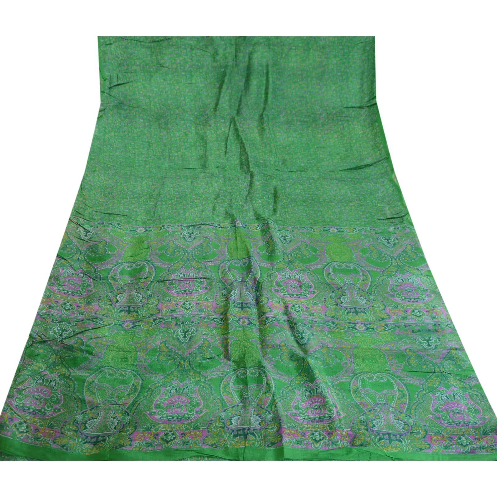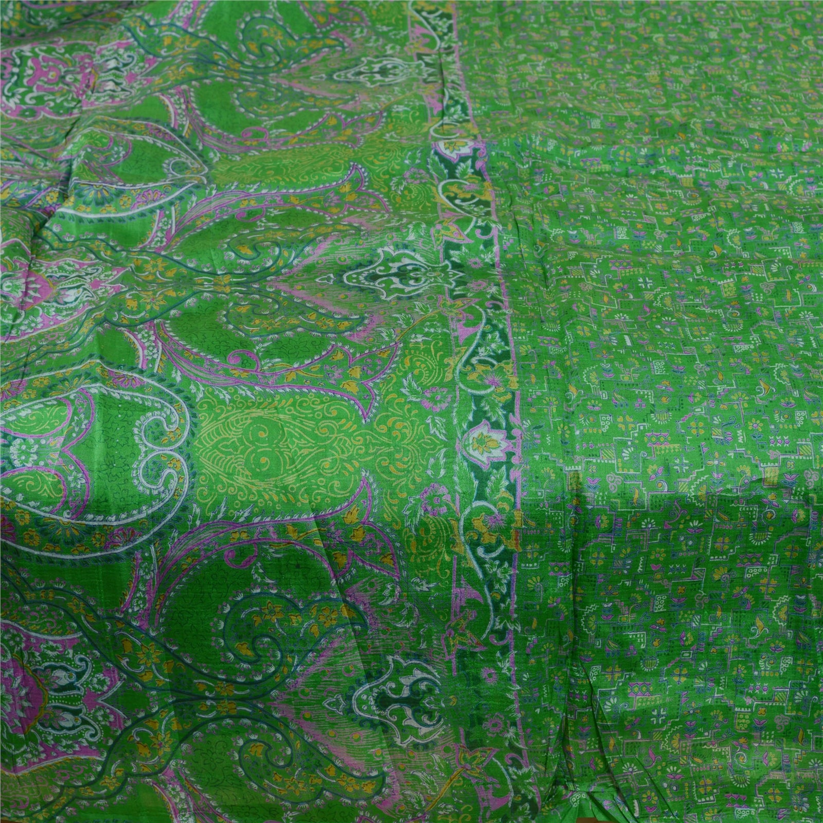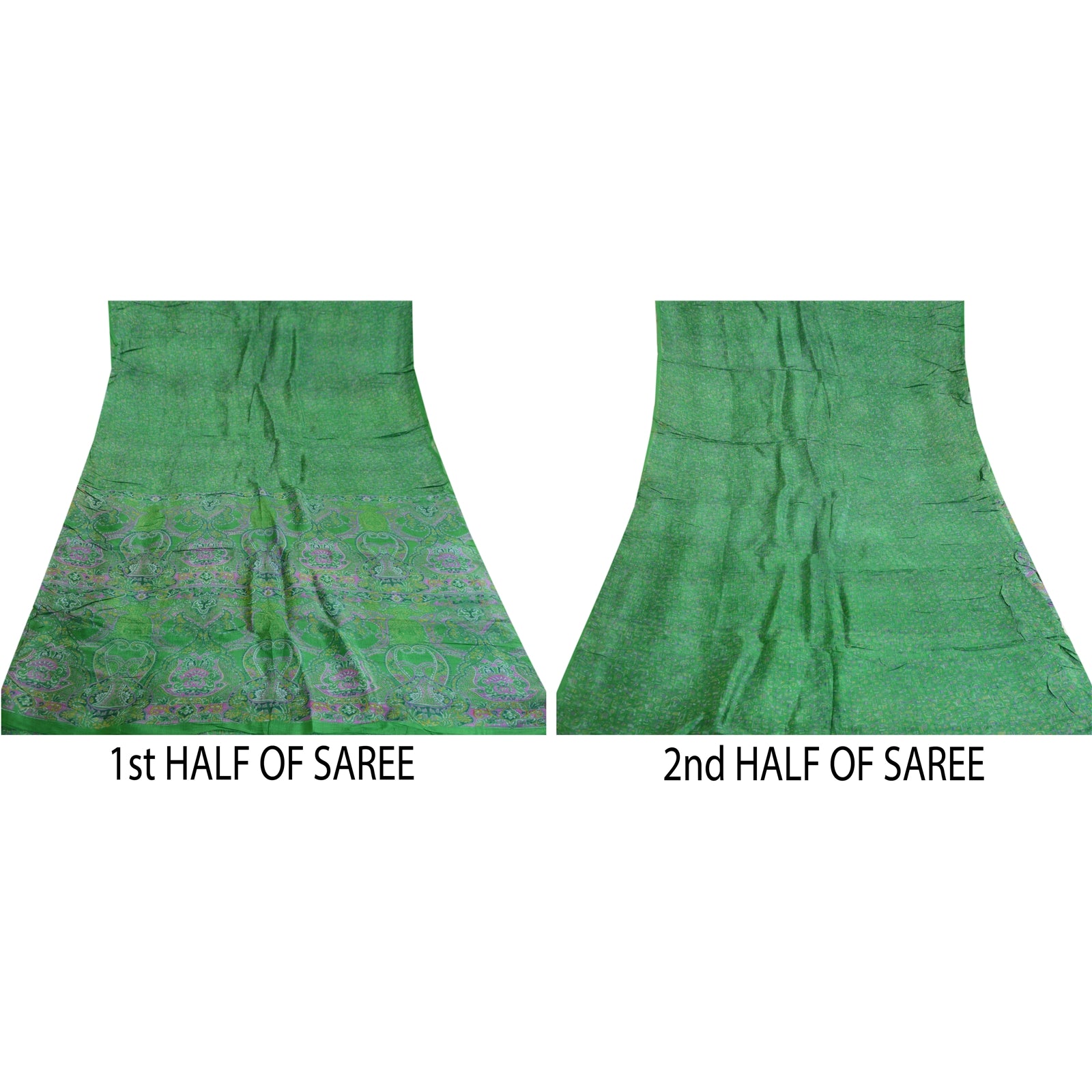 Sanskriti Vintage Green Printed Sarees 100% Pure Silk Sari Floral Craft Sustainable Fabric
