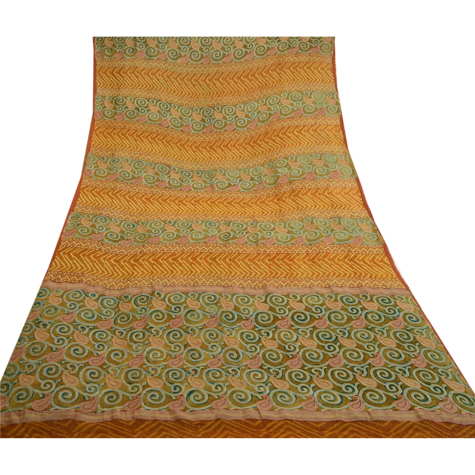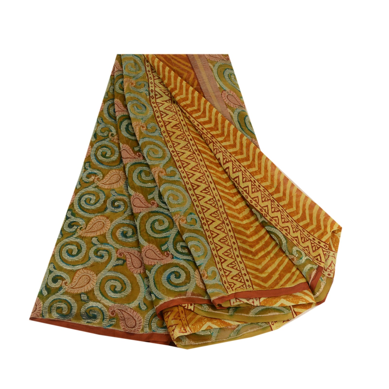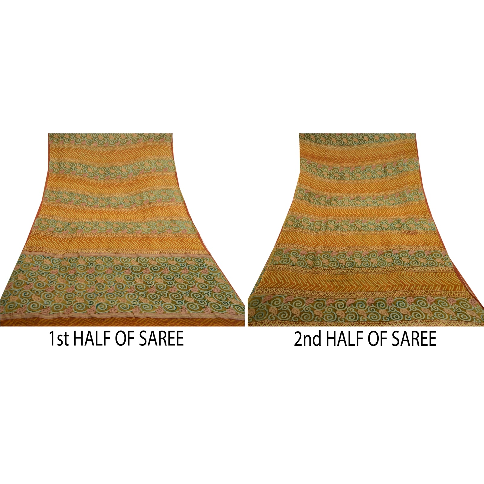 Beautiful green & shade of saffron colored 100% pure georgette silk printed saree. Pallu & Border has printed & woven work with floral & paisley design. The center part of saree has similar printed & woven floral pattern. This unique vintage saree can be used for various crafting ideas even if you don't want to use it as a sari. Design a dress, use it as window,dressing, upholstery, sarongs, throw, dress making and table linen much more. Let your creative juices flow and use this decorated Sustainable Fabric in multiple fashion.