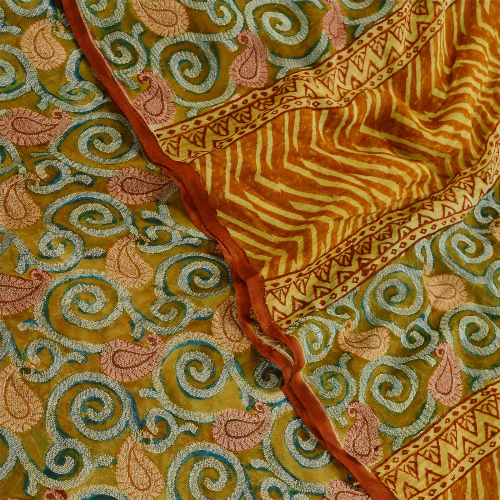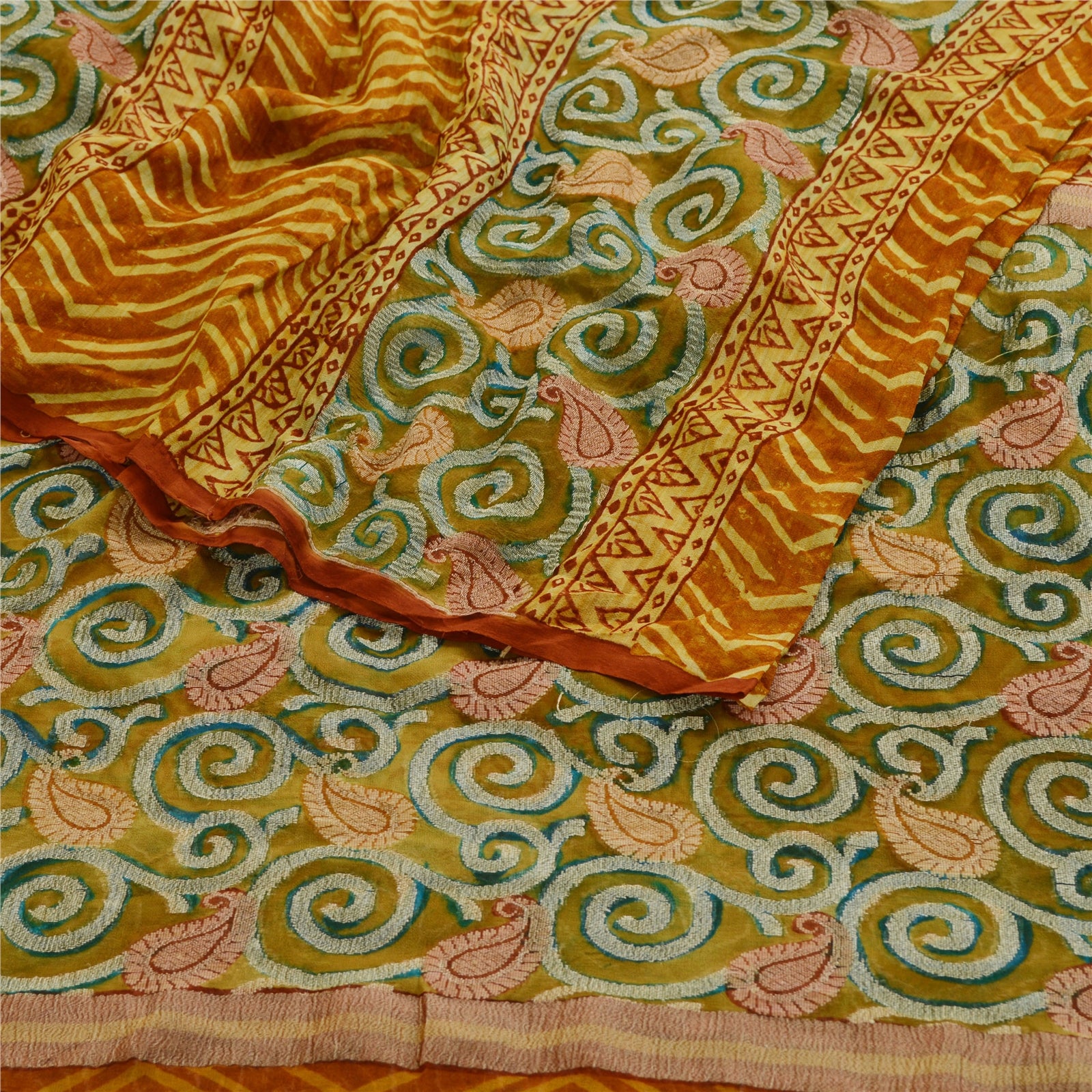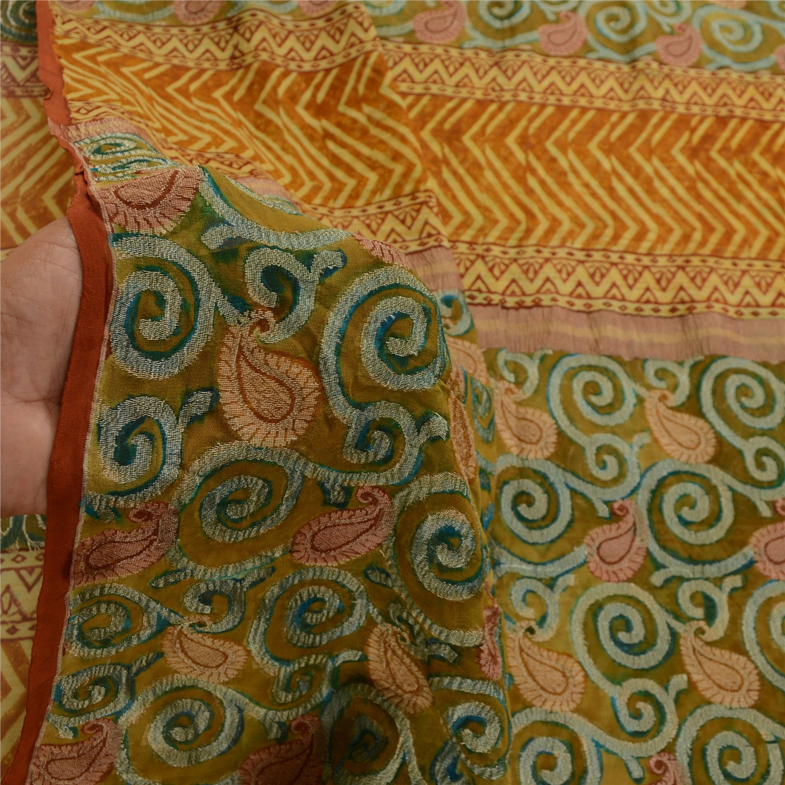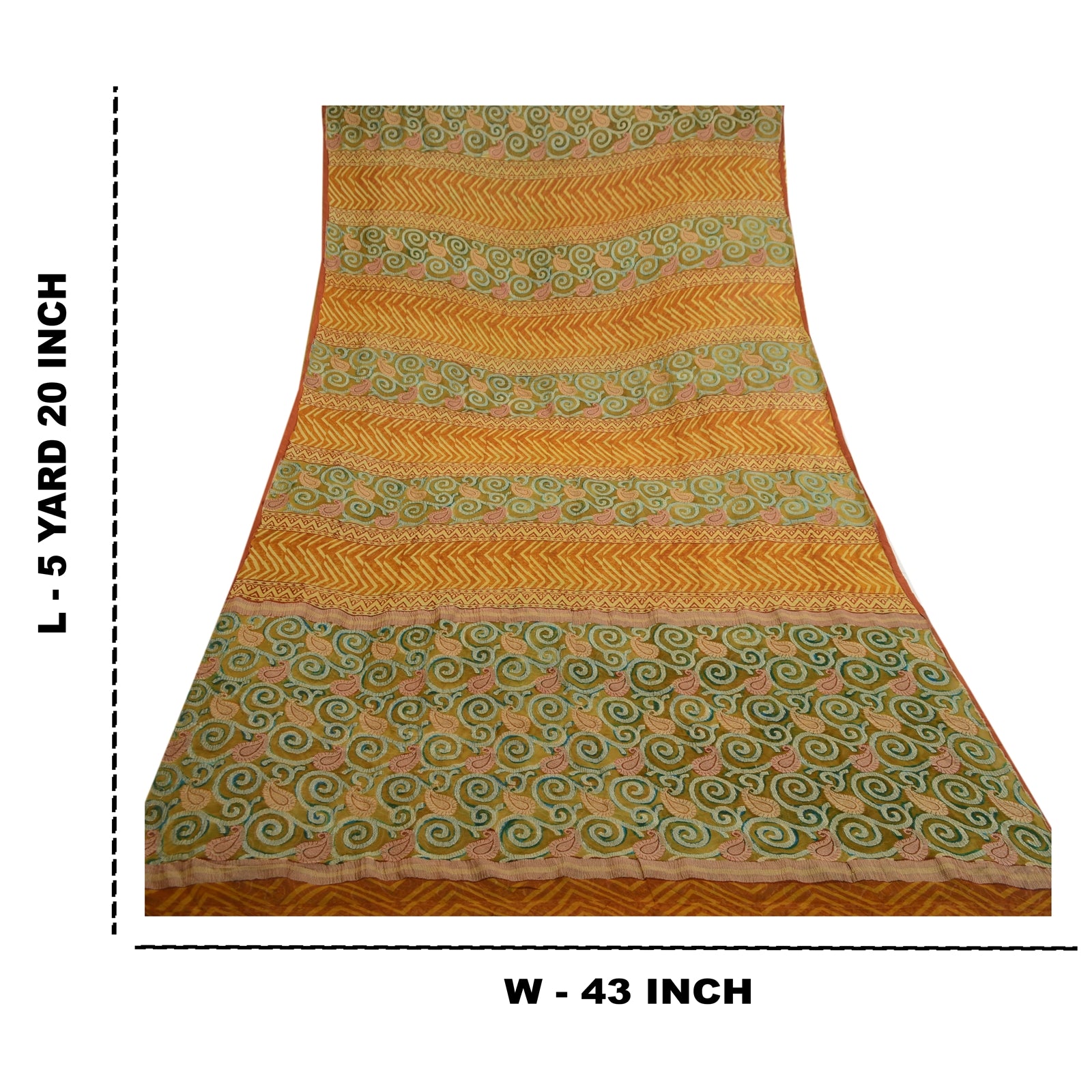 Beautiful green & shade of saffron colored 100% pure georgette silk printed saree. Pallu & Border has printed & woven work with floral & paisley design. The center part of saree has similar printed & woven floral pattern. This unique vintage saree can be used for various crafting ideas even if you don't want to use it as a sari. Design a dress, use it as window,dressing, upholstery, sarongs, throw, dress making and table linen much more. Let your creative juices flow and use this decorated Sustainable Fabric in multiple fashion.