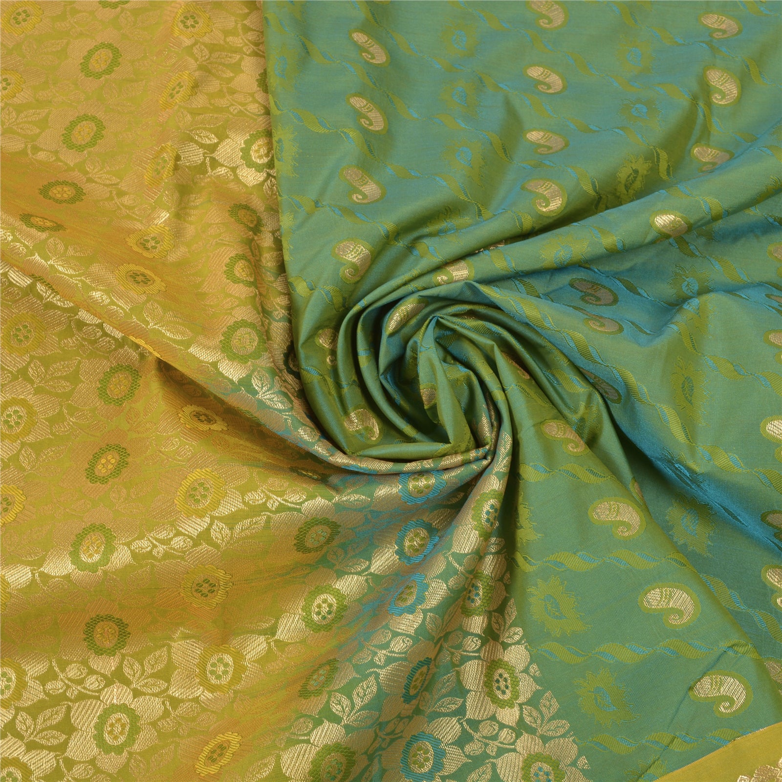 Sanskriti Offers This Vintage Shade of Green Woven Brocade/Banarasi Heavy Saree Which Is Crafted With Art (Artificial) Silk Base Sustainable Fabric The pallu & border sari features pure metallic golden zari work, green thread woven work with floral design. Yellow fringes on pallu. The center part of sari boasts golden zari and green thread woven work. This heavy saree can be used for various crafting ideas too. Use it for dress designing, as a throw, as window dressing, upholstery, table linen and much more. Let your creative juices flow! The quality of zari work is amazing, its a pure metallic zari. Some zari work gives a antique look.