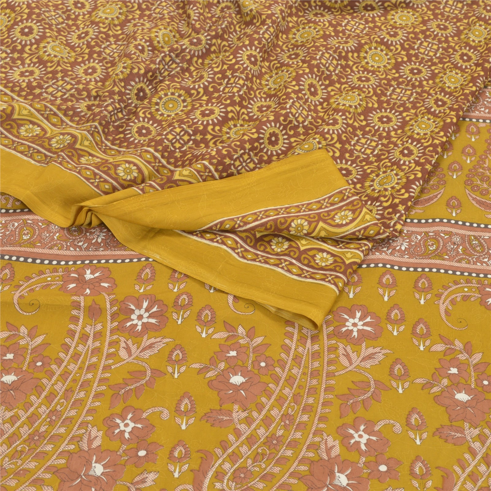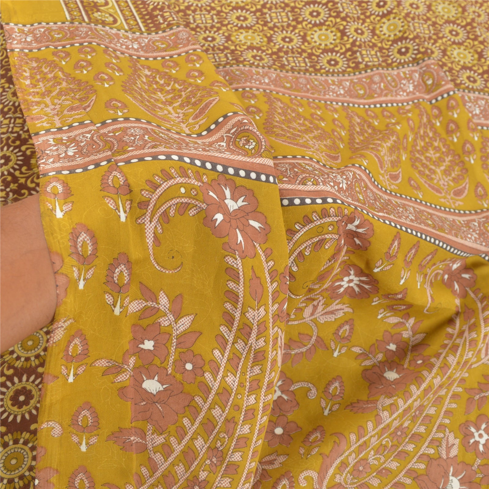 Gorgeous green colored printed moss crepe saree. Pallu & Border has printed floral design.Similar design in center part of saree. Moss Crepe-This sari is polyester but it feels like crepe silk.What is special about this saree?Very soft & smooth moss crepe Sustainable Fabric with attractive colorful print pattern is beauty of the saree.This unique vintage saree can be used for various crafting ideas even if you don't want to use it as a sari. Design a dress, use it as a throw, as window dressing, upholstery, sarongs, table linen and much more. Let your creative juices flow and use this decorated Sustainable Fabric in multiple fashion.