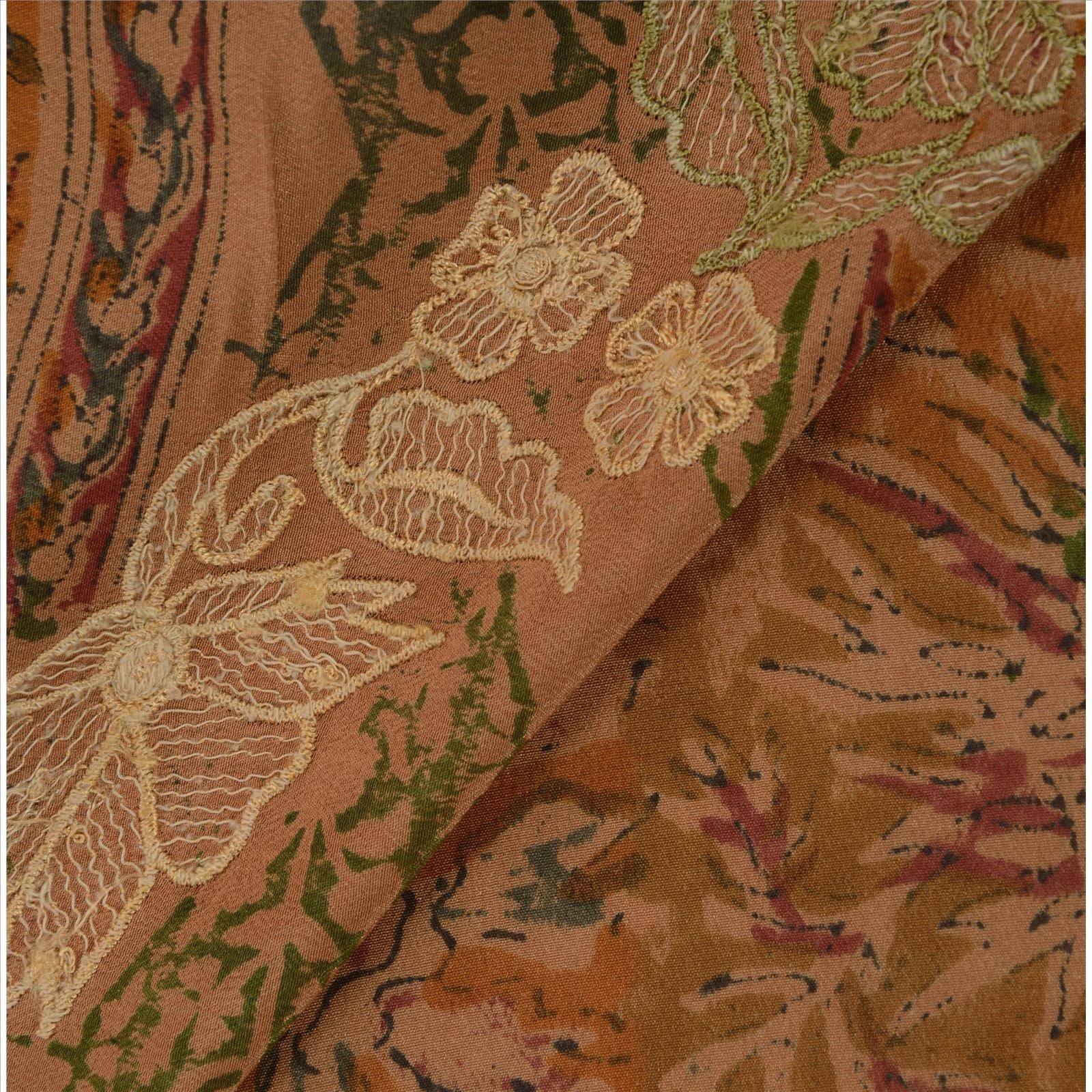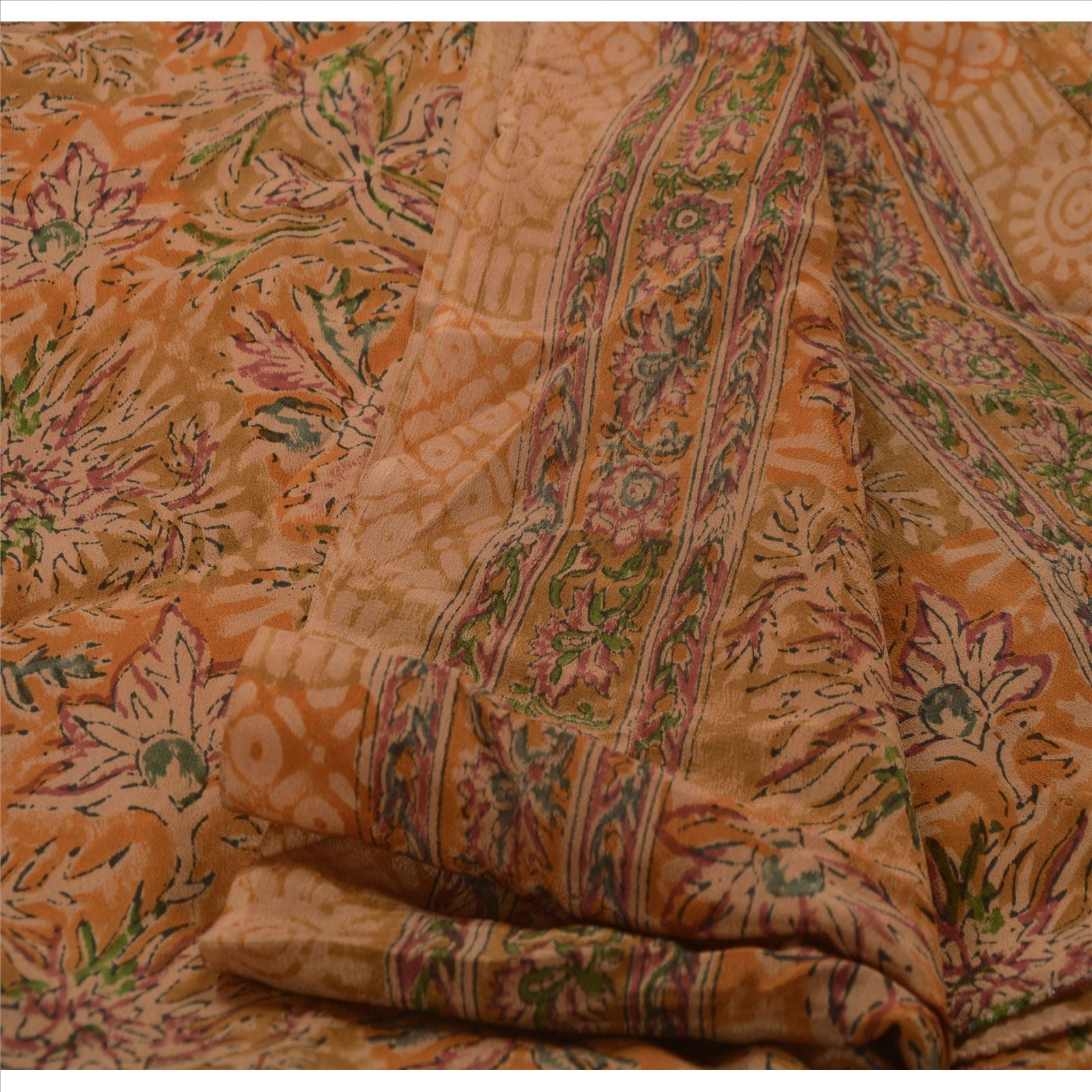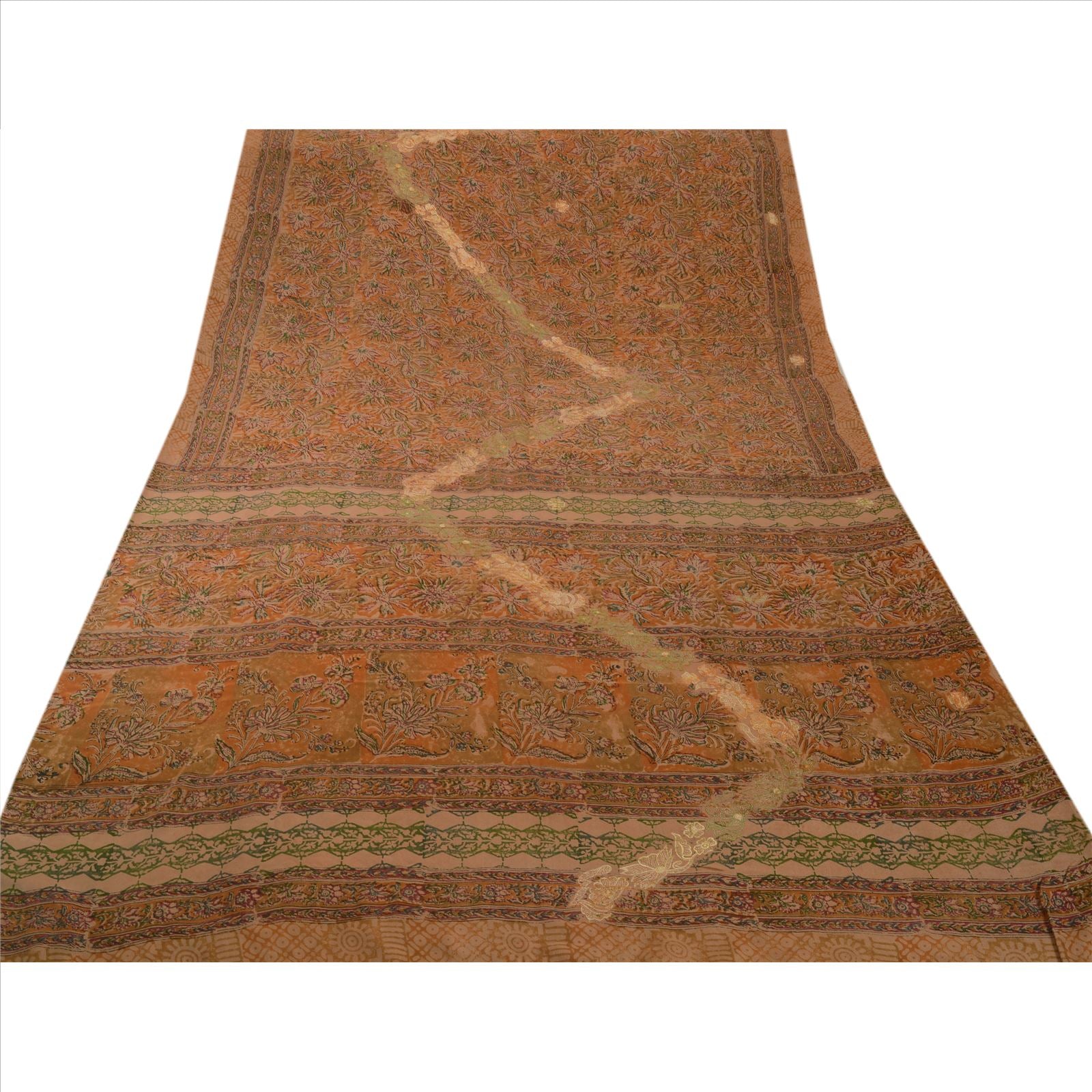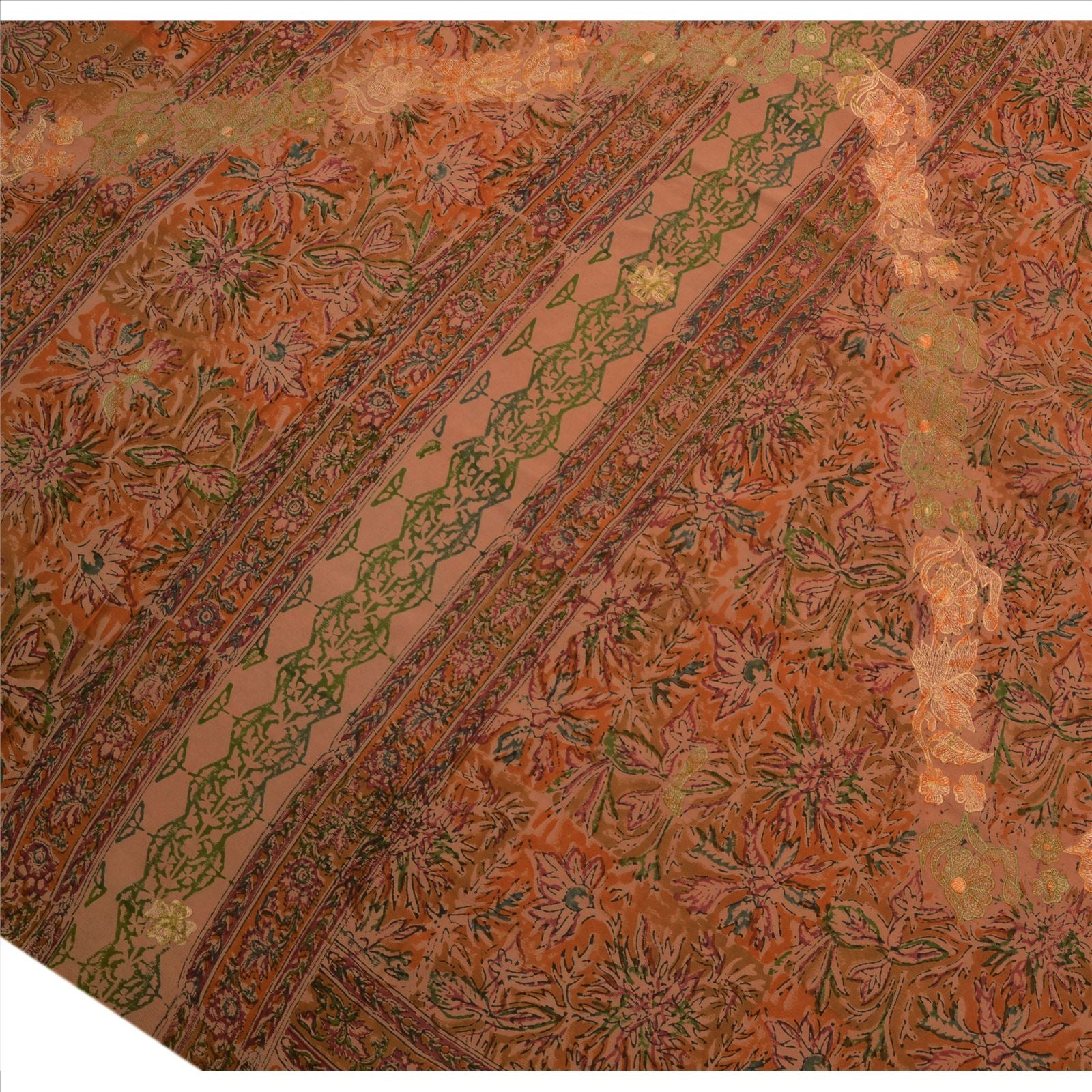 Beautiful peach colored embroidered printed pure crepe silk sari. Pallu & border features floral design embellished with green, cream thread work. There are floral motifs with similar work in center part of sari. This item's Beauty Factor Nice embroidery with printed work on peach color base Sustainable Fabric is really enhancing the beauty of the saree.
