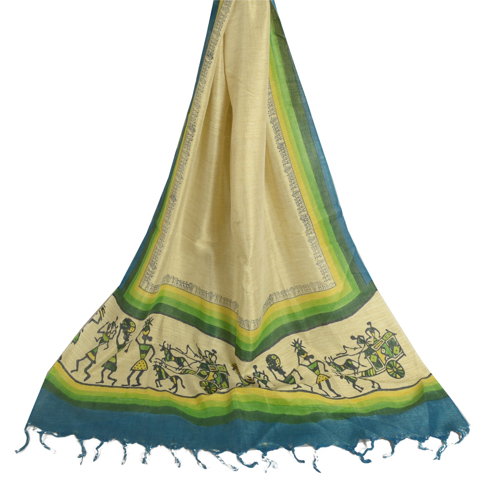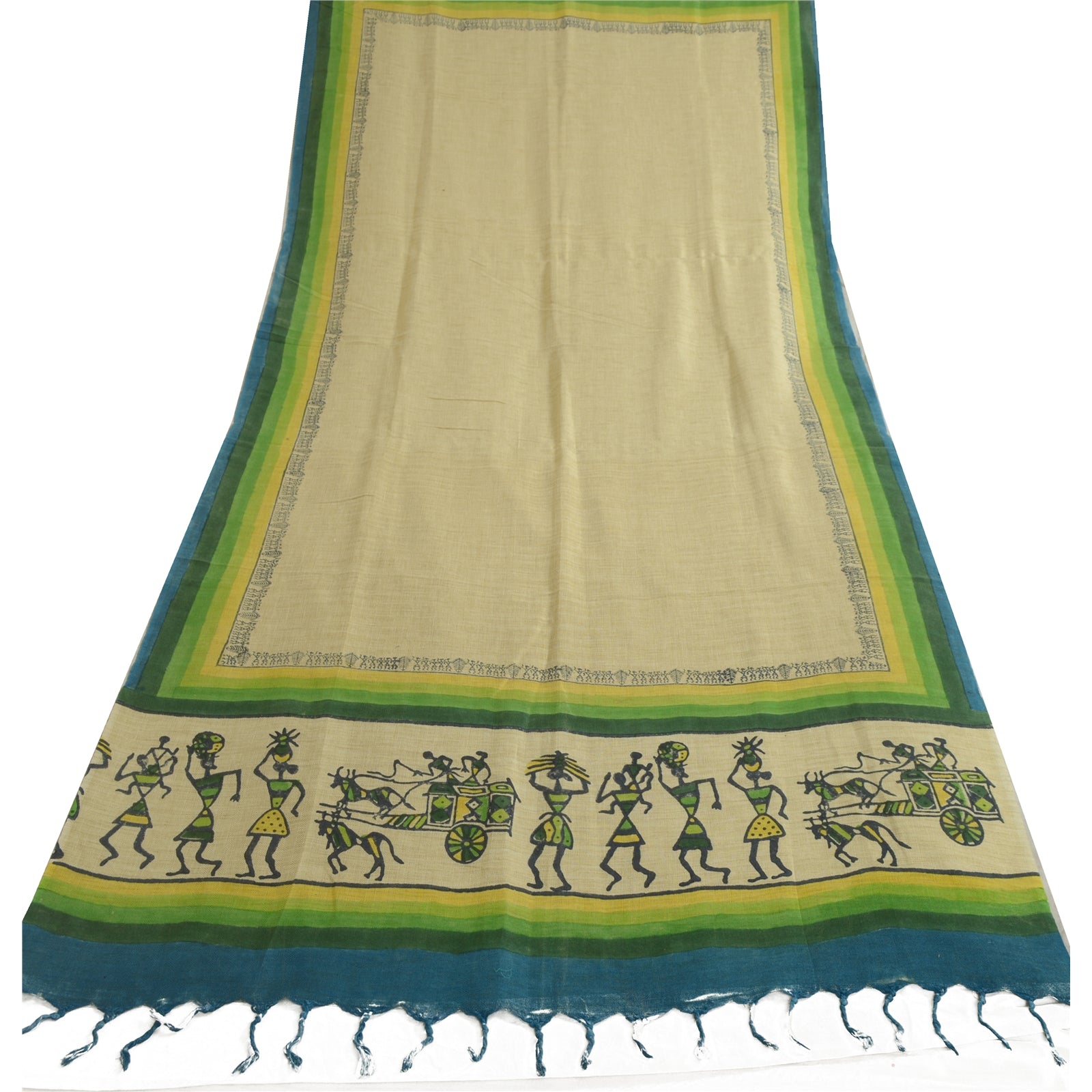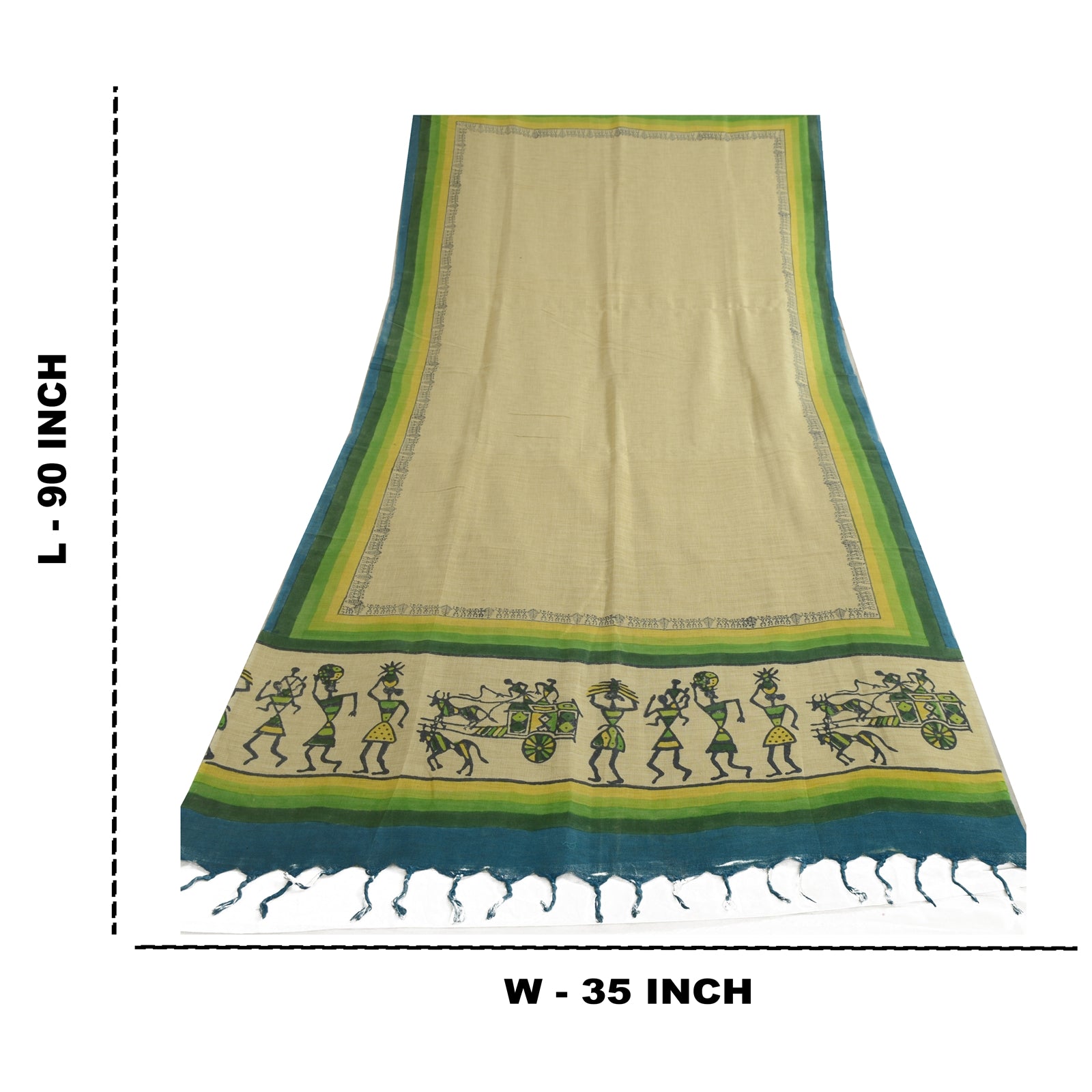 Sanskriti Vintage Long Dupatta Stole Pure Cotton Ivory/Green Warli Printed Shawl