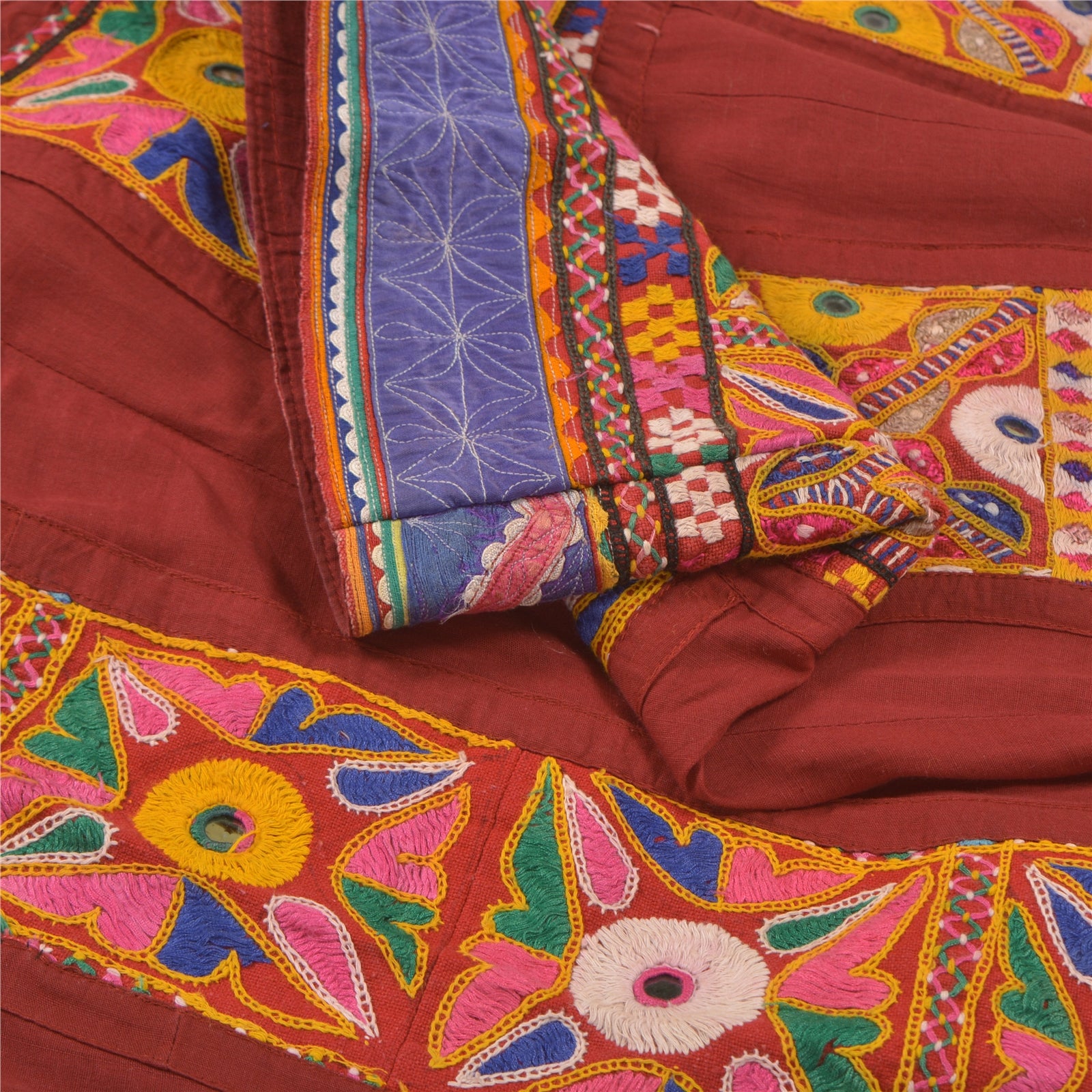 Sanskriti Offers This Traditional Vintage Dark Red Color hand Embroidered Kutch Work Stitched Long Skirt Made With 100% Pure Cotton Base Fabric. It is fully covered with thread work. Bottom of the skirt has hand embroidered floral design with maroon/blue fabric patch work and adorned with multi color thread work, mirror work. You can see similar thread & mirror work on center part of skirt. Flaunt this heavy skirt with ethnic tops, blouses or kurtis at parties, weddings and other occasions. Measurement of the skirt- Length-40 Width- 38 Flare-115 Hip Size-44 Inches. Adjustable Drawstring With Lovely Beaded Tassels Work Available For Your Comfort. Outstanding hand embroidered work skirt with beautiful craftsmanship which I am sure you will truly appreciate. For USA buyers - Single item ships via registered air mail, buy 1 more to get FedEx.