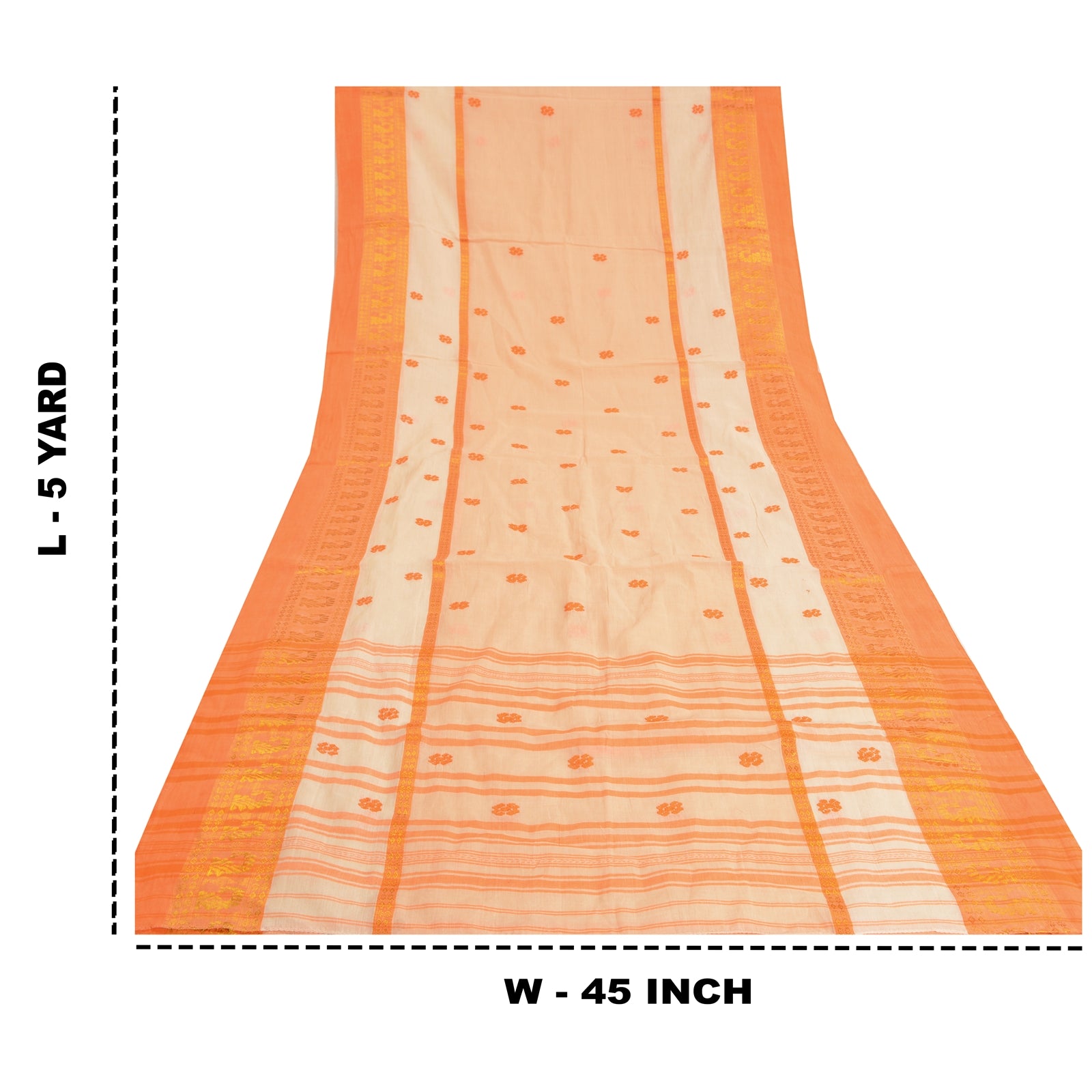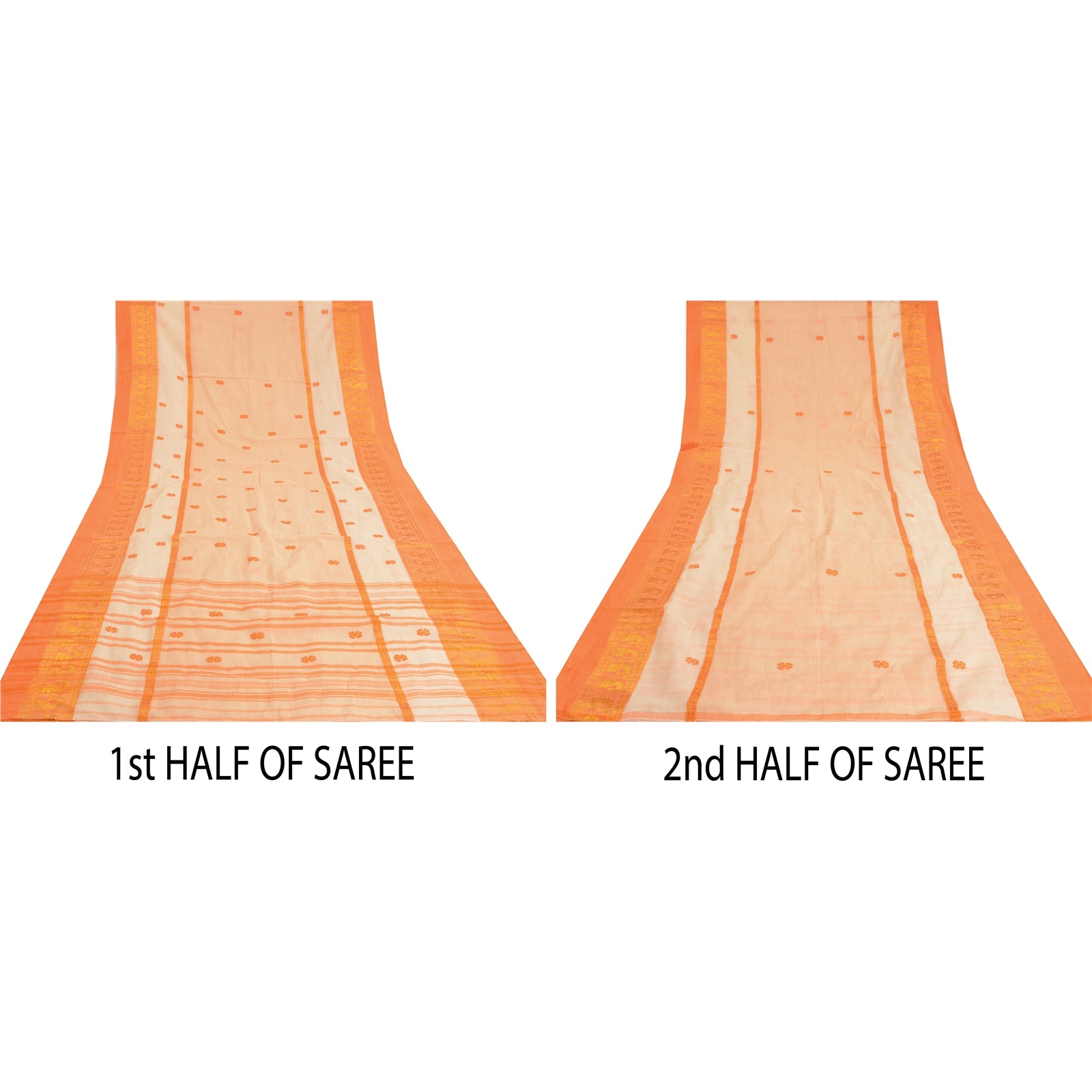 'THE ITEM COLOR OR SHADE MAY BE DARKER OR LIGHTER THAN THE PICTURE.' Beautiful shade of peach colored pure cotton hand-woven sari. Pallu & border has orange woven work with floral design. Also you can see golden zari woven work with floral design. The center of the saree has similar orange woven floral design. As the item is Vintage, some minor stains and defects are expected. This saree can be used for various crafting ideas too. Use it for dress designing, as a throw, as window dressing, upholstery, table linen and much more. Let your creative juices flow. 'International buyers please note: Import duties, taxes, and charges are not included in the item price or postage cost. These charges are the buyer's responsibility. Please check with your country's customs office to determine what these additional costs will be prior to bidding or buying. Buyer will pay custom duty/tax. It is calculated and charged differently by every country. As a seller I do not have any control over it. VAT or sales tax is calculated by the platform at the time of checkout. Customs charge is payable at the time of delivery.'