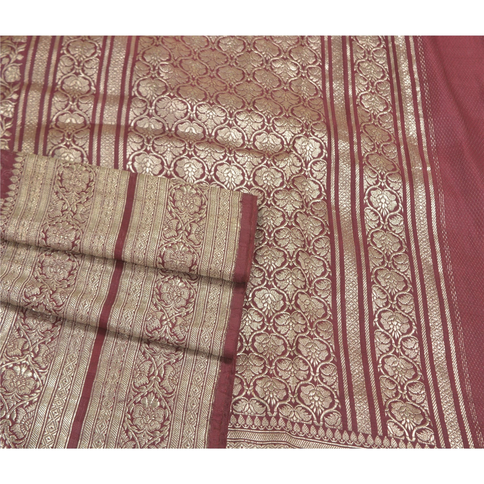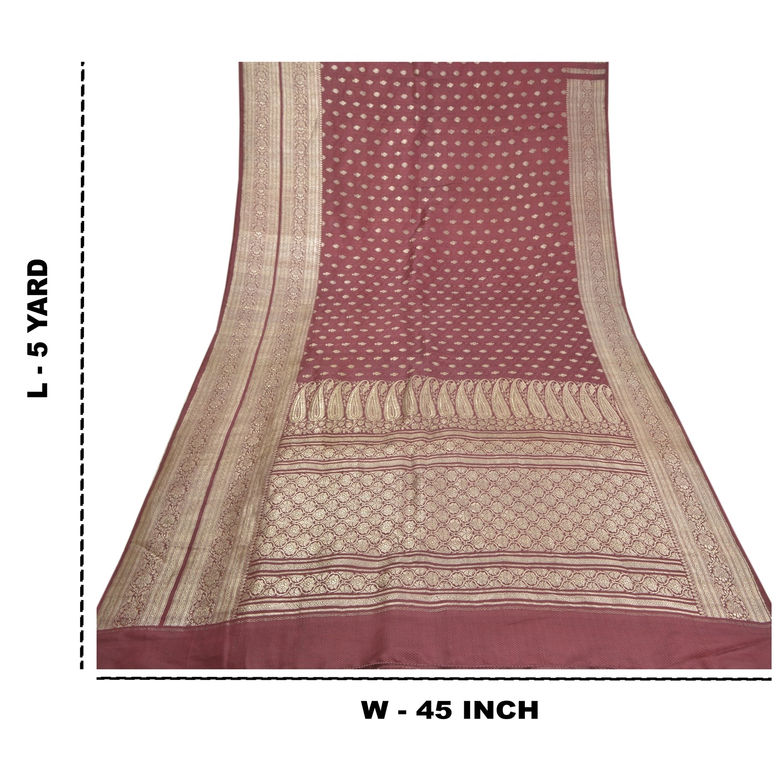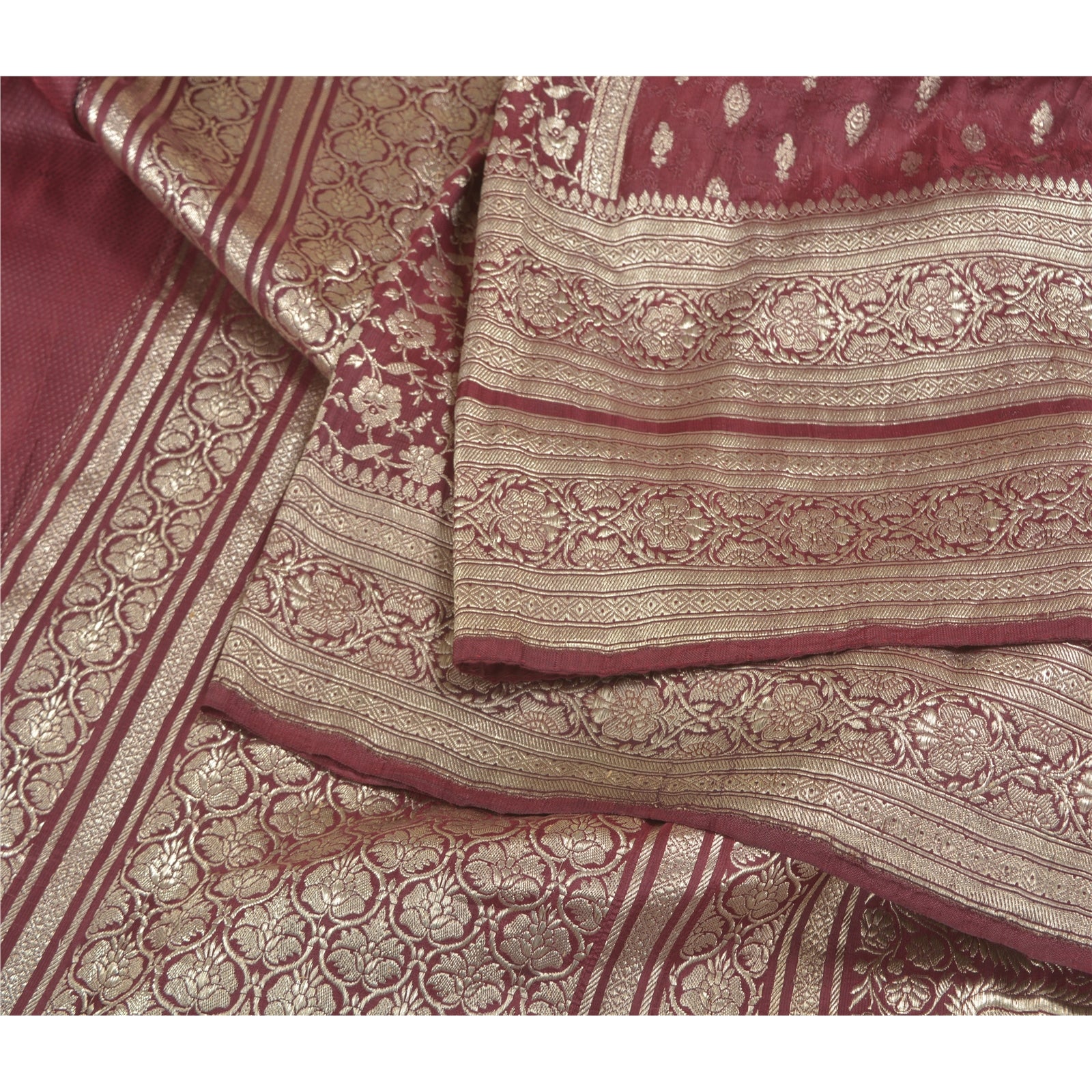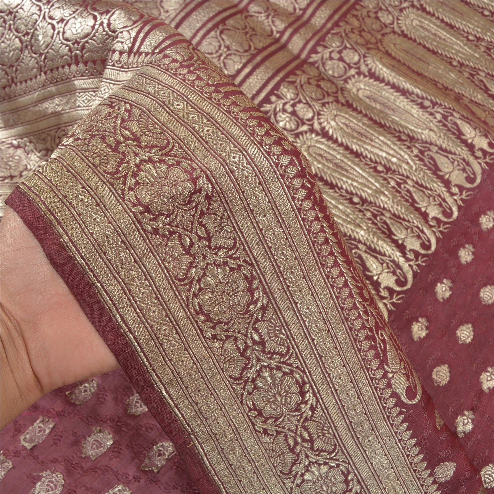 Sanskriti Offers This Vintage Shade Of Purple Color Woven Brocade/Banarasi Heavy Saree Which Is Crafted With 100% Pure Satin Silk Base Sustainable Fabric The pallu & border sari features floral design embellished with metallic golden color zari work. You can see woven zari work with floral design in center part of the sari.. This heavy saree can be used for various crafting ideas too. Use it for dress designing, as a throw, as window dressing, upholstery, table linen and much more. Let your creative juices flow! For USA buyers - Single item ships via registered air mail, buy 1 more to get FedEx. BROCADE:The tradition of brocade manufacture was prevalent in many centers in India such as Ahmedabad and Surat in the west. Paithan, Aurangabad, Raichur, Murshidabad, Delhi, Lucknow, Tanjore, Tiruchirapalli and Madras were other areas of Brocade production. Nevertheless Banaras brocades stand out as overwhelmingly towering both in style and execution. The word brocade is derived from the Latin word ‘Bronchus’ denoting ‘to stab’ or to ‘transfix’. Brocade designs may be Tasvir or pictorial theme, Phulwar a floral design, Butidar, Geometrical Pattern, Shikargah or hunting scenes.