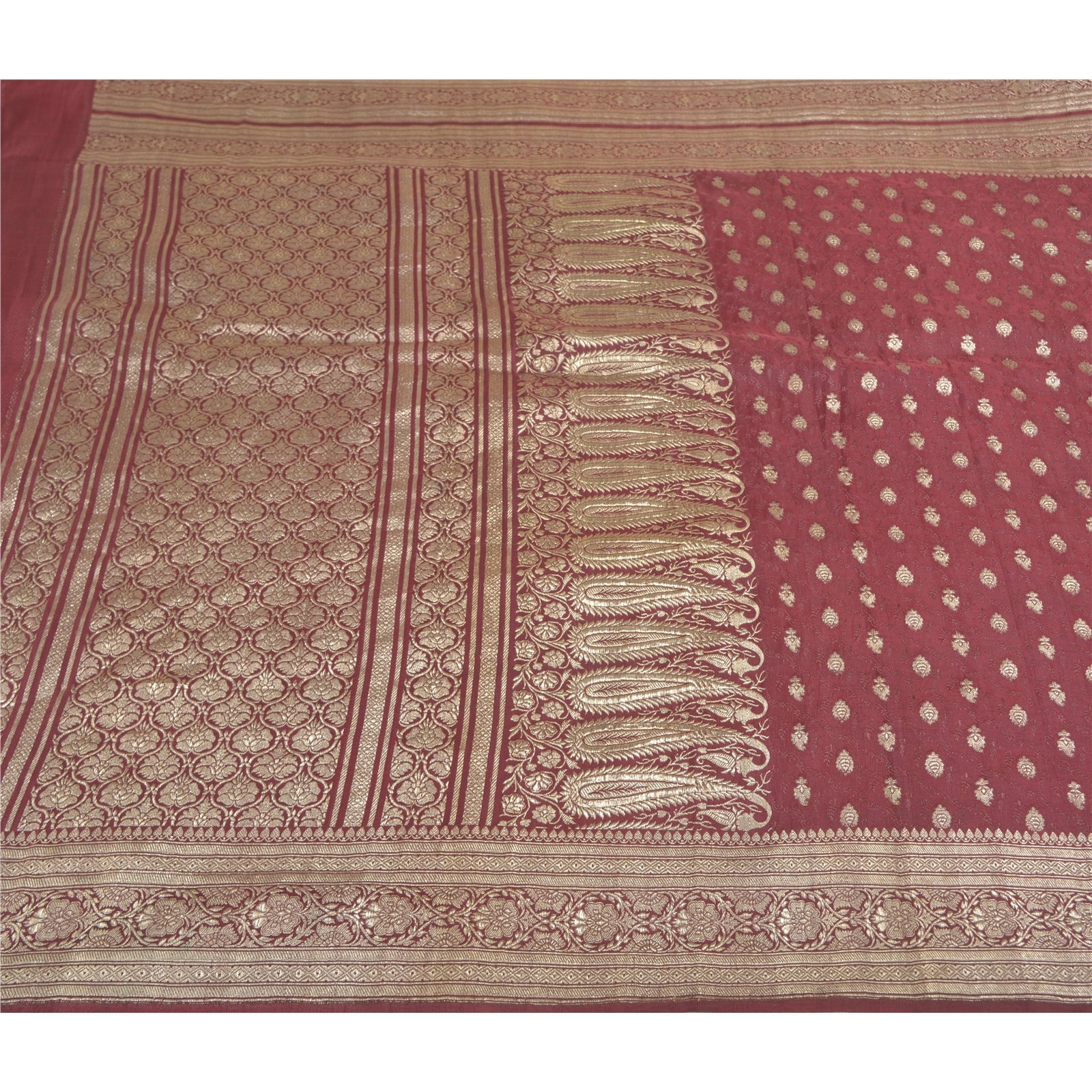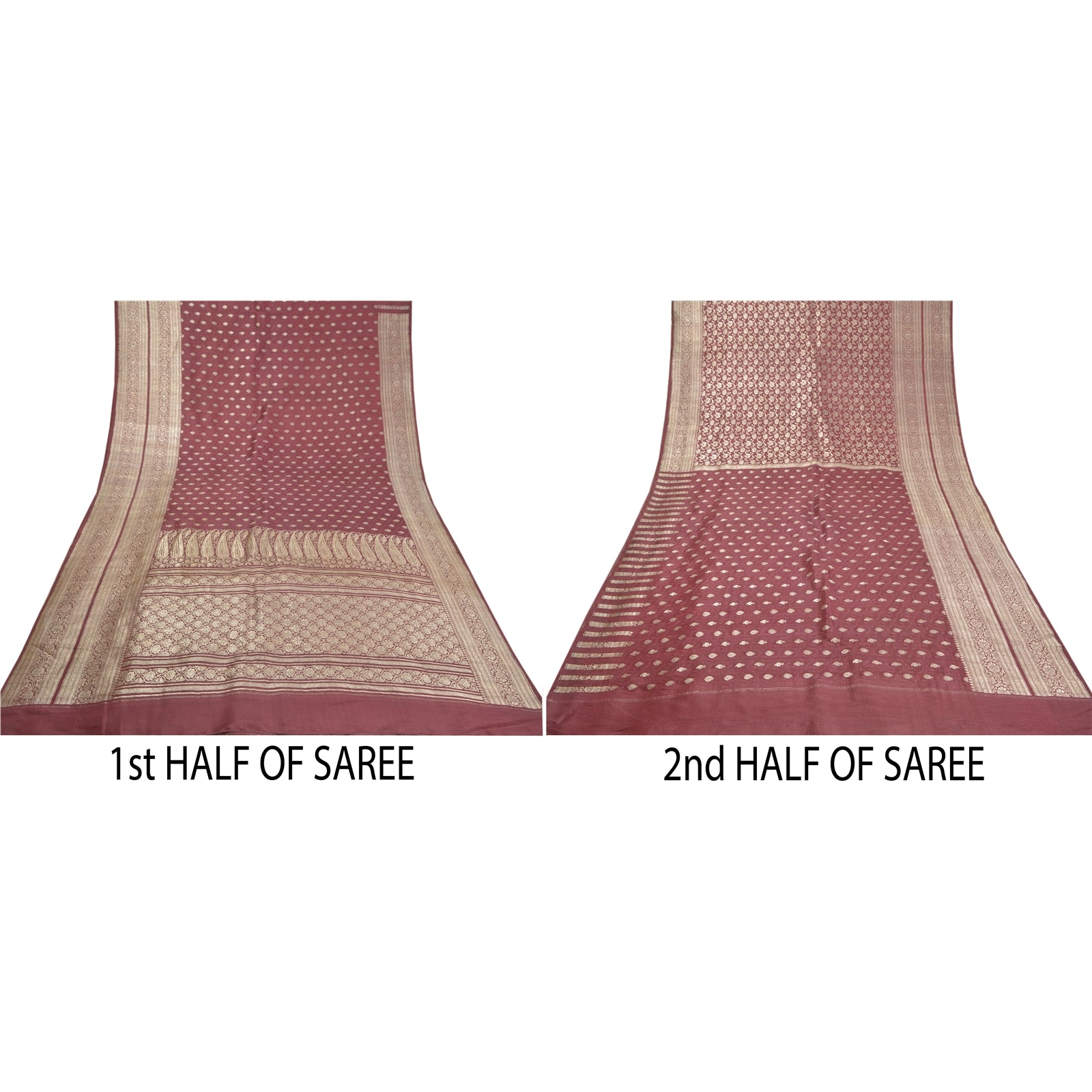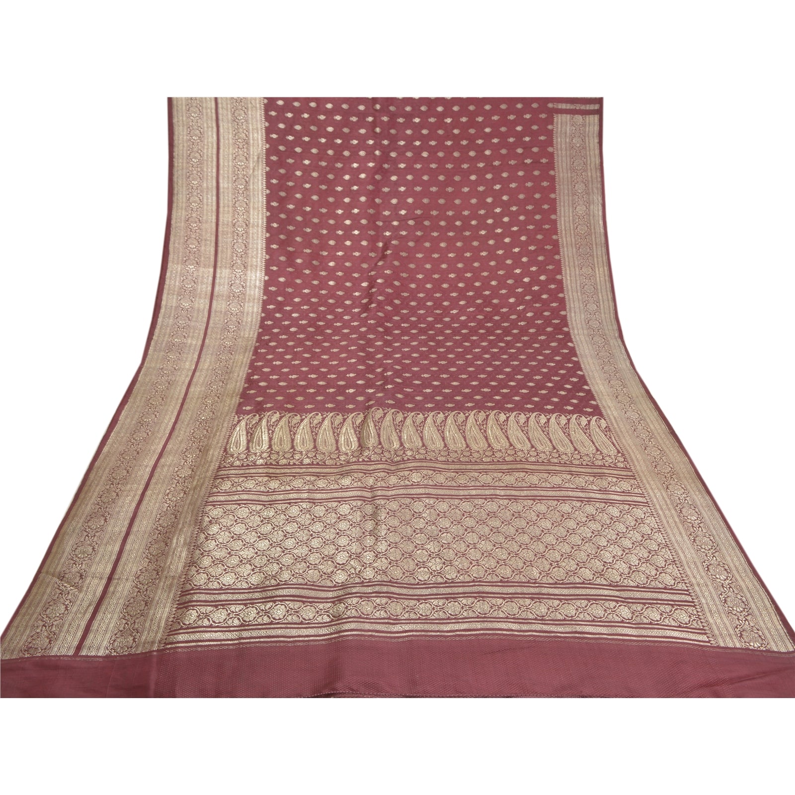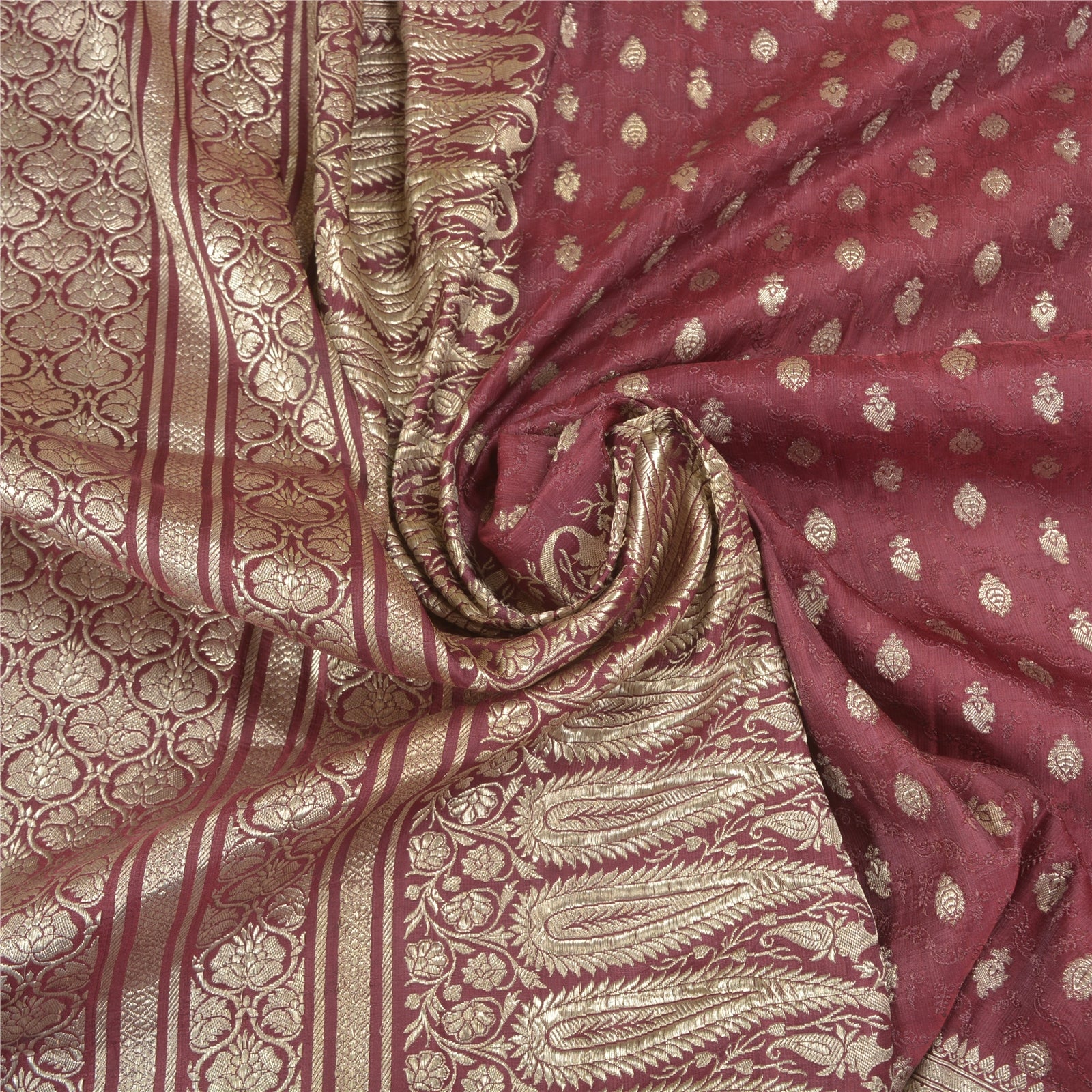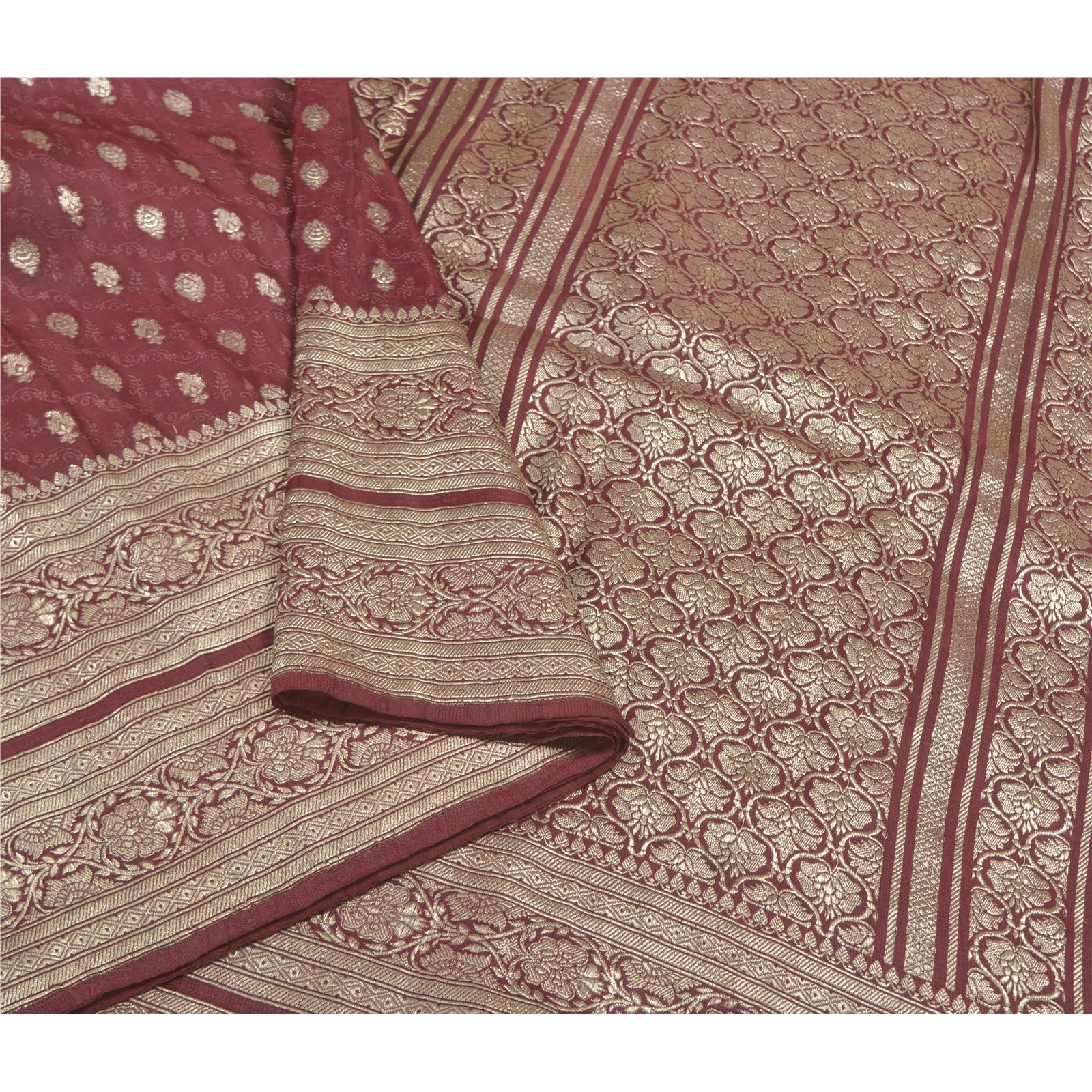 Sanskriti Offers This Vintage Shade Of Purple Color Woven Brocade/Banarasi Heavy Saree Which Is Crafted With 100% Pure Satin Silk Base Sustainable Fabric The pallu & border sari features floral design embellished with metallic golden color zari work. You can see woven zari work with floral design in center part of the sari.. This heavy saree can be used for various crafting ideas too. Use it for dress designing, as a throw, as window dressing, upholstery, table linen and much more. Let your creative juices flow! For USA buyers - Single item ships via registered air mail, buy 1 more to get FedEx. BROCADE:The tradition of brocade manufacture was prevalent in many centers in India such as Ahmedabad and Surat in the west. Paithan, Aurangabad, Raichur, Murshidabad, Delhi, Lucknow, Tanjore, Tiruchirapalli and Madras were other areas of Brocade production. Nevertheless Banaras brocades stand out as overwhelmingly towering both in style and execution. The word brocade is derived from the Latin word ‘Bronchus’ denoting ‘to stab’ or to ‘transfix’. Brocade designs may be Tasvir or pictorial theme, Phulwar a floral design, Butidar, Geometrical Pattern, Shikargah or hunting scenes.