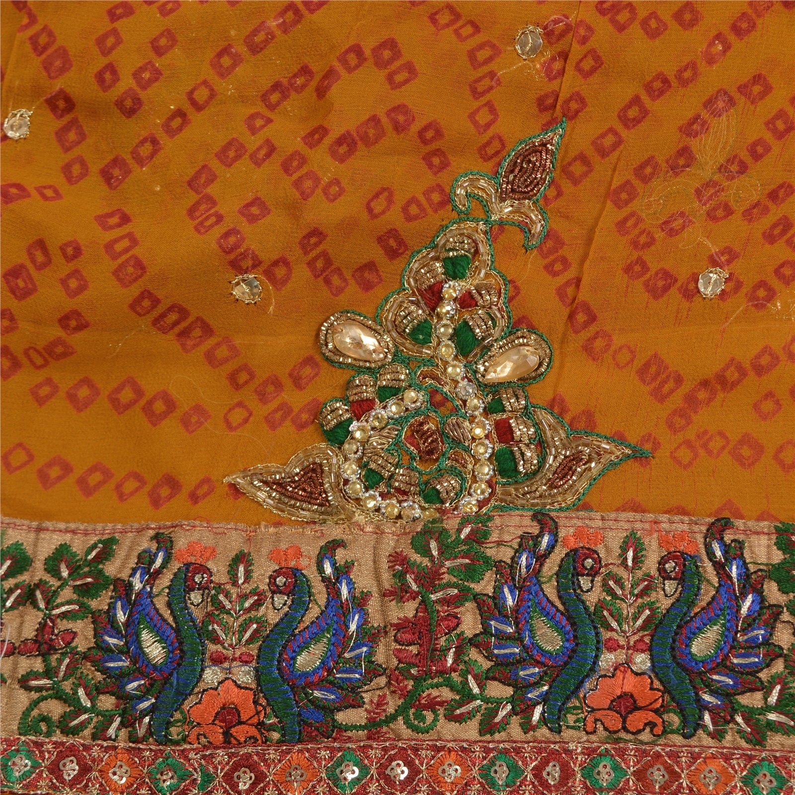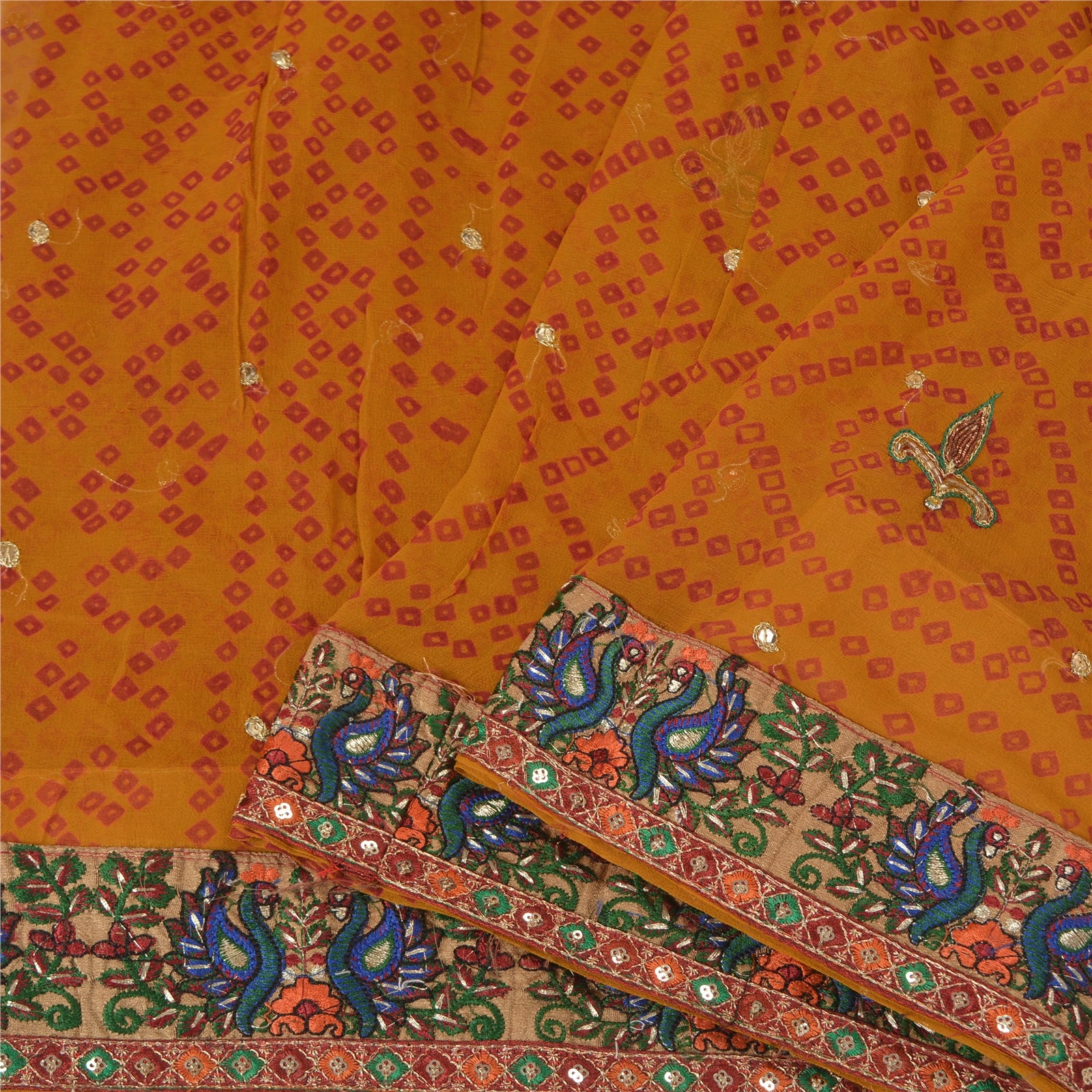 Beautiful Shade Of Saffron Colored 100% Pure Georgette (Silk) Hand Embroidered Bandhani Sari. Pallu has Bandhani tiny square design embellished with golden zari/dabka work, yellow rhinestones, golden sequins work. Also you can see embroidered Sustainable Fabric patch work with peacock & floral design. The center portion of saree has Bandhani work with thread & beads work. This saree can be used for various crafting ideas too. Use it for dress designing, as a throw, as window dressing, upholstery, table linen and much more. Let your creative juices flow. International buyers please note: Import duties, taxes, and charges are not included in the item price or postage cost. These charges are the buyer's responsibility. Please check with your country's customs office to determine what these additional costs will be prior to bidding or buying. Buyer will pay custom duty/tax. It is calculated and charged differently by every country. As a seller I do not have any control over it.VAT or sales tax is calculated by the platform at the time of checkout. Customs charge is payable at the time of delivery.