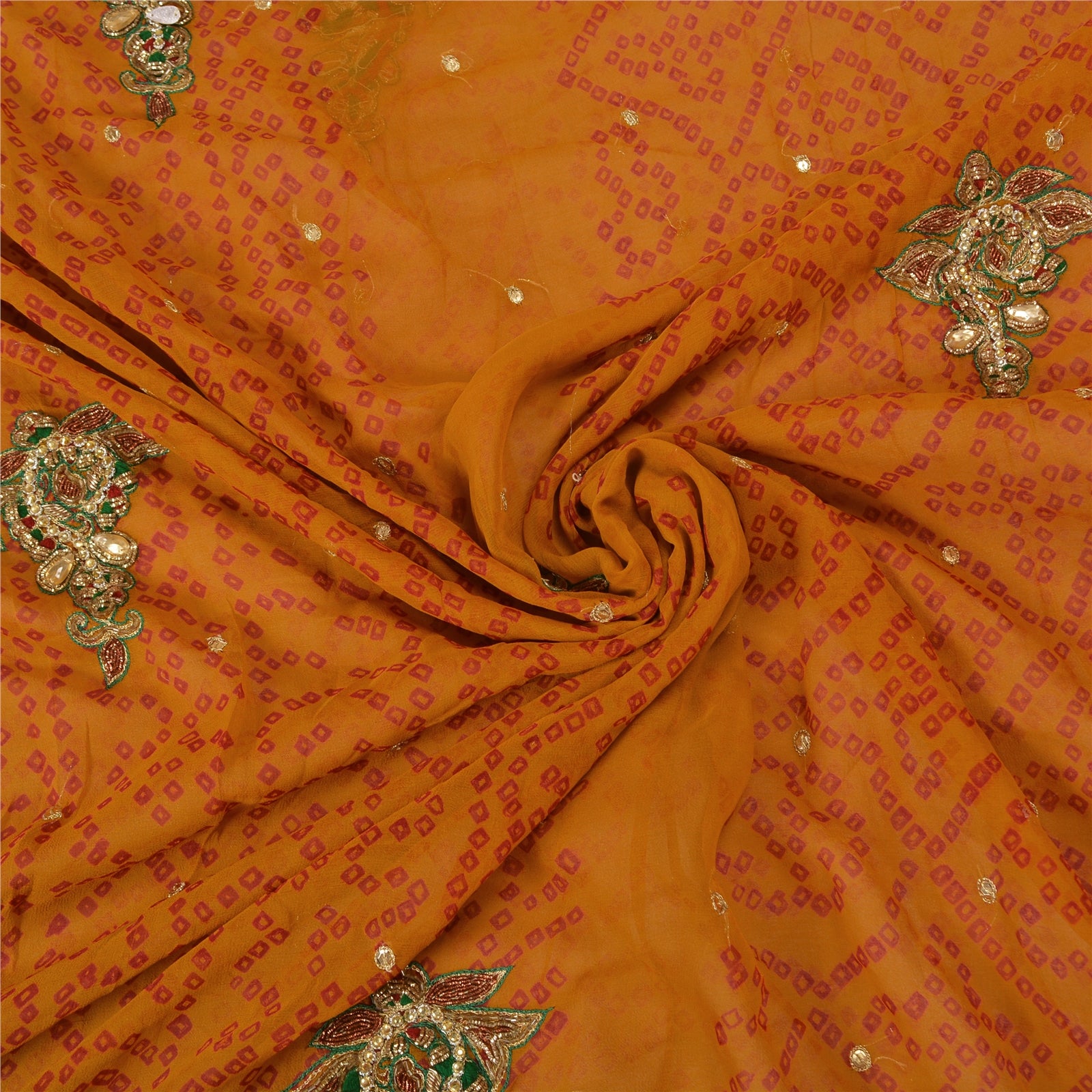 Sanskriti Vintage Saffron Sarees Pure Georgette Hand Beads Bandhani Sari Sustainable Fabric