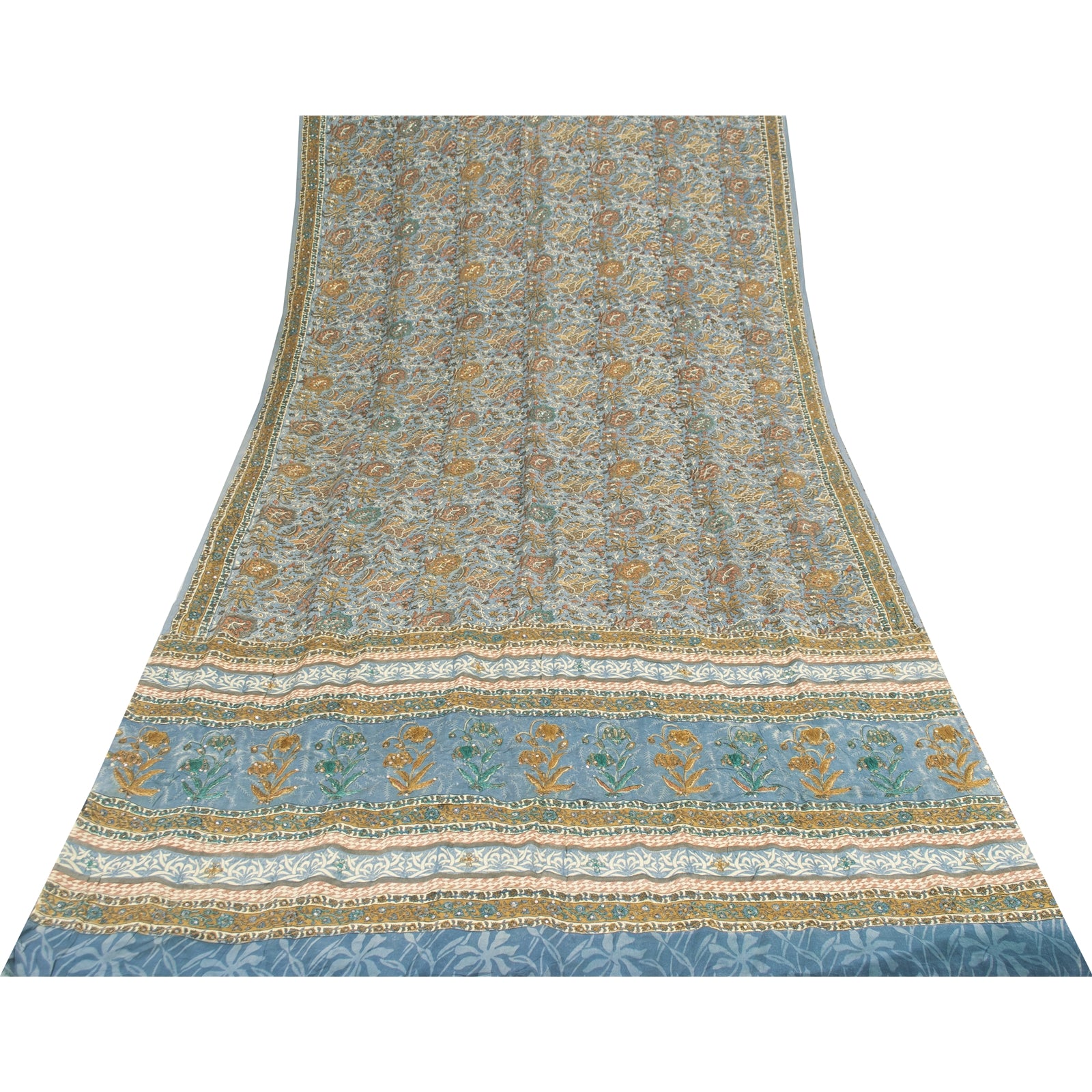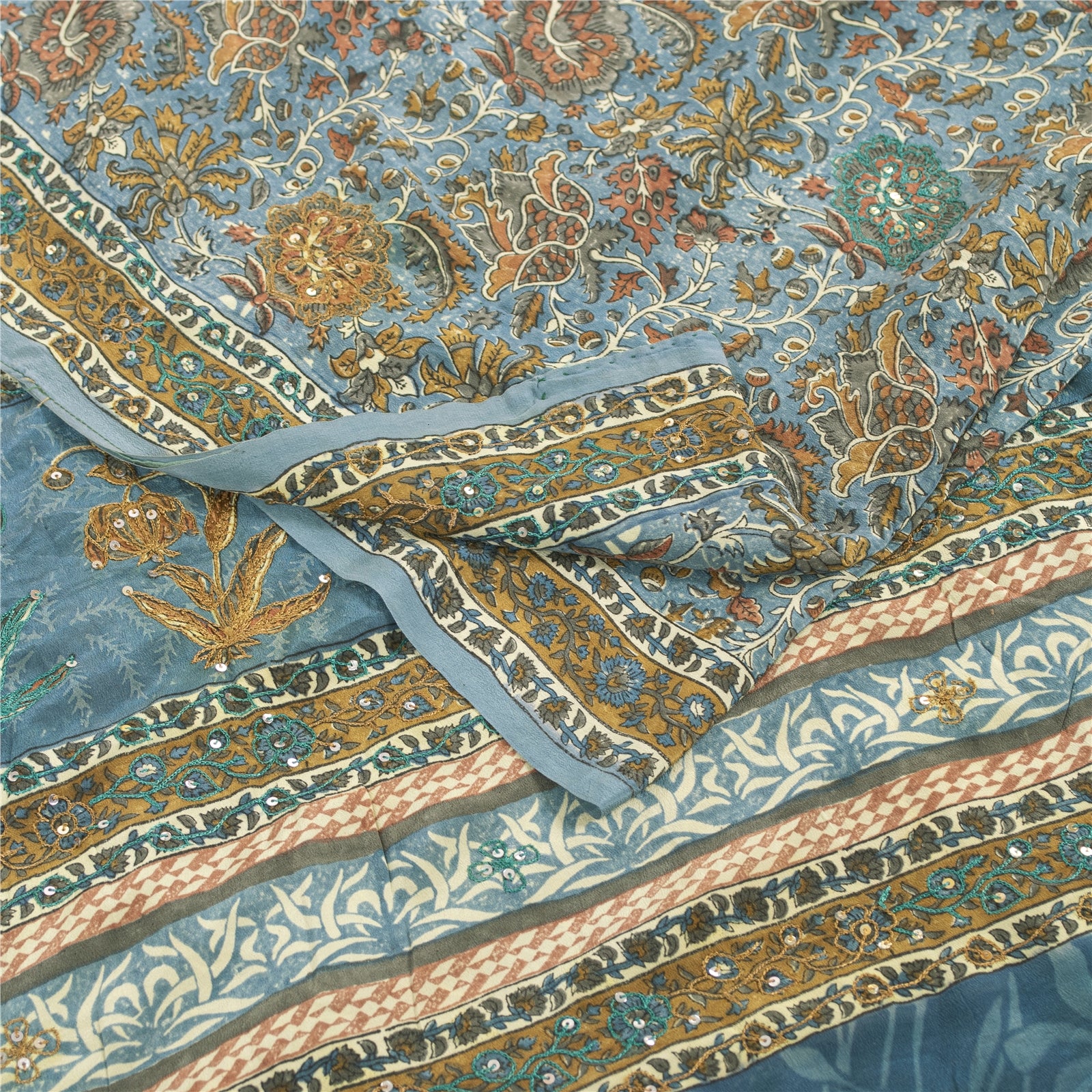 THE ITEM COLOR OR SHADE MAY BE DARKER OR LIGHTER THAN THE PICTURE.' • Beautiful blue colored printed & embroidered pure crepe silk saree . • Pallu & Border has printed floral design with thread & sequins work. • Similar design in center part of sari . This unique vintage saree can be used for various crafting ideas even if you don't want to use it as a sari. Design a dress, use it as a as window dressing, upholstery, sarongs, throw, dress making and table linen much more. Let your creative juices flow and use this decorated fabric in multiple fashion. International buyers please note: Import duties, taxes, and charges are not included in the item price or postage cost. These charges are the buyer's responsibility. Please check with your country's customs office to determine what these additional costs will be prior to bidding or buying.Buyer will pay custom duty/tax. It is calculated and charged differently by every country. As a seller I do not have any control over it. VAT or sales tax is calculated by the platform at the time of checkout. Customs charge is payable at the time of delivery. PRC-23931