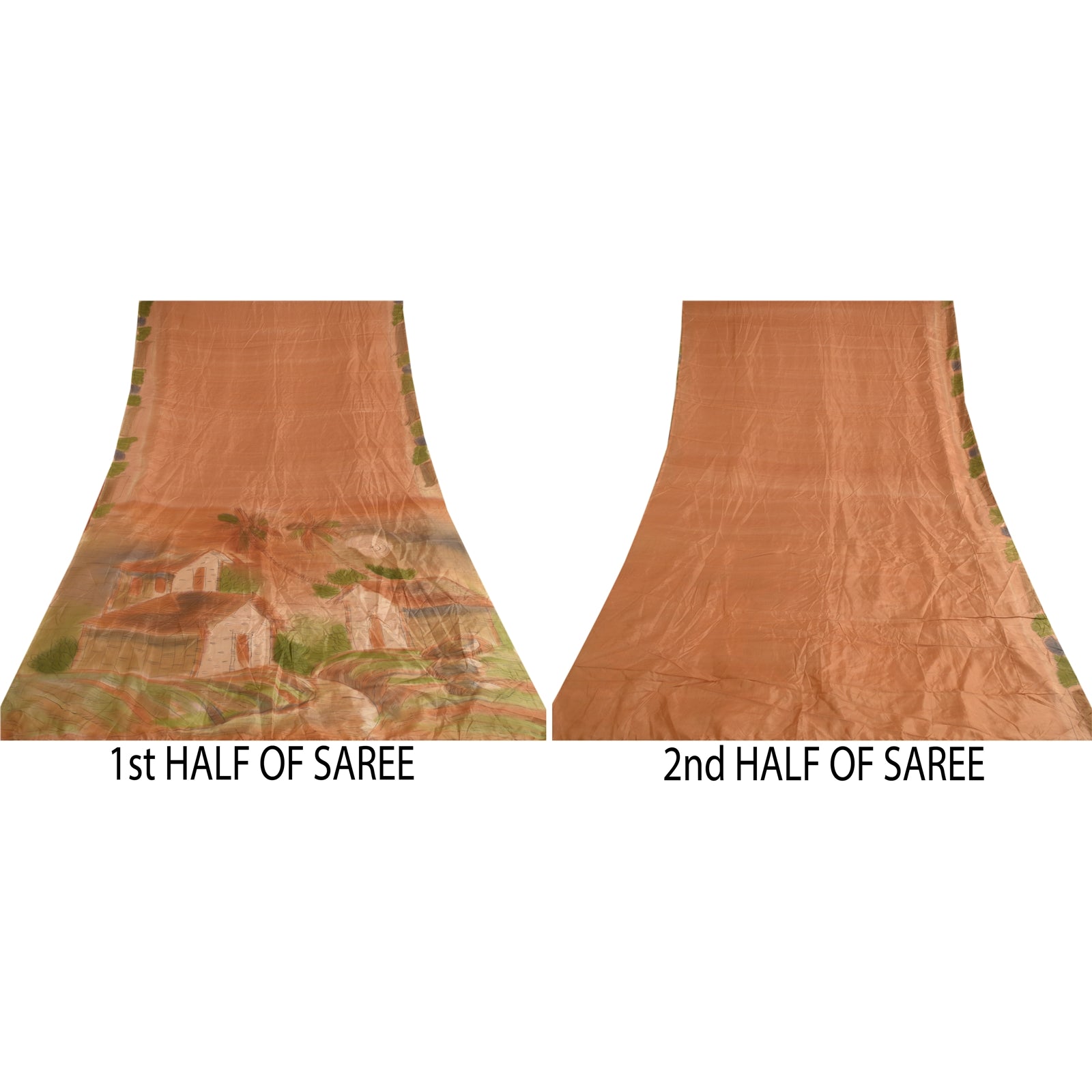 Sanskriti Vintage Sarees Brown Scenery Printed 100% Pure Silk Sari Craft Sustainable Fabric