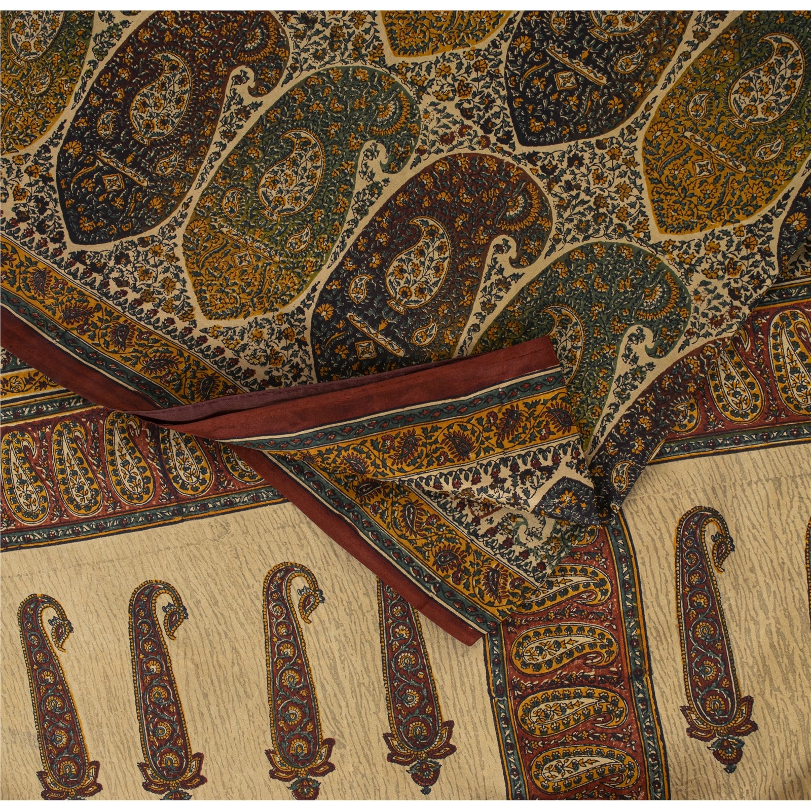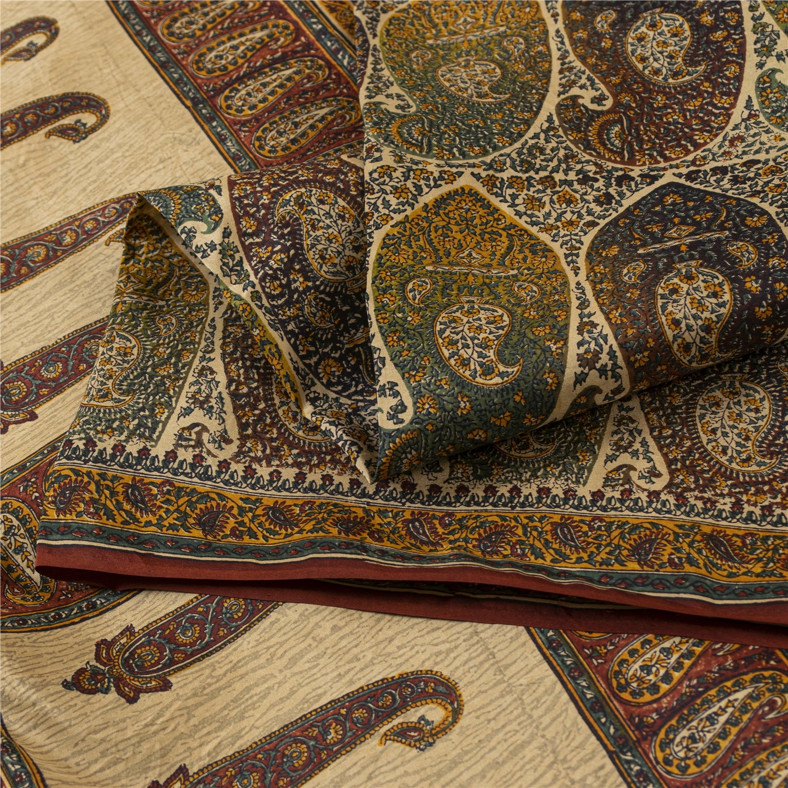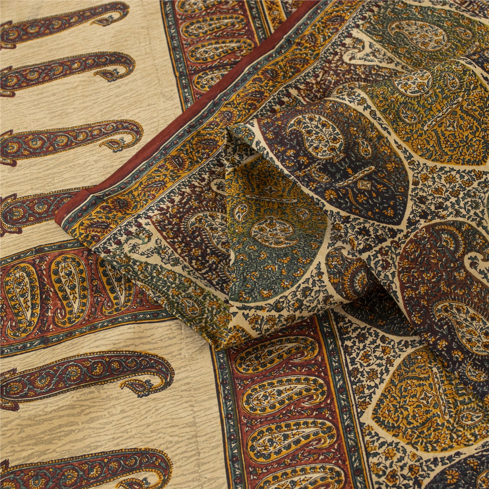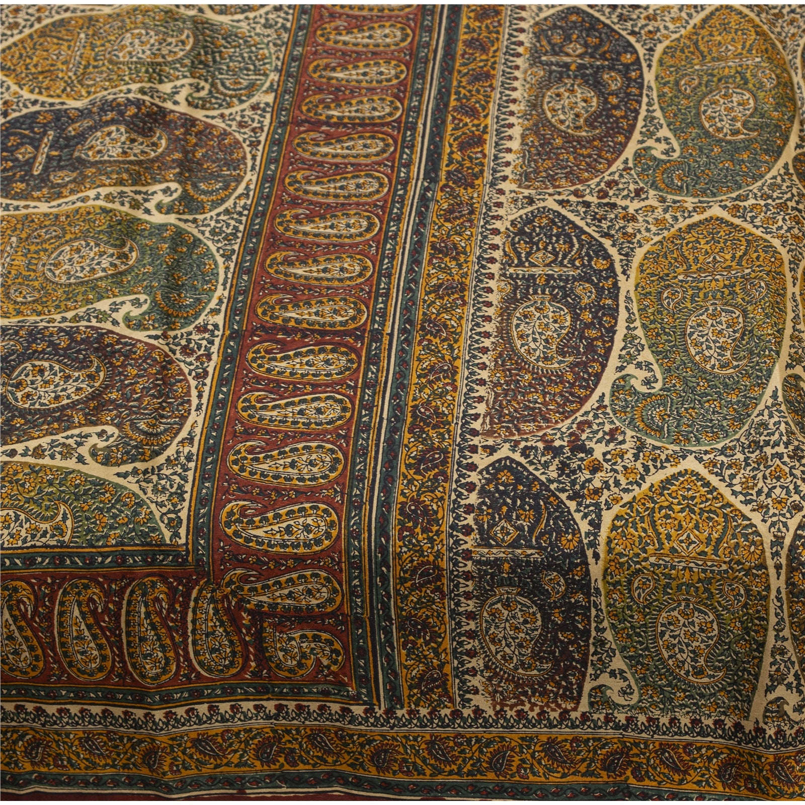 Sanskriti Vintage Sarees Cream Pure Silk Paisley Printed Sari 5+yd Craft Fabric
