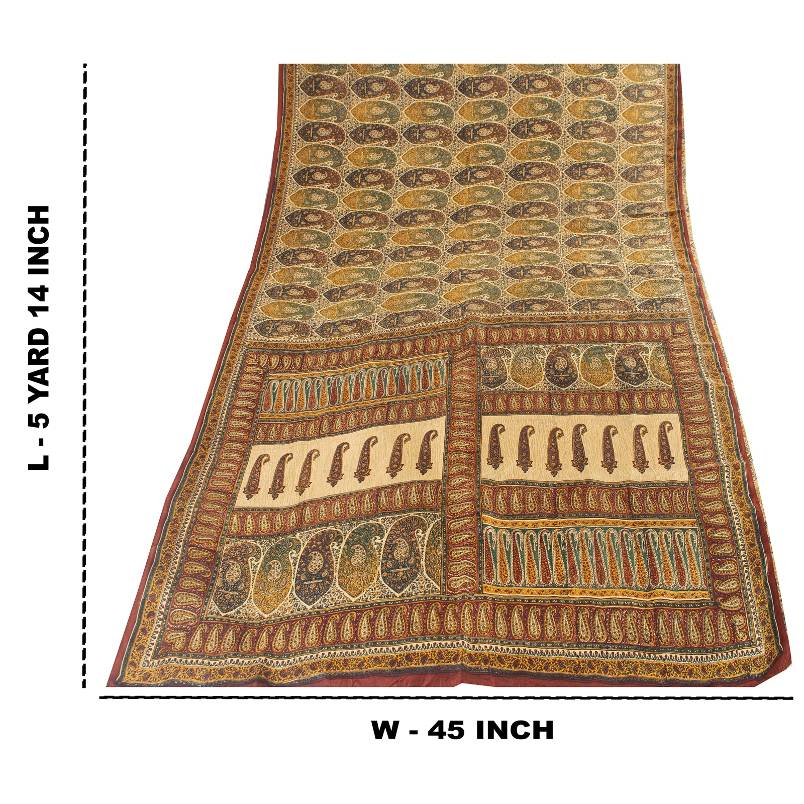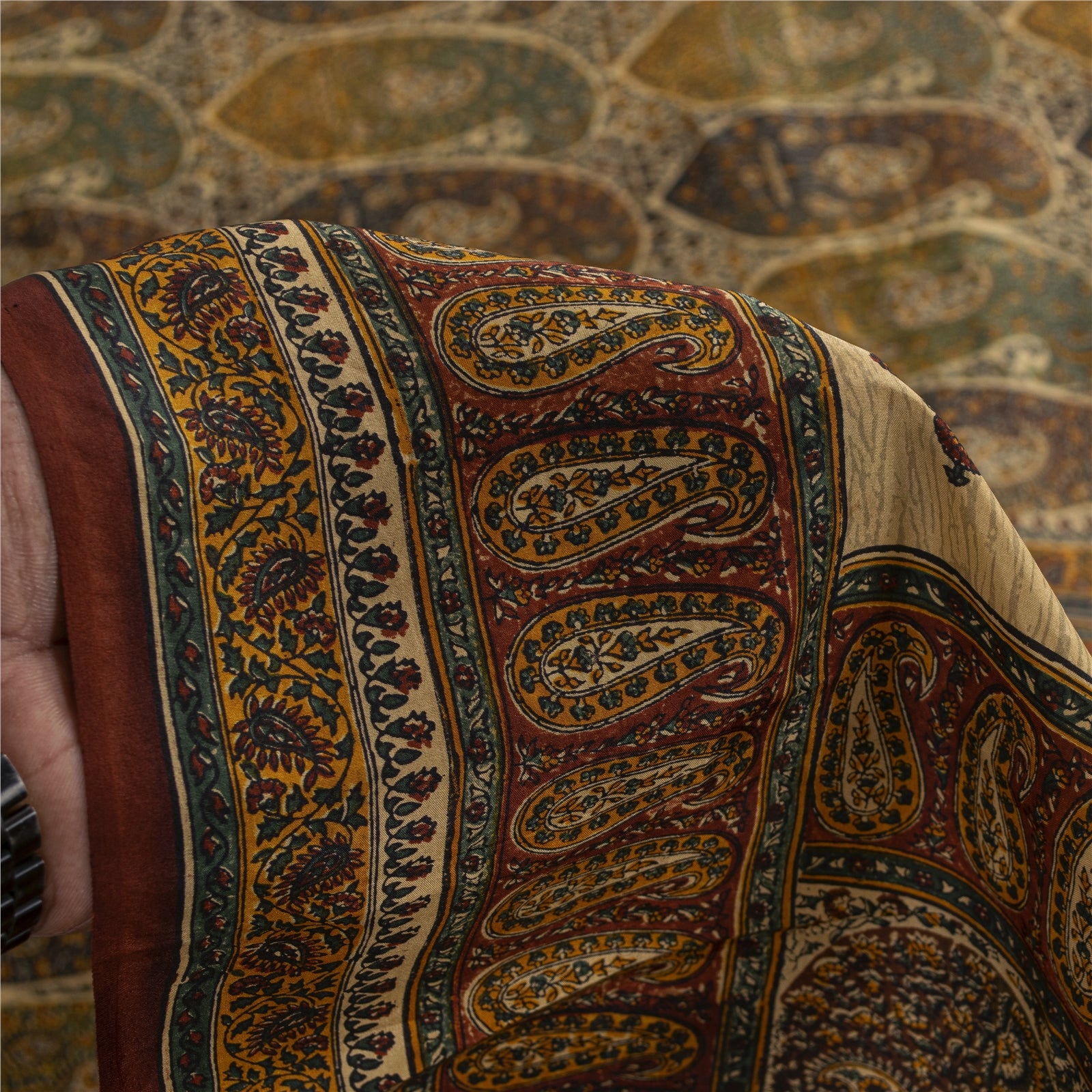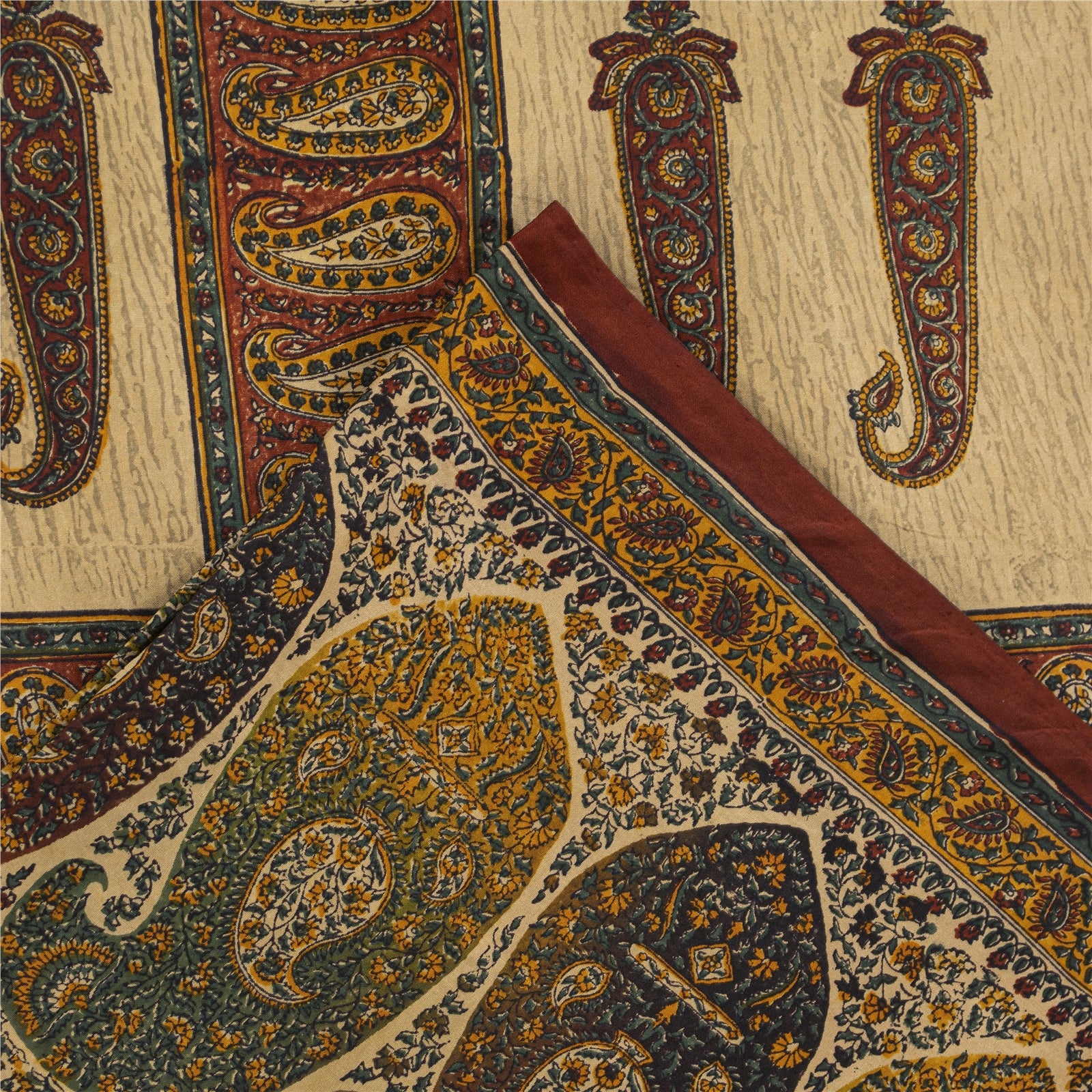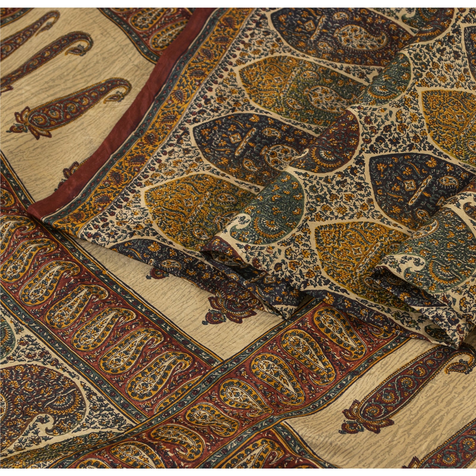 Sanskriti Vintage Sarees Cream Pure Silk Paisley Printed Sari 5+yd Craft Fabric