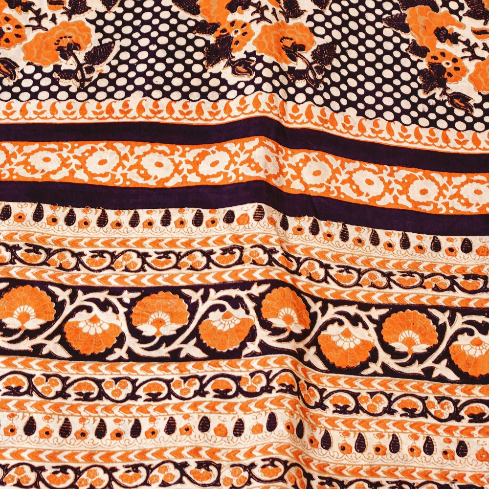 Beautiful cream & orange colored pure silk printed saree. Pallu & Border has printed floral design. Similar design in center part of saree. What is special about this saree? Fabulous design is really enhancing the beauty of the saree.This unique vintage saree can be used for various crafting ideas even if you don't want to use it as a sari. Design a dress, use it as window,dressing, upholstery, sarongs, throw, dress making and table linen much more. Let your creative juices flow and use this decorated Sustainable Fabric in multiple fashion.