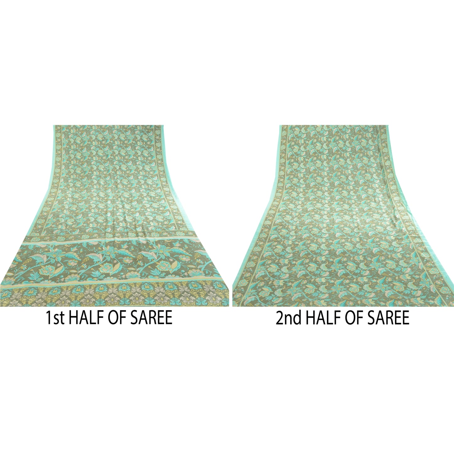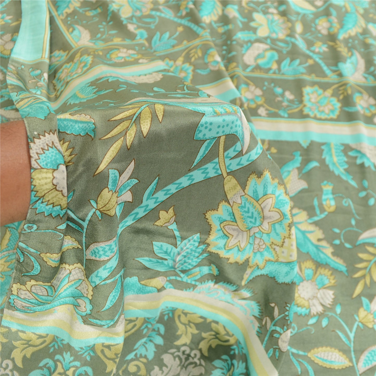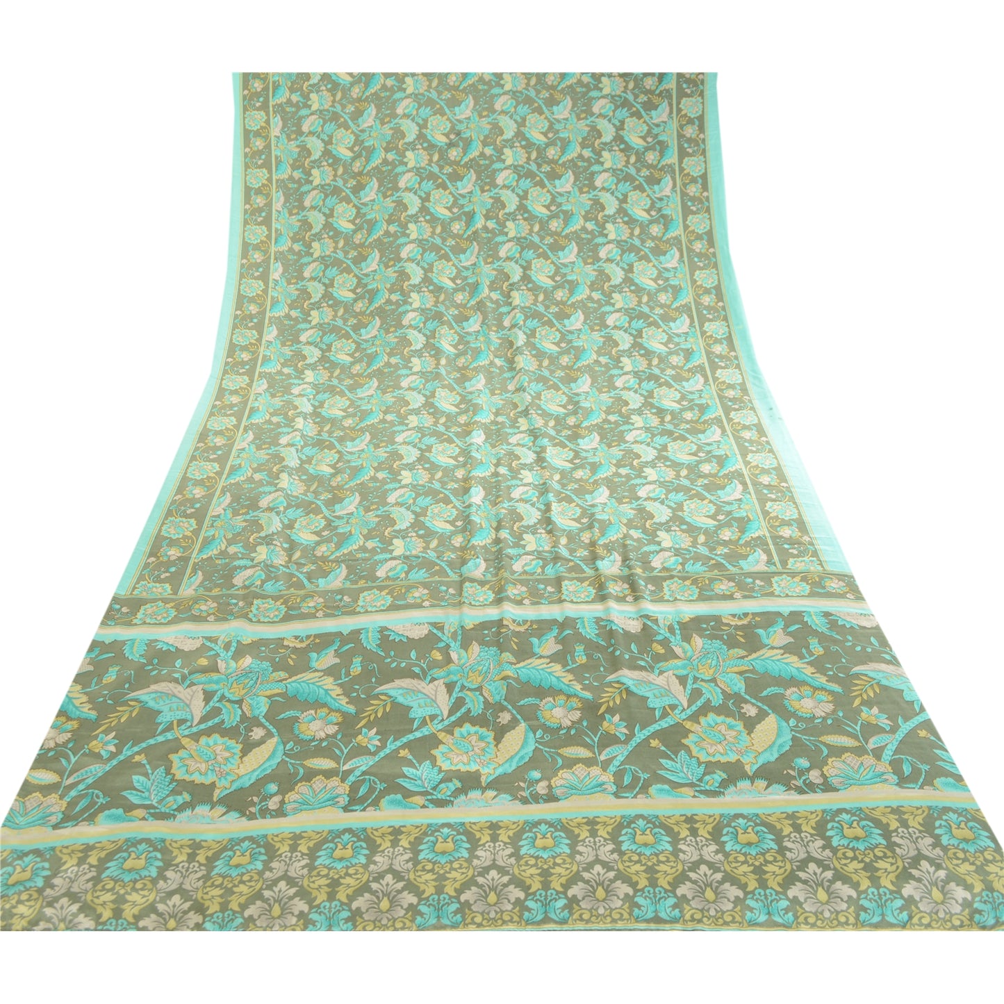 Sanskriti Vintage Sarees From India Green Moss Crepe Sari Printed Craft Sustainable Fabric