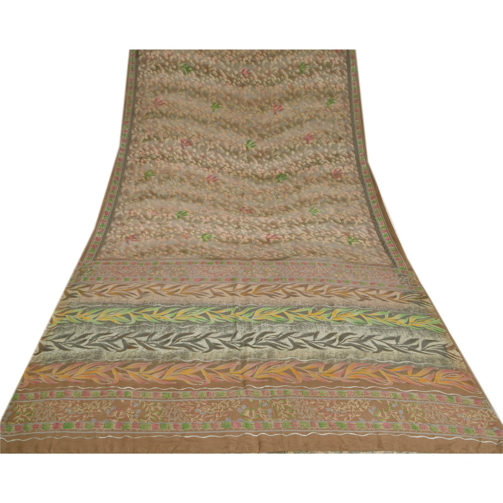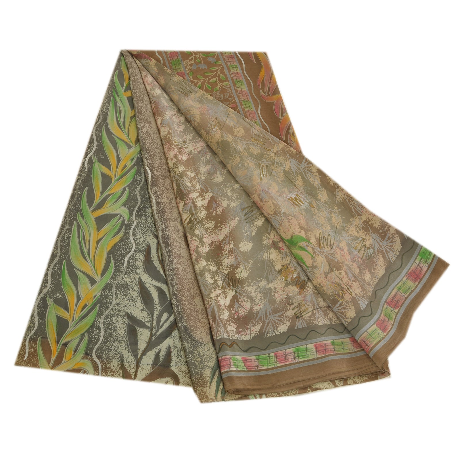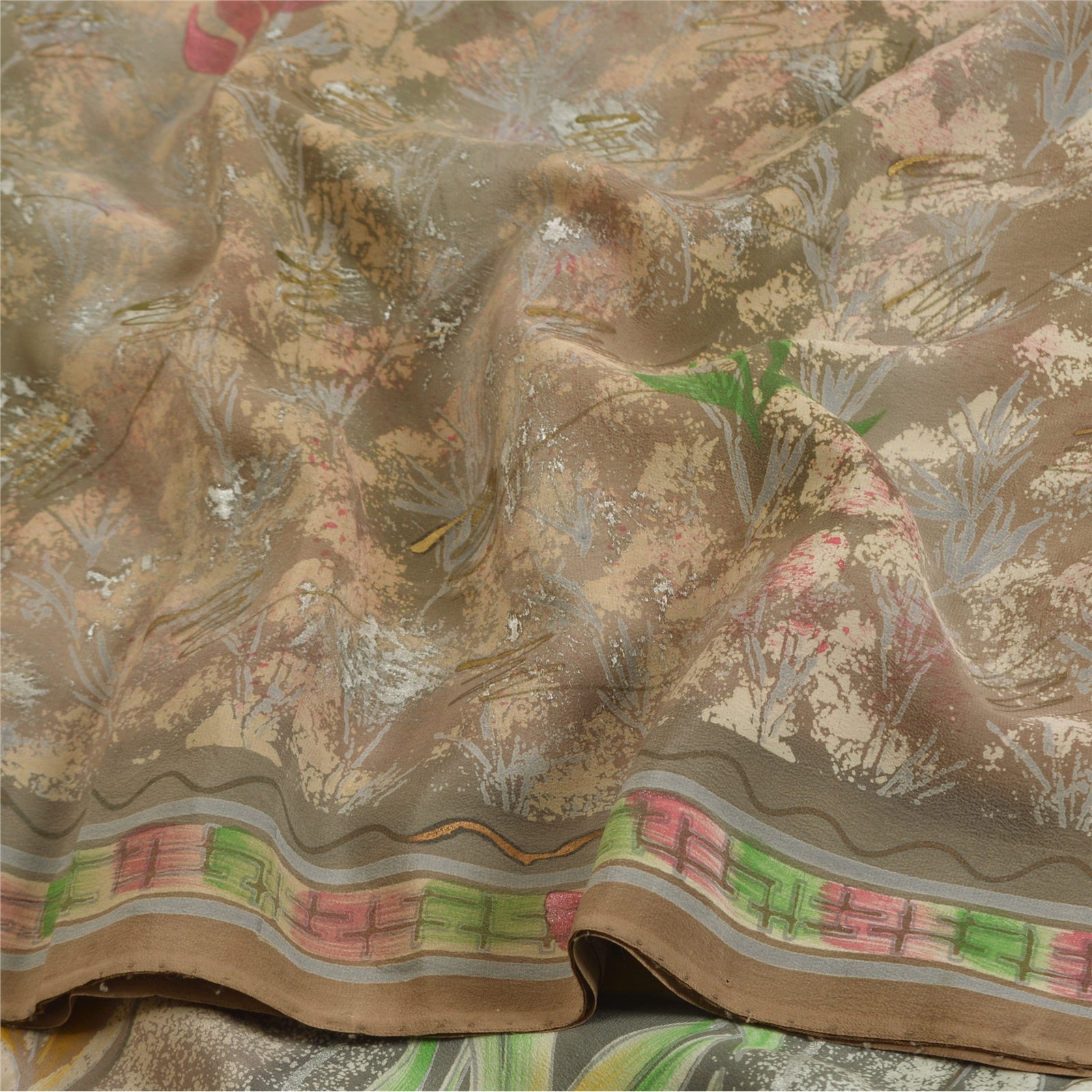 Sanskriti Vintage Sarees Gray Indian Printed Pure Crepe Silk Sari Craft Sustainable Fabric