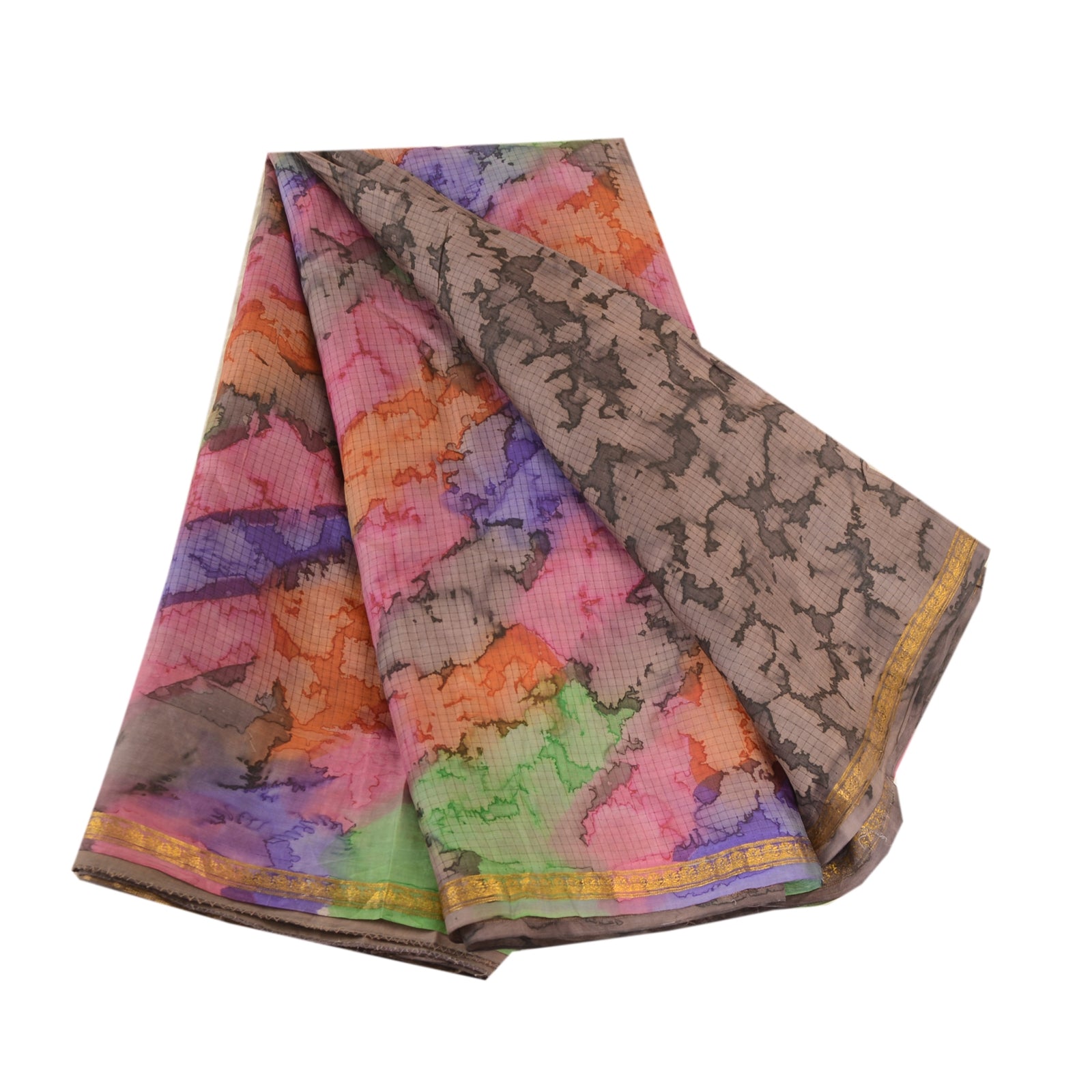 Sanskriti Vintage Sarees Gray Pure Silk Zari Border Printed Sari Craft Sustainable Fabric